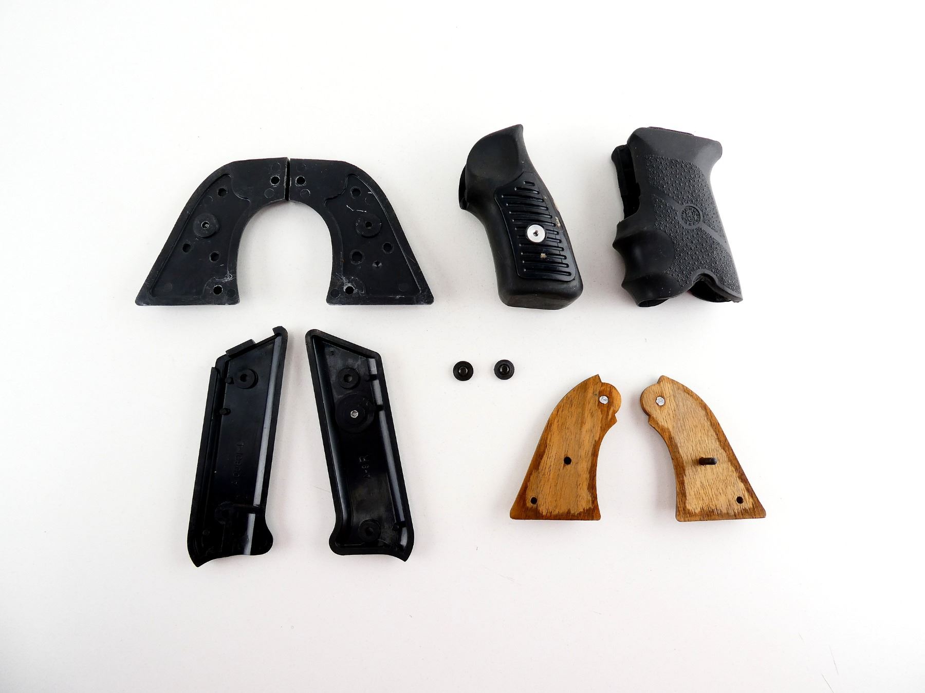 LOT INCLUDES; (1) P-89 MONO GRIP, CHECKERED BLACK RUBBER, WITH SCREWS, (1) SP 101 MONO GRIP, GROOVED BLACK RUBBER, WITH SCREW, (1) SET OF BEARCAT SMOOTH WOOD GRIPS, WITH SCREW, (1) SET OF VAQUERO CHECKERED BLACK POLYMER GRIPS, NO SCREW & (1) SET OF MKII CHECKERED BLACK POLYMER GRIPS, NO SCREW. MAY REQUIRE FITTING. SEE PHOTOS.