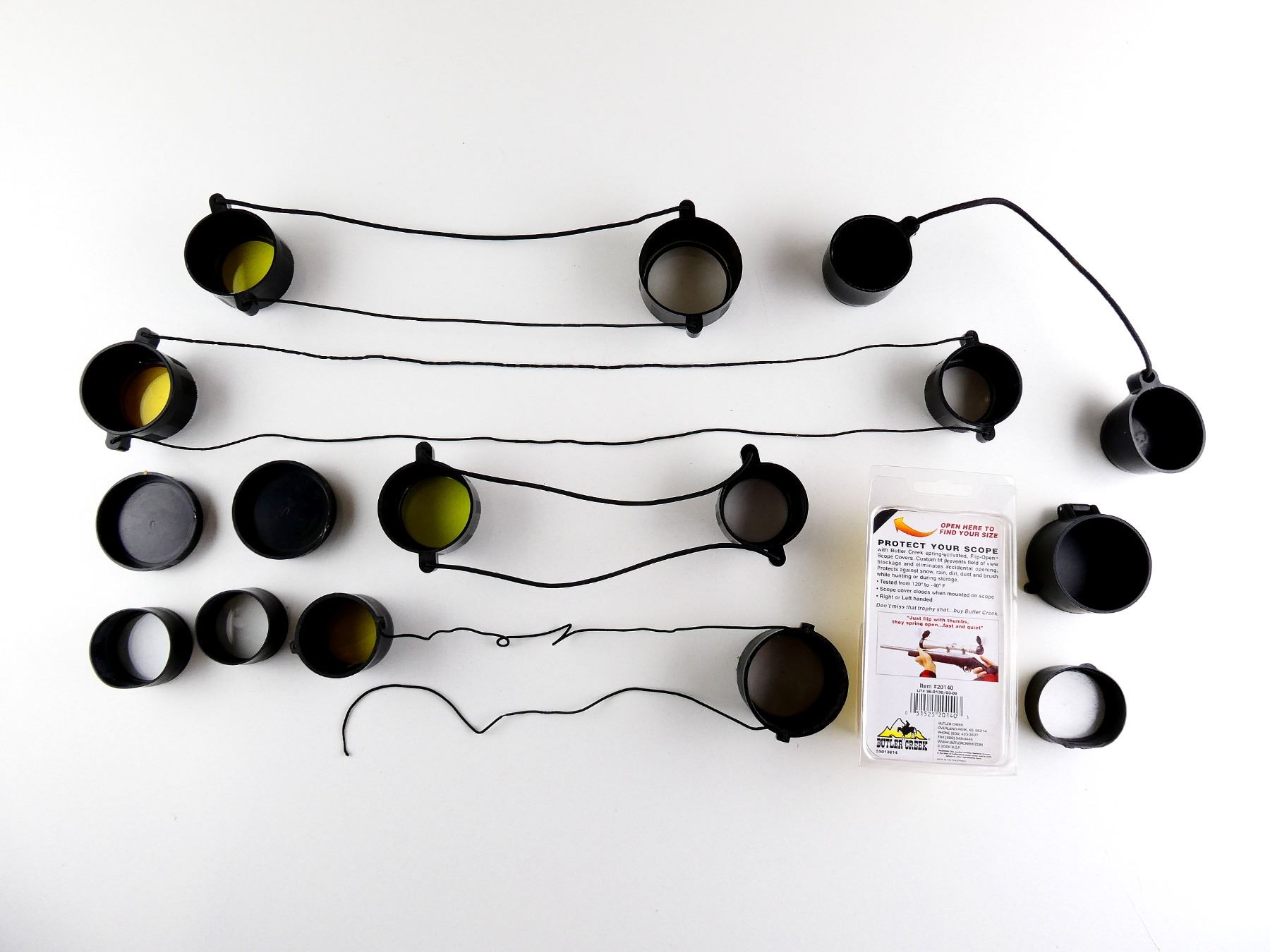 LOT INCLUDES; (5) BIKINI STYLE LENS COVER, VARIOUS SIZES & (1) BUTLER CREEK FLIP UP LENS COVER, 1.764", IN ORIGINAL PACKAGING, ETC. SEE PHOTOS.