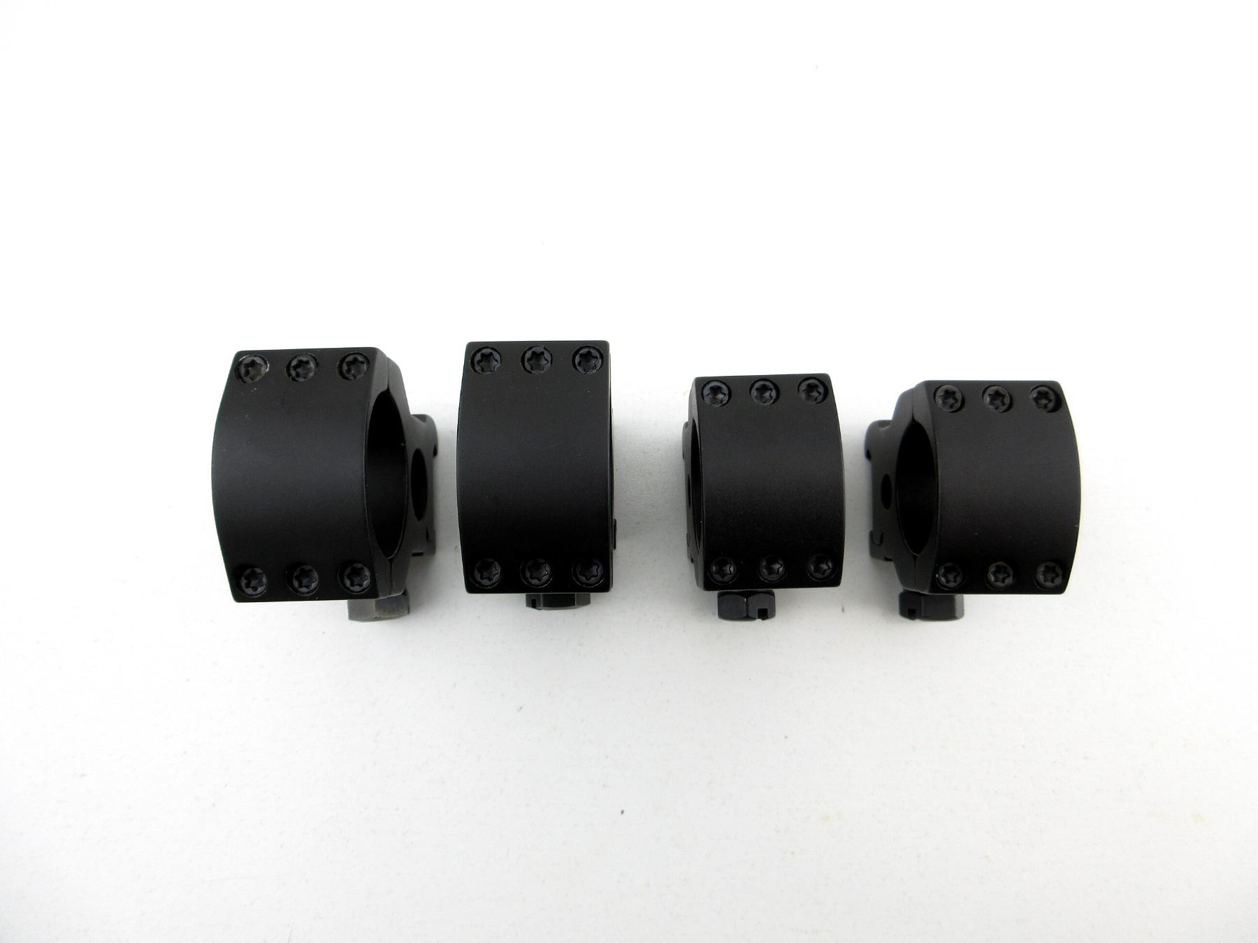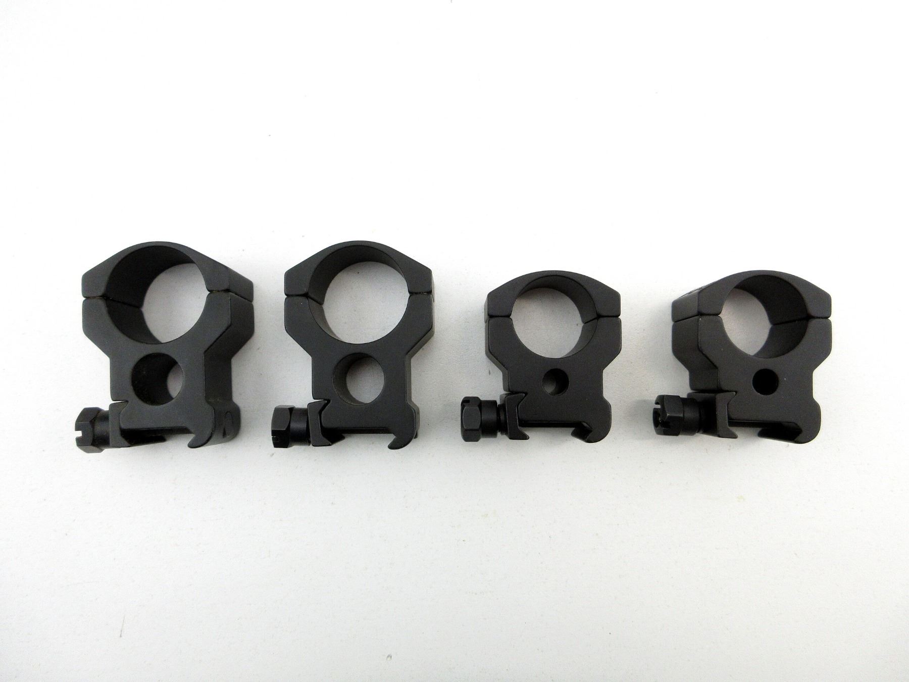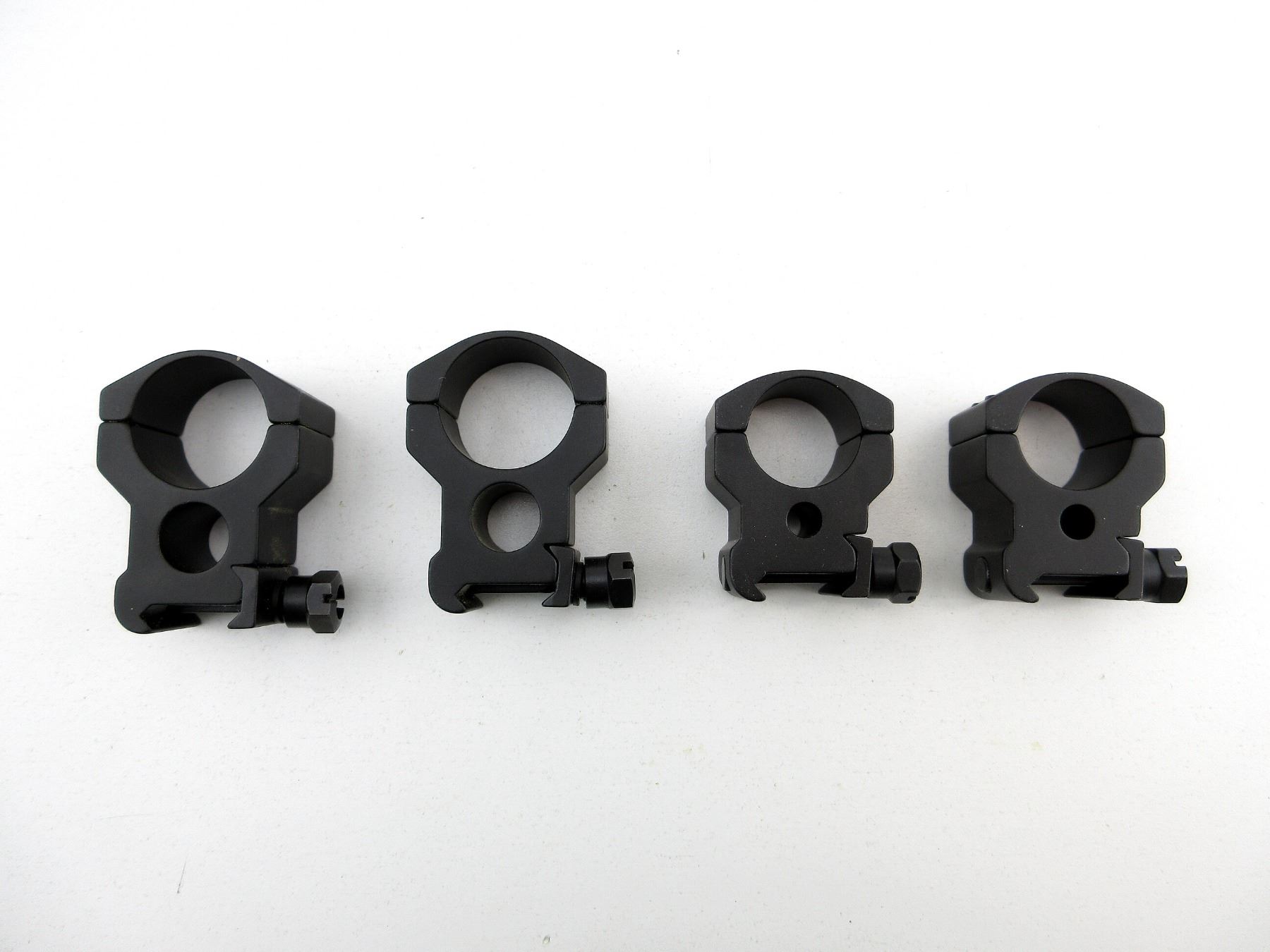 LOT INCLUDES; (1) PAIR OF SCOPE RINGS, 1" DIAMETER, BLACK PAINTED STEEL, UNMARKED, OAL APPROX. 2.5" & (1) PAIR OF SCOPE RINGS, 30MM DIAMETER, BLACK PAINTED STEEL, UNMARKED, OAL APPROX. 2". SEE PHOTOS.