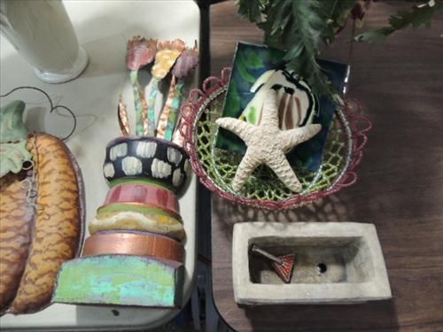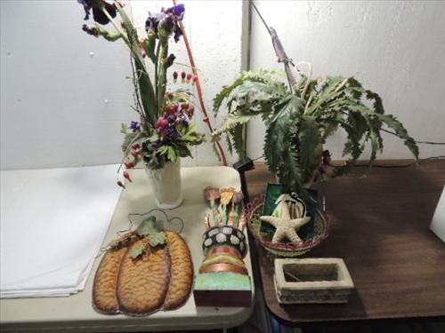 ASSORTED SELECTION OF DEECORATIVE ITEMS: SILK PLANTS, CERAMIC TILE, STAR FISH, VASES AND MORE. AS SHOWN. VIEW PICTURE FOR DETAIL.