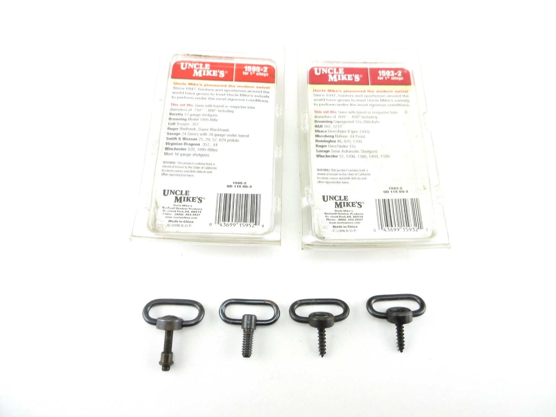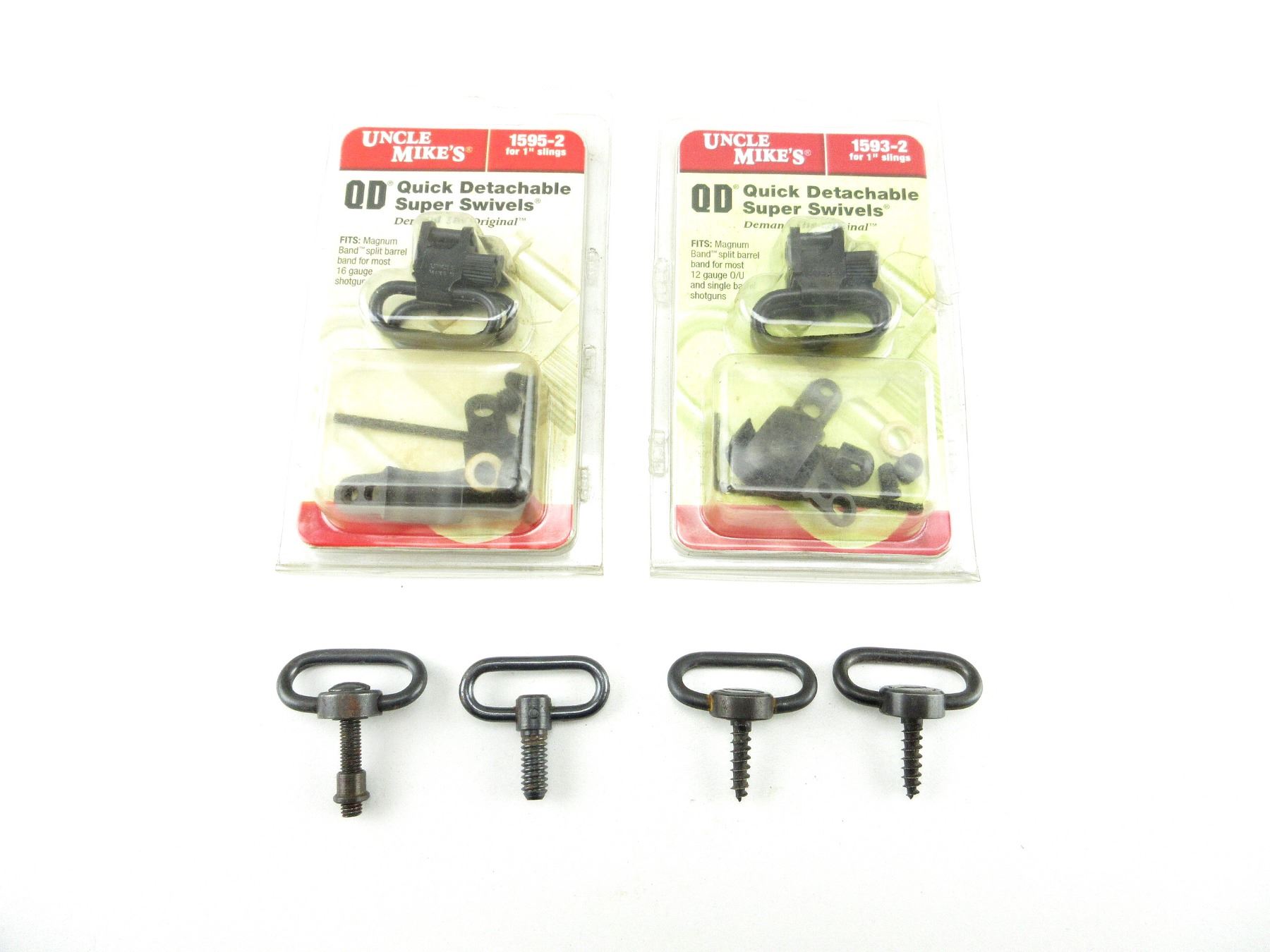 LOT INCLUDES; (1) SET UNCLE MIKE'S QD 1" SUPER SWIVELS, FITS 12 G. SHOT GUNS, PART #: 1593-2, APPEARS NEW OLD STOCK IN ORIGINAL PACKAGING, (1) SET UNCLE MIKE'S QD 1" SUPER SWIVELS, FITS 16 G. SHOT GUNS, PART #: 1595-2, APPEARS NEW OLD STOCK IN ORIGINAL PACKAGING, (2) SETS OF UNKNOWN SLING SWIVELS. MAY REQUIRE FITTING. SEE PHOTOS.