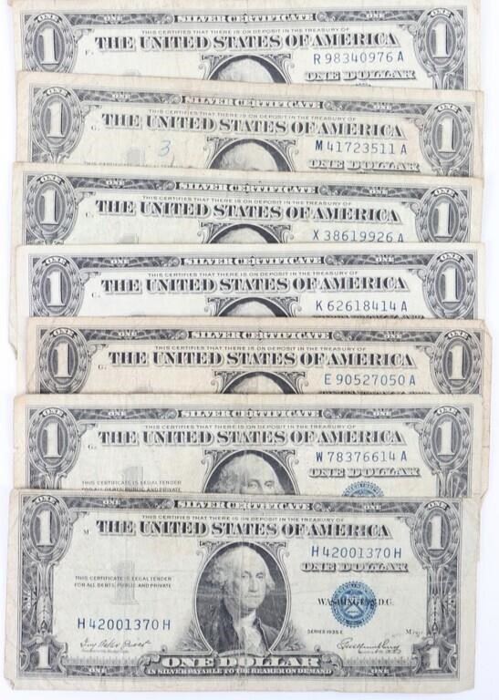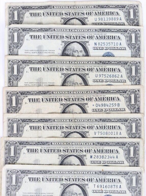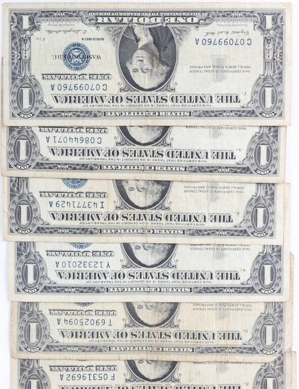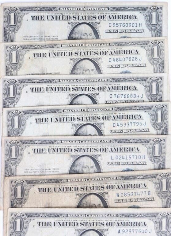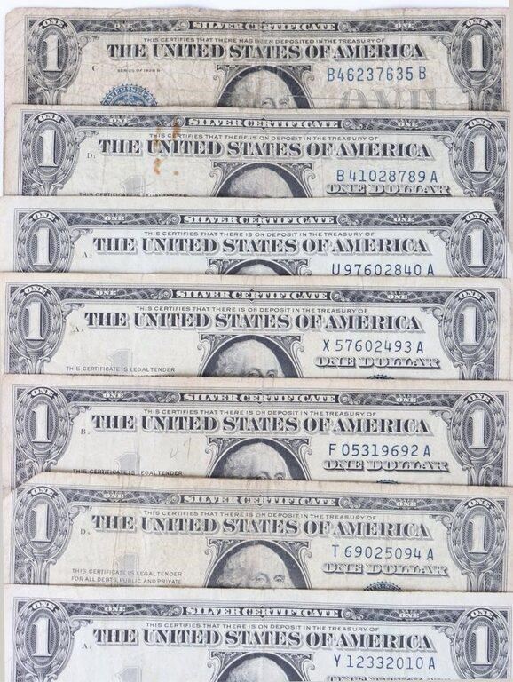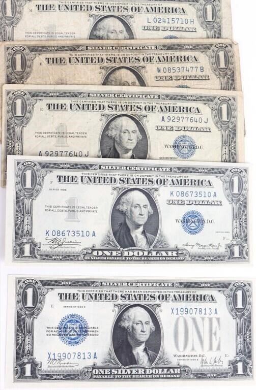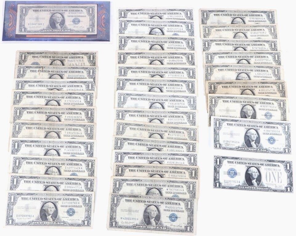 Assorted silver certificate $1 Washington bills to include: two 1928 series Washington $1 bills, ten 1935 series Washington $1 bills, and twenty-two 1957 series Washington $1 bills. All of them are silver certificate bills.