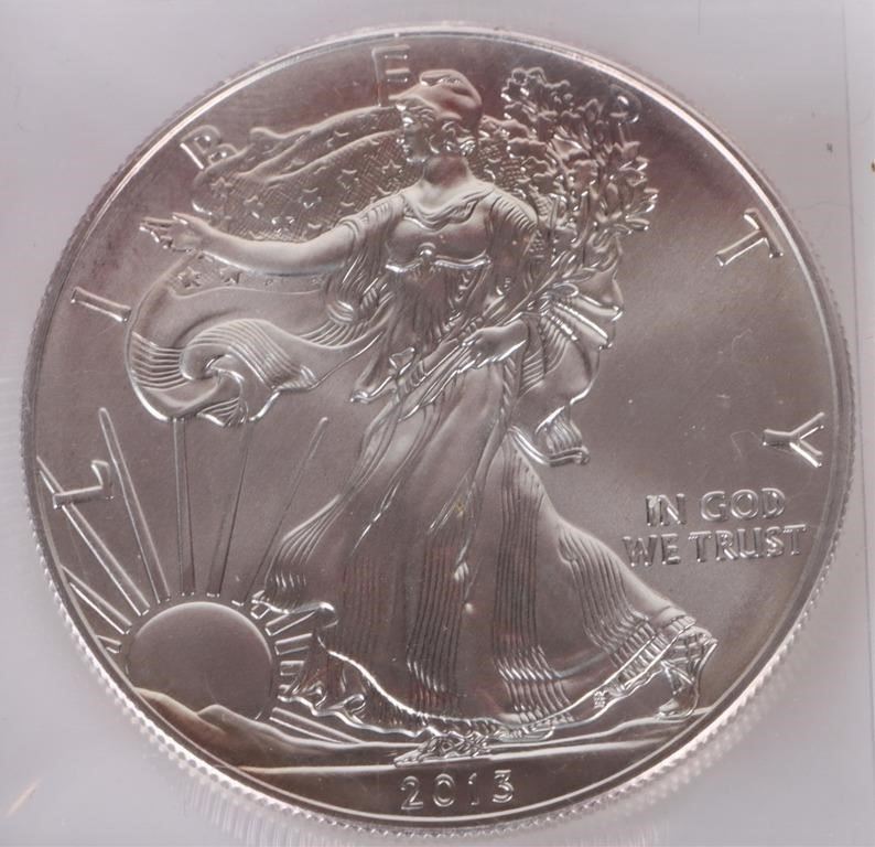 Assorted silver U.S. bullion/ coinage to include one 0.9 silver 1923 S XF Liberty Peace Dollar, one 0.999 silver 1996 MS Silver Eagle bullion, and two 0.999 silver 2013 MS Silver Eagle bullion, one with a slight rainbow tone.