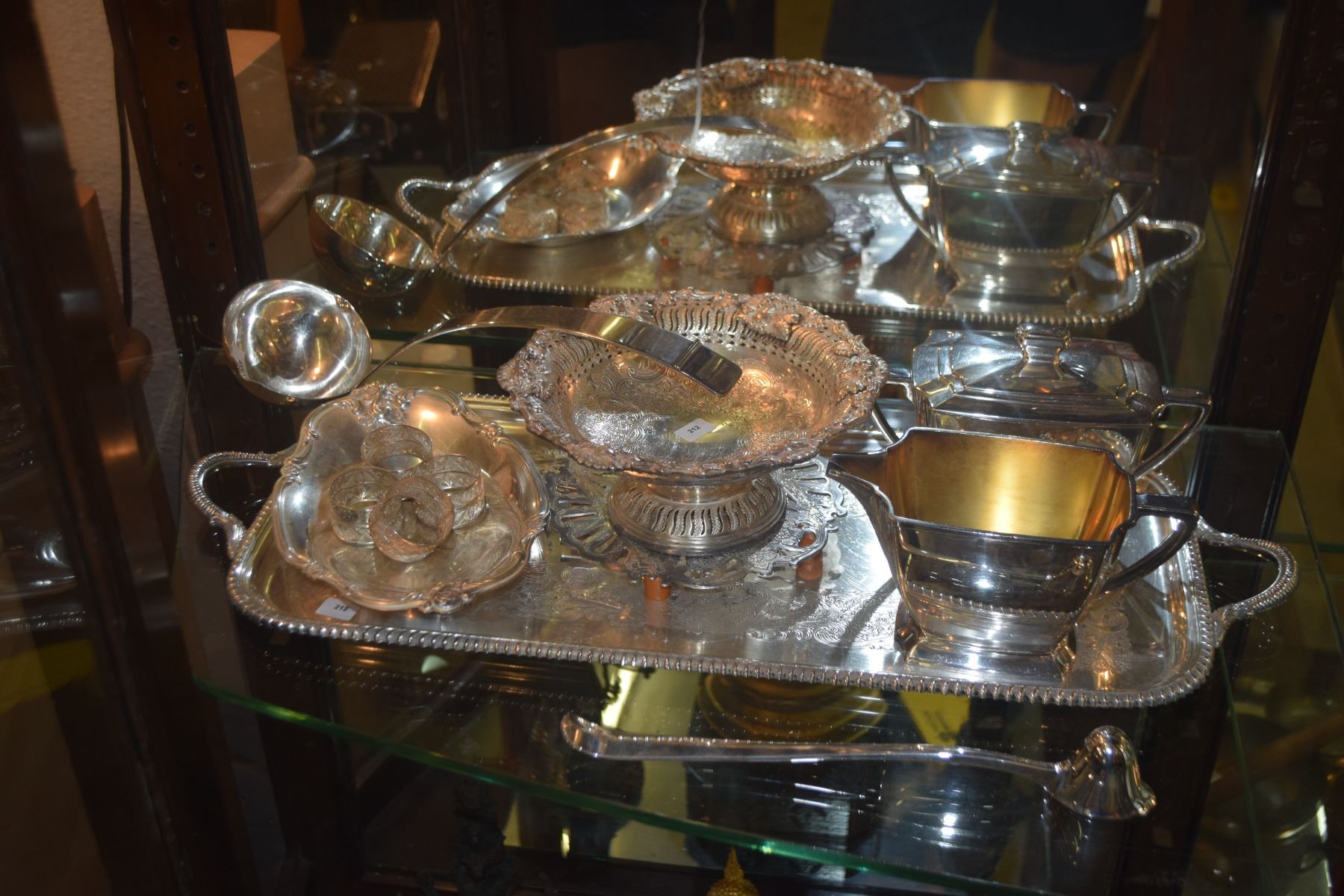 ASSORTED SILVERPLATE SERVING PIECES: TRAY, CREAM & SUGAR, LADLE, TRIVET, BOWLS, CANDLE SNUFFER & NAP