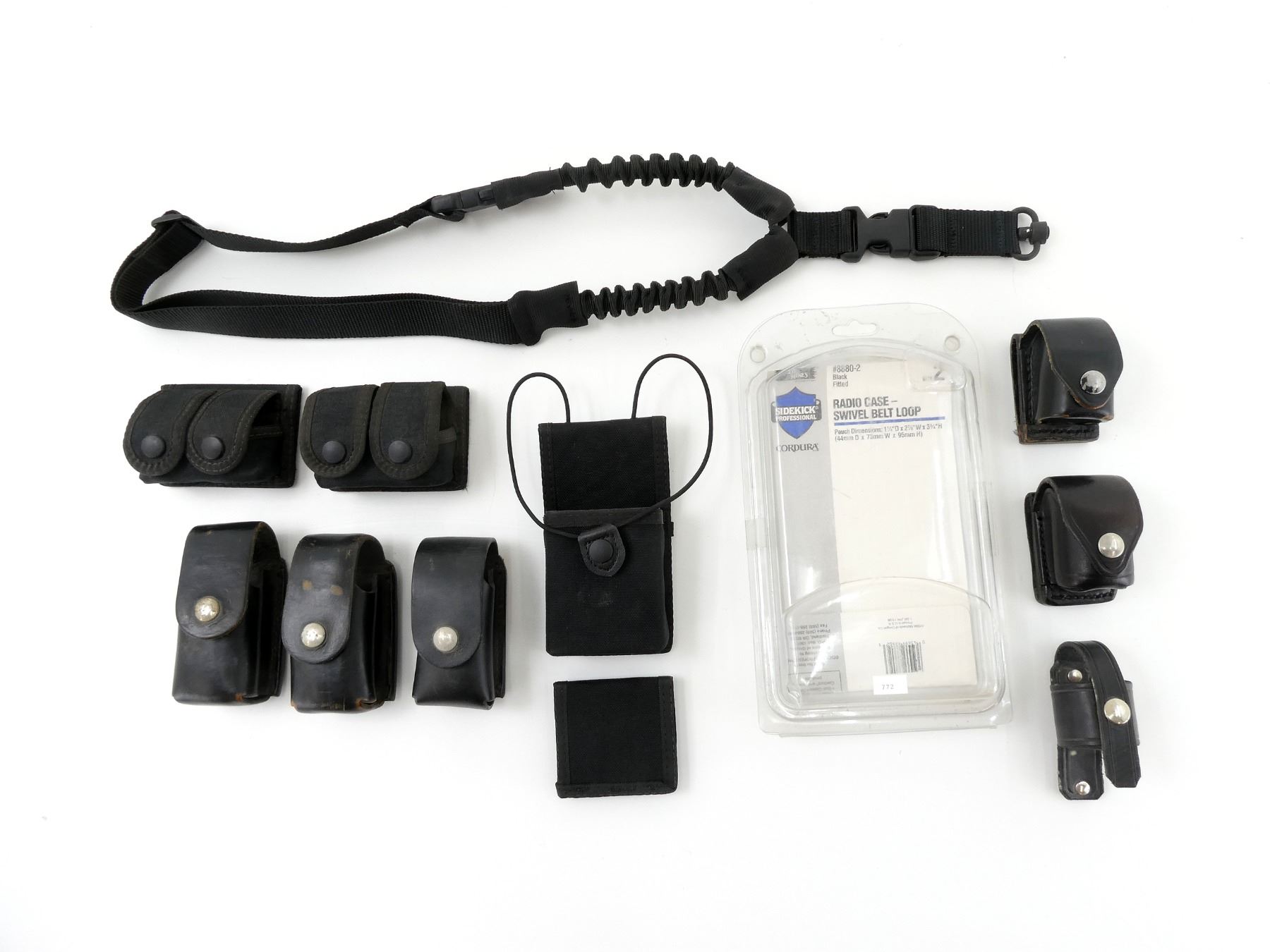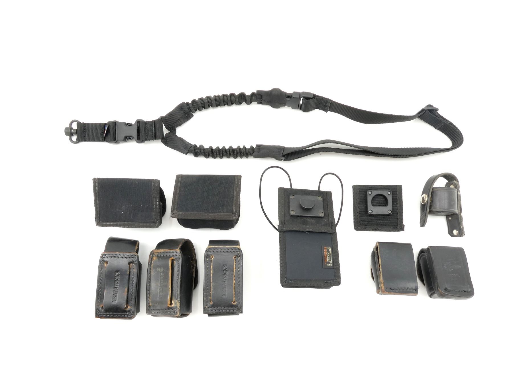 LOT INCLUDES; (1) GROVTEC SLING, BLACK NYLON CONSTRUCTION, RECOIL-STYLE STRAPS, WITH SLING SWIVEL, OVERALL LENGTH APPROX. 26", ADJUSTABLE, (1) UNCLE MIKE'S RADIO CASE - SWIVEL BELT LOOP, BLACK NYLON CONSTRUCTION, SIZE 2, ITEM #: 8880-2, SHOWS LIGHT WEAR & TEAR / USE MARKS, IN ORIGINAL PACKAGING, (3) KIRKPATRICK'S MAG POUCHES, BLACK LEATHER CONSTRUCTION, MARKED "KIRKPATRICK'S", OVERALL LENGTH APPROX. 4.5" & (5) ASSORTED SPEED LOADER HOLSTERS, ETC. SEE PHOTOS.