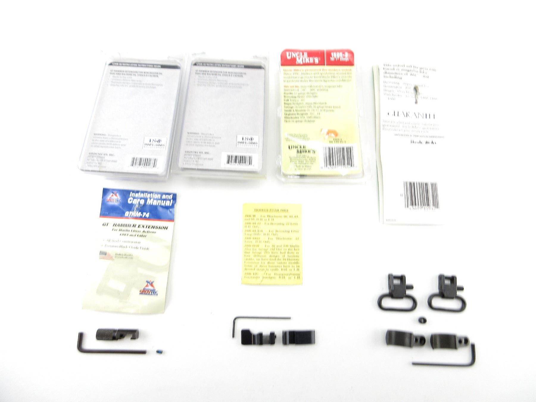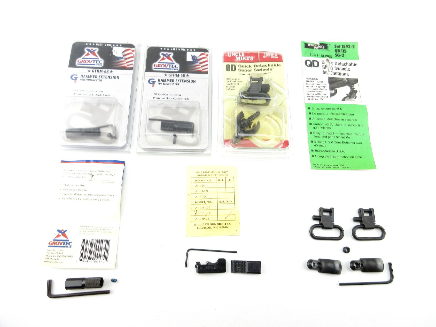 LOT INCLUDES; (1) SET OF UNCLE MIKE'S QD SLING SWIVELS, PART #: 1593-2, MAY NOT BE COMPLETE, (1) SET OF UNCLE MIKE'S QD 1" SLING SWIVELS, PART #: 1595-2, MAY NOT BE COMPLETE, (2) GROVTEC WINCHESTER HAMMER EXTENSIONS, PART #: GTHM-68, APPEARS NEW OLD STOCK IN ORIGINAL SEALED PACKAGING, (1) MARLIN LEVER ACTION HAMMER EXTENSION, MAY NOT BE COMPLETE, (1) WILLIAMS WINCHESTER HAMMER EXTENSION, MAY NOT BE COMPLETE. MAY REQUIRE FITTING. SEE PHOTOS.