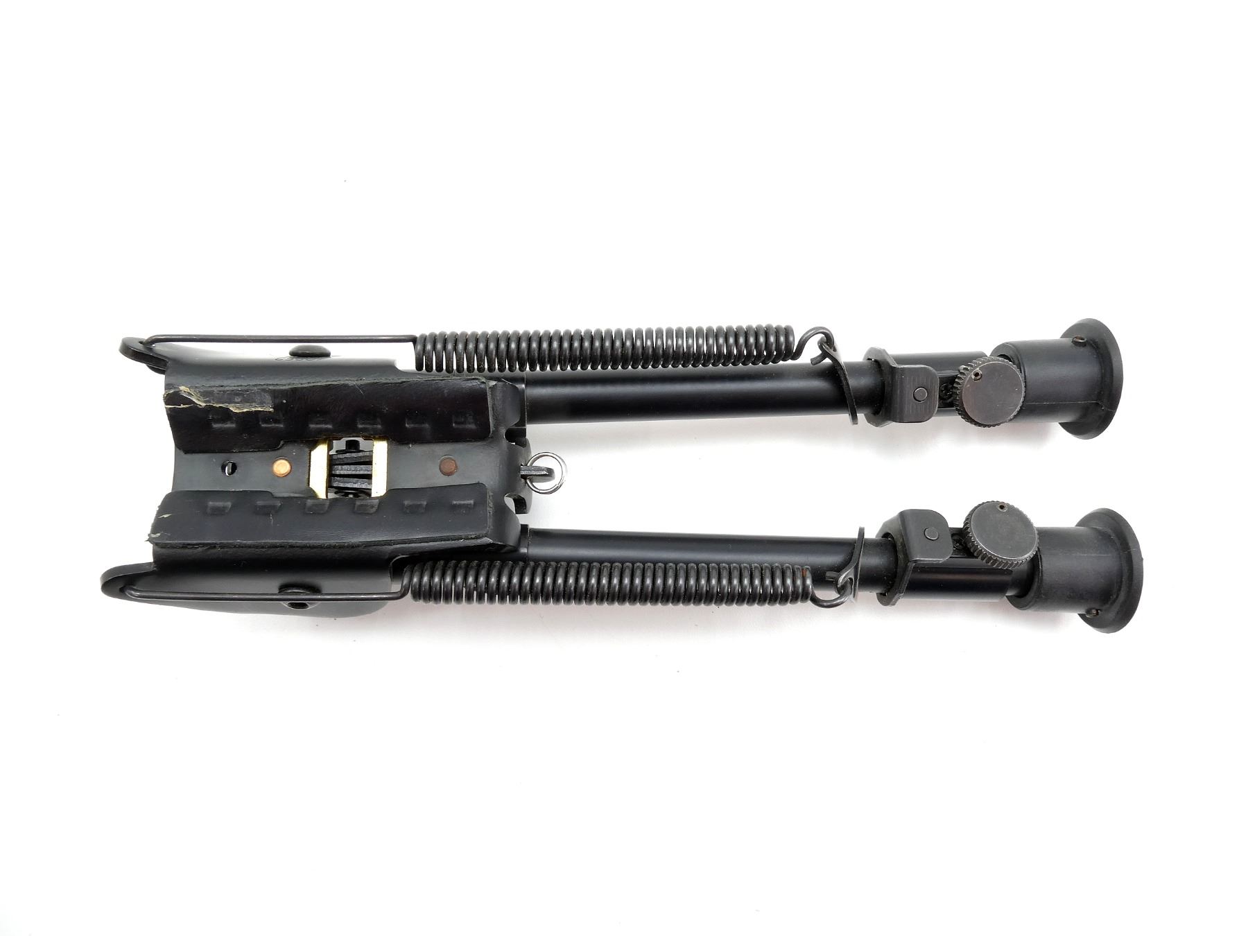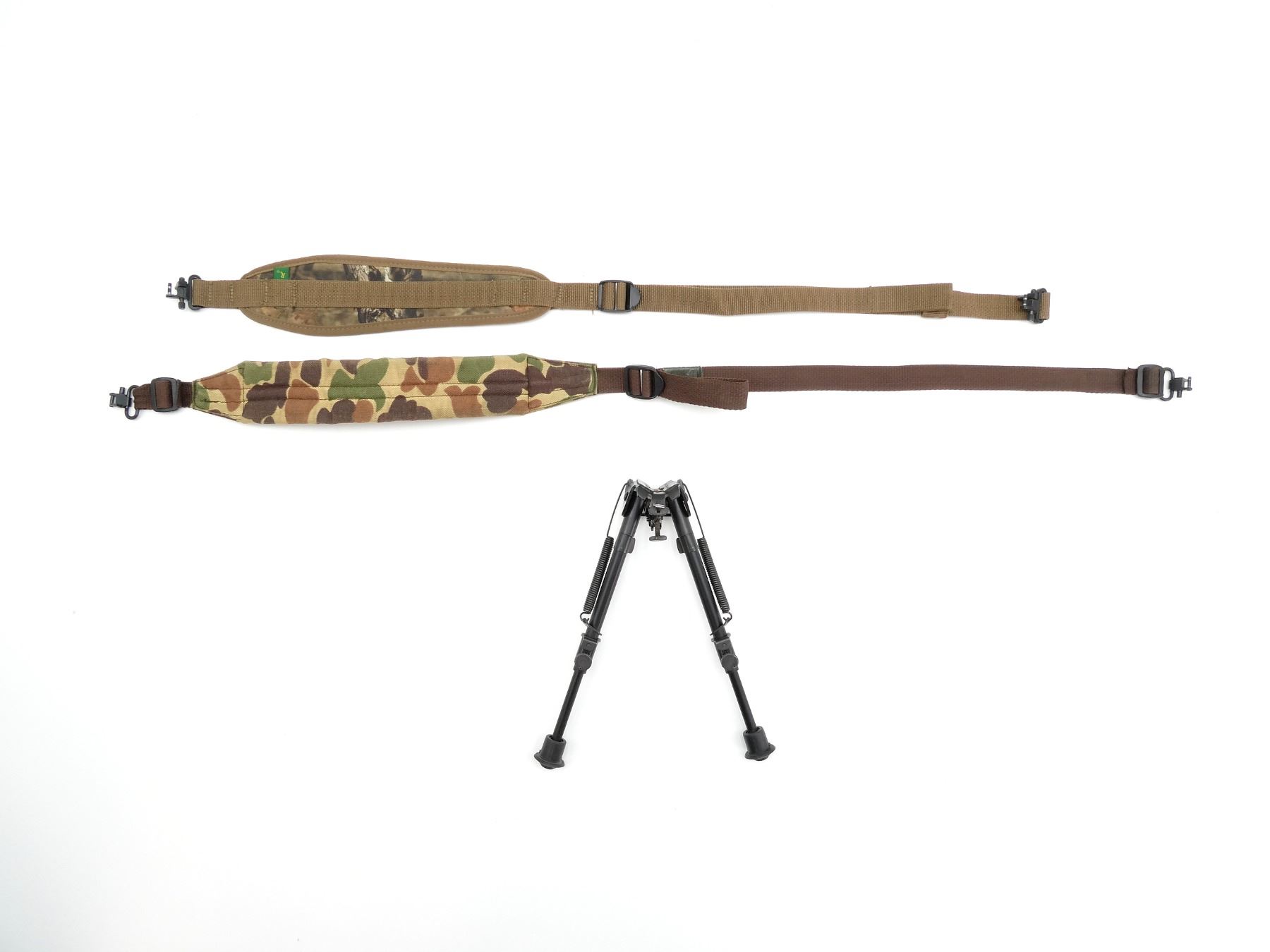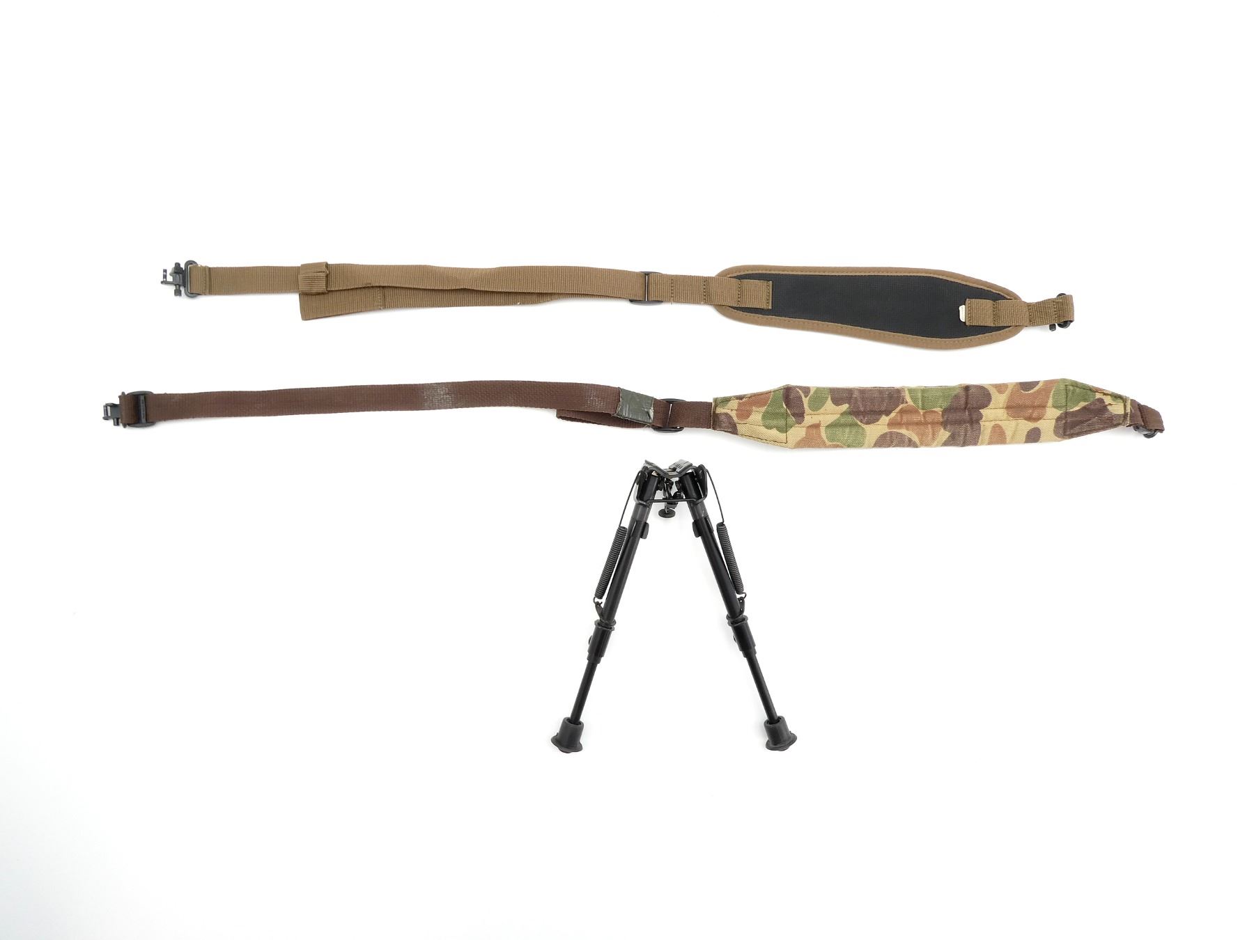 LOT INCLUDES; (1) UNKNOWN BIPOD, ALUMINUM / METAL CONSTRUCTION, BLACK PAINTED, MOUNTS TO SWIVEL STUD & SLING SWIVEL, PLASTIC FEET, ADJUSTABLE LEGS, ADJUSTS FROM 8" TO 13" & (2) BROWN NYLON SLINGS, WITH PADDED CAMO SHOULDER STRAPS, SLING SWIVELS, ADJUSTABLE, OALS APPROX. 33" & 40". SEE PHOTOS.