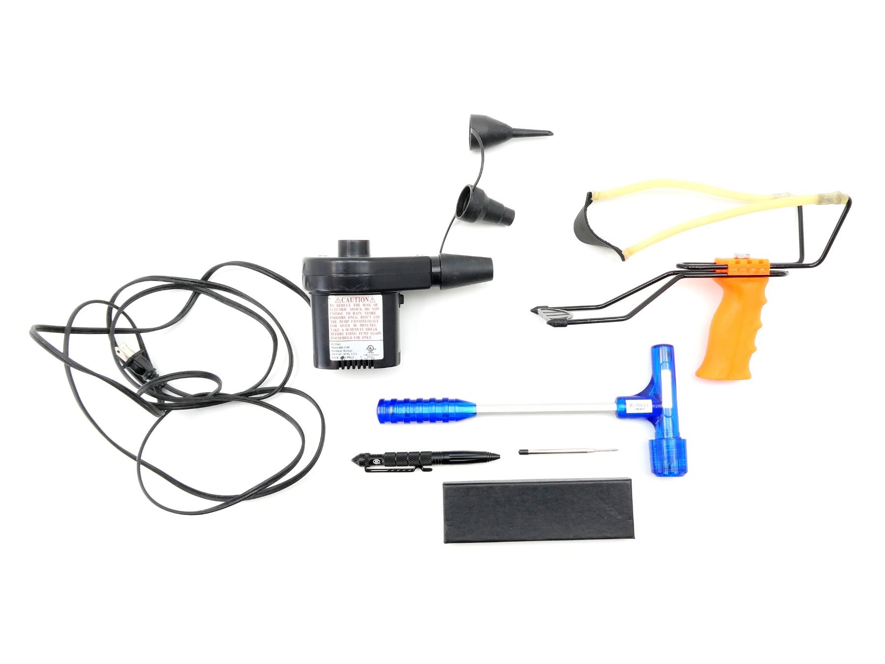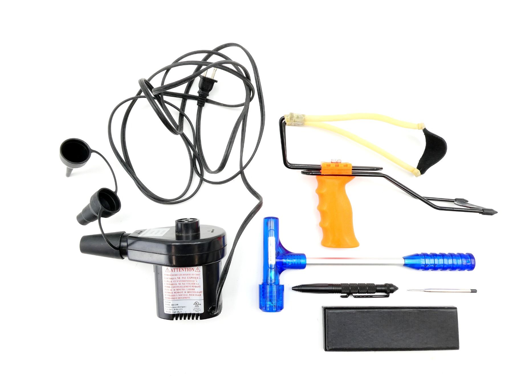 LOT INCLUDES; (1) UNKNOWN SLINGSHOT, (1) FRANKFORD ARSENAL RELOADING TOOL, MARKED "LOT NO. 17/06/16", (1) UNKNOWN ELECTRIC AIR PUMP & (1) PEN & WINDOW BREAKING COMBINATION TOOL, ITEMS UNTESTED. SEE PHOTOS.