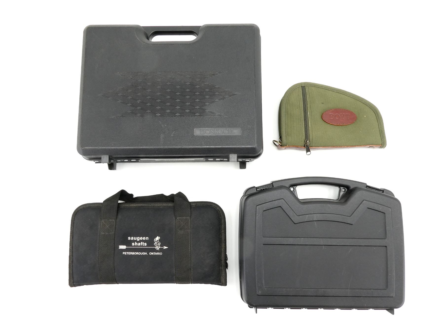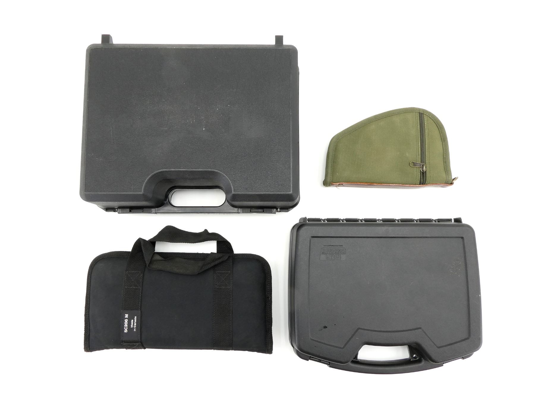 LOT INCLUDES; (2) SOFT PADDED GUN CASES, (1) WITH CARRY HANDLES, (1) WITH OUTSIDE ZIPPERED POCKET, ZIPPERED, (2) HARD PADDED & NONPADDED GUN CASES, CARRY HANDLE, (2) LATCHES, APPROX. OAL 10"-16", SHOWS WEAR AND TEAR FROM USAGE, SEE PHOTOS.
