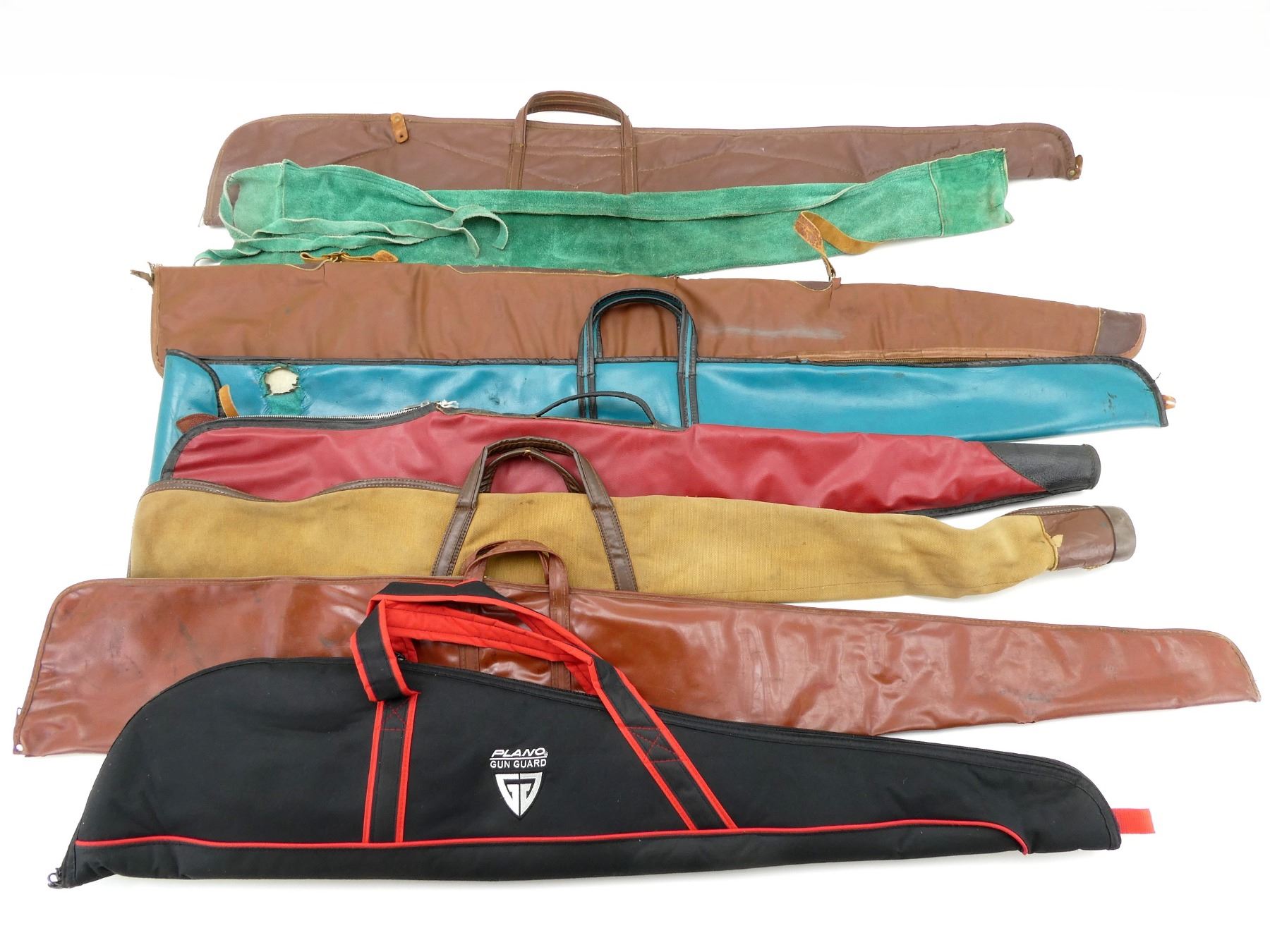 LOT INCLUDES; (7) SOFT PADDED GUN CASES, CARRY HANDLES, (5) ARE ZIPPERED, ONE BROKEN ZIPPER AND CARRY HANDLE, (1) IS A SIDE IN, CARRY HANDLE, STRAP & BUCKEL, (1) NON-PADDED GUN CASE, TIE DOWN STRAPS, APPROX. OVERALL LENGTH 40" - 55", SHOWS WEAR AND TEAR FROM USAGE, SEE PHOTOS