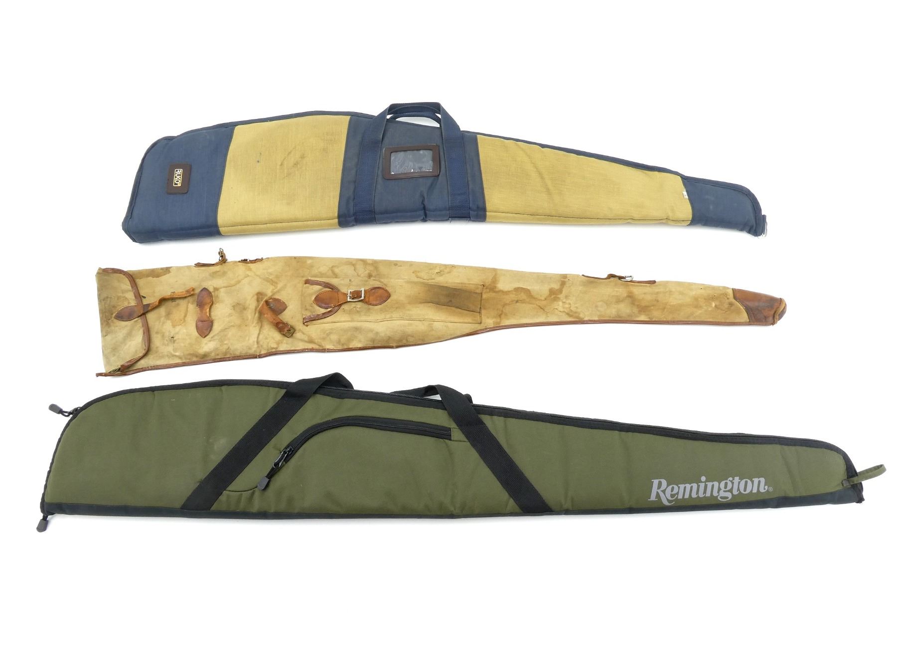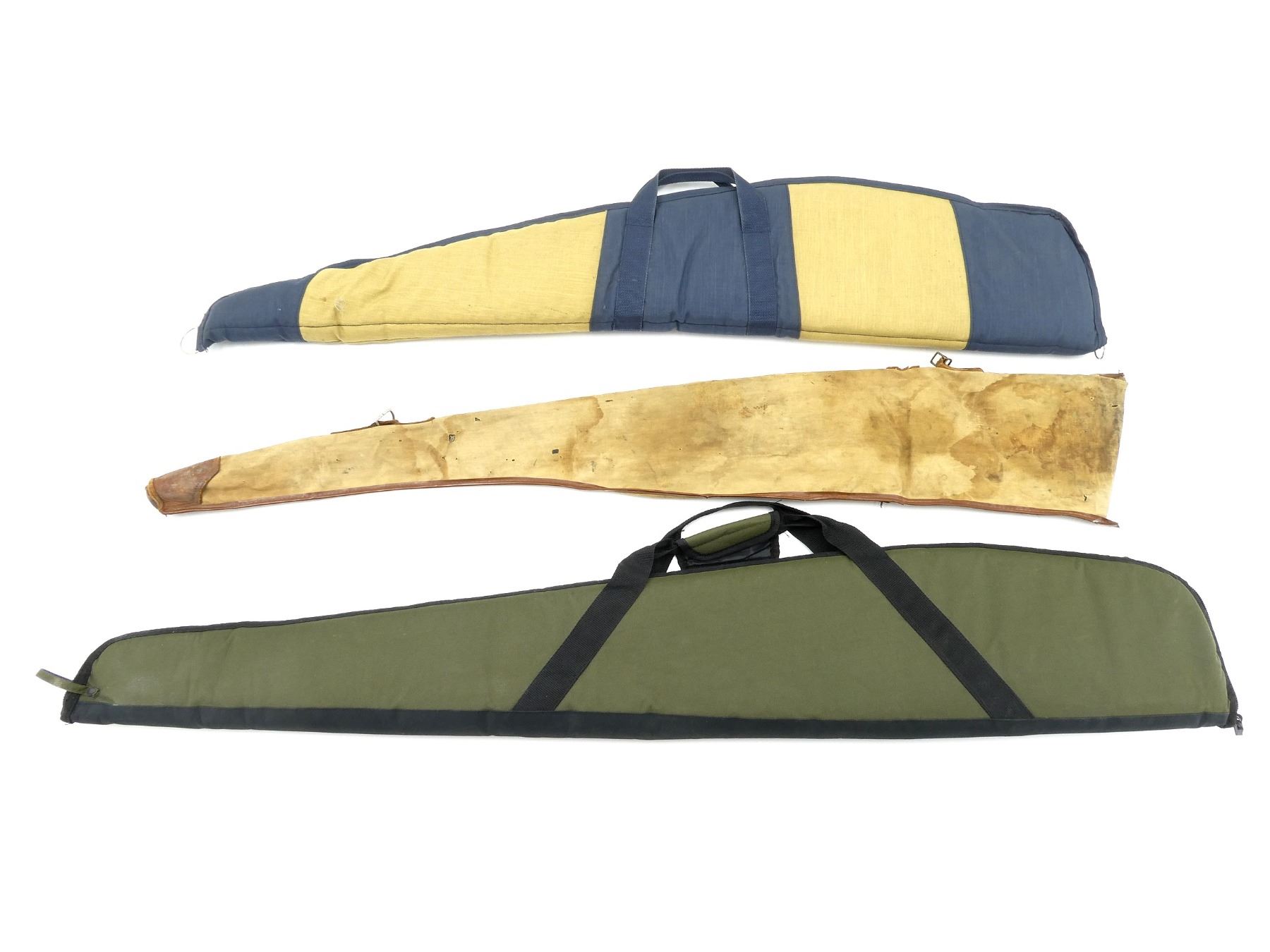 LOT INCLUDES; (2) SOFT PADDED GUN CASES, CARRY HANDLES, ZIPPERED, (1) WITH OUTSIDE ZIPPERED POCKET, (1) NON-PADDED SLIDE IN GUN CASE, STRAP & BUCKLE, (1) OUTSIDE POCKET WITH STRAP & BUCKEL, SOME DAMAGE, APPROX. OVERALL LENGTH 45"-52", SHOWS WEAR AND TEAR FROM USAGE, SEE PHOTOS.