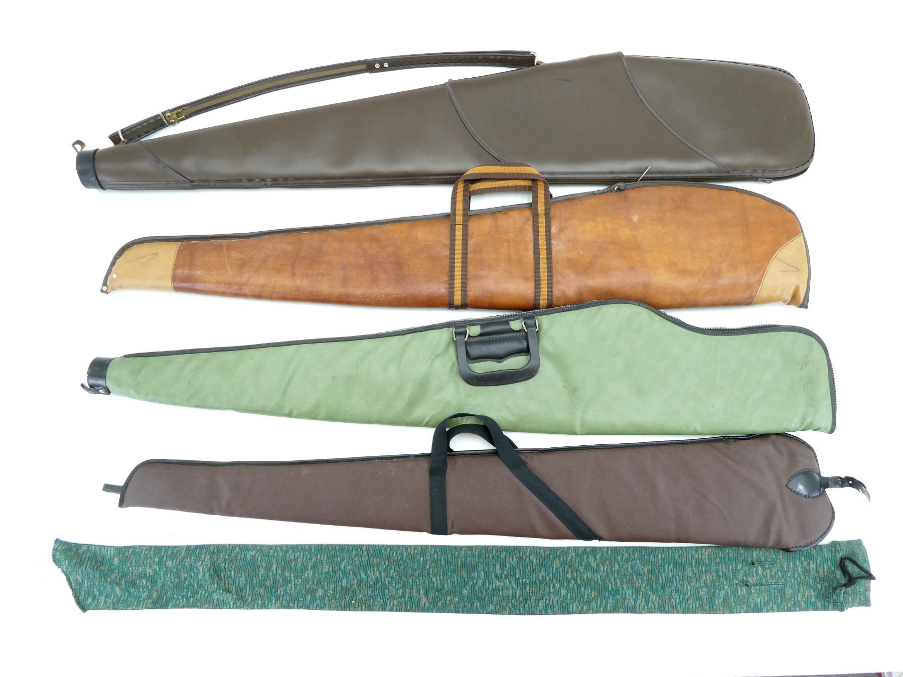 LOT INCLUDES; (3) SOFT PADDED GUN CASES, CARRY HANDLES, (1) WITH SHOULDER STRAP ONLY, ZIPPERED, (1) SLIDE IN WITH STRAP & BUCKLES, CARRY HANDLE, (1) GUN SOCK, APPROX. OAL 42"-49", SHOWS WEAR AND TEAR FROM USAGE, SEE PHOTOS.