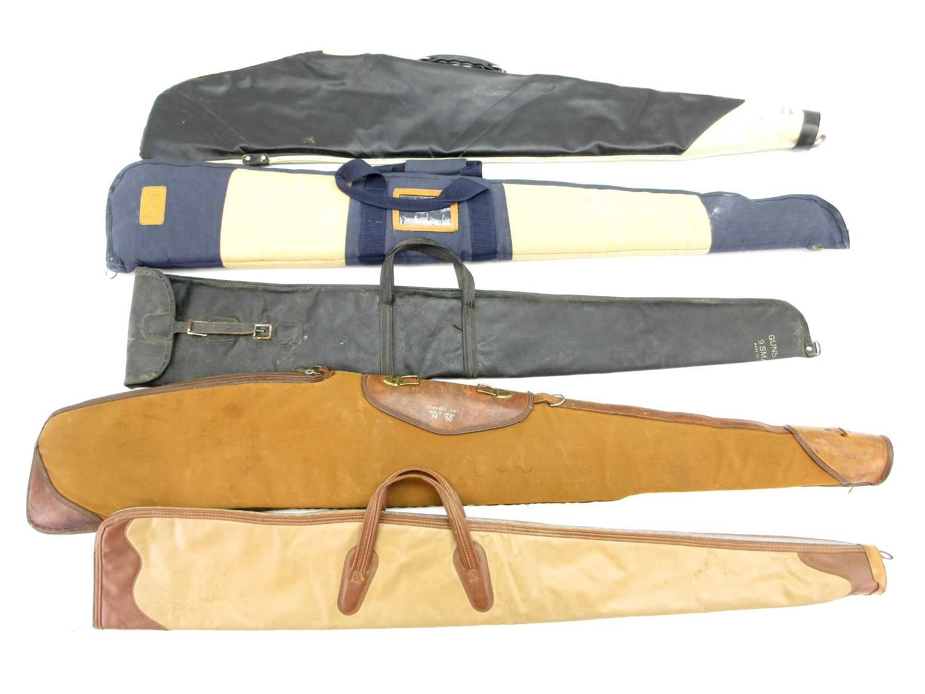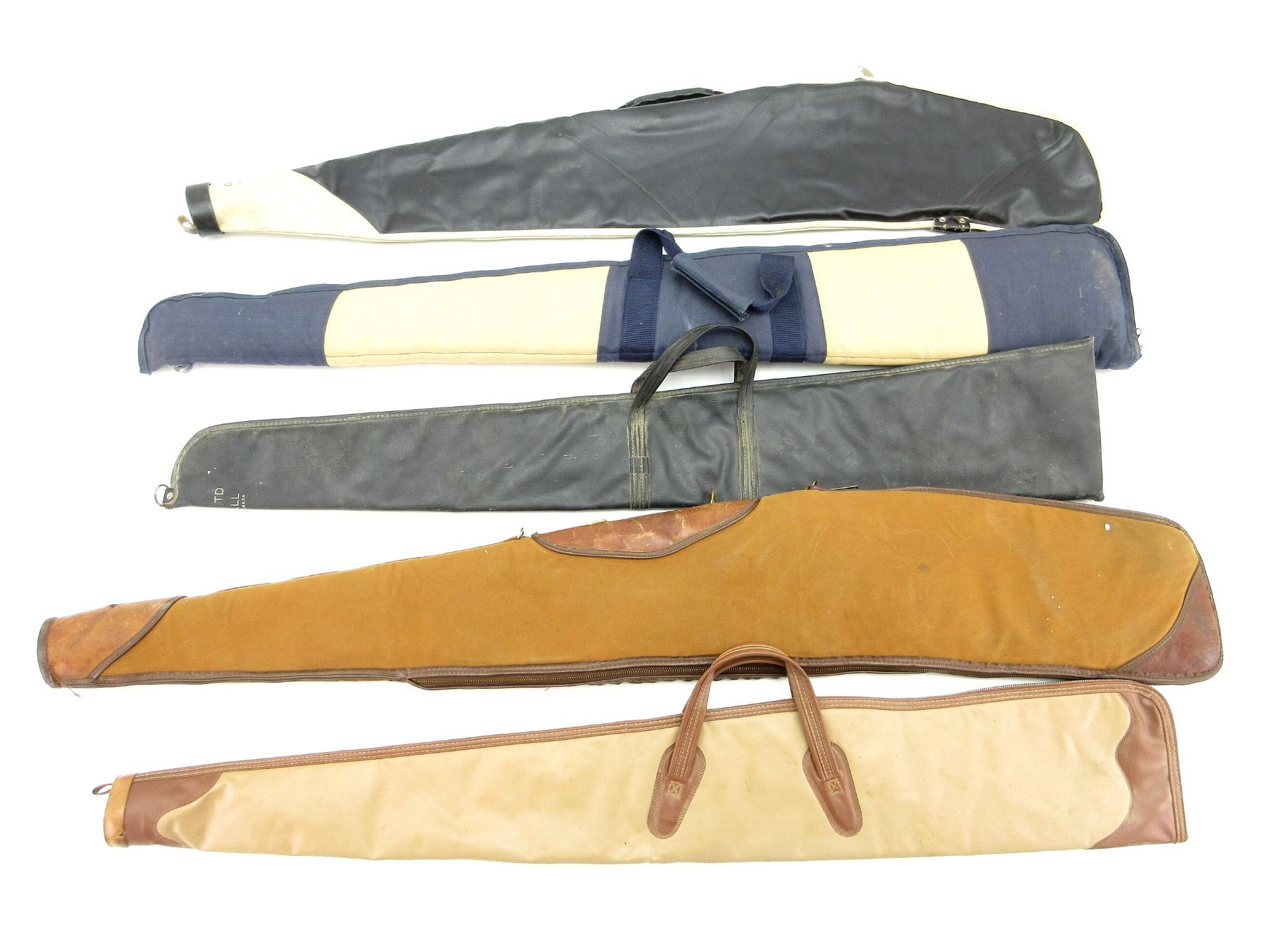 LOT INCLUDES; (5) SOFT PADDED GUN CASES, CARRY HANDLES, (1) MISSING CARRY HANDLE, (4) ZIPPERED, (1) SLIDE IN, APPROX. OAL 45"-50", SHOWS WEAR AND TEAR FROM USAGE, SEE PHOTOS.