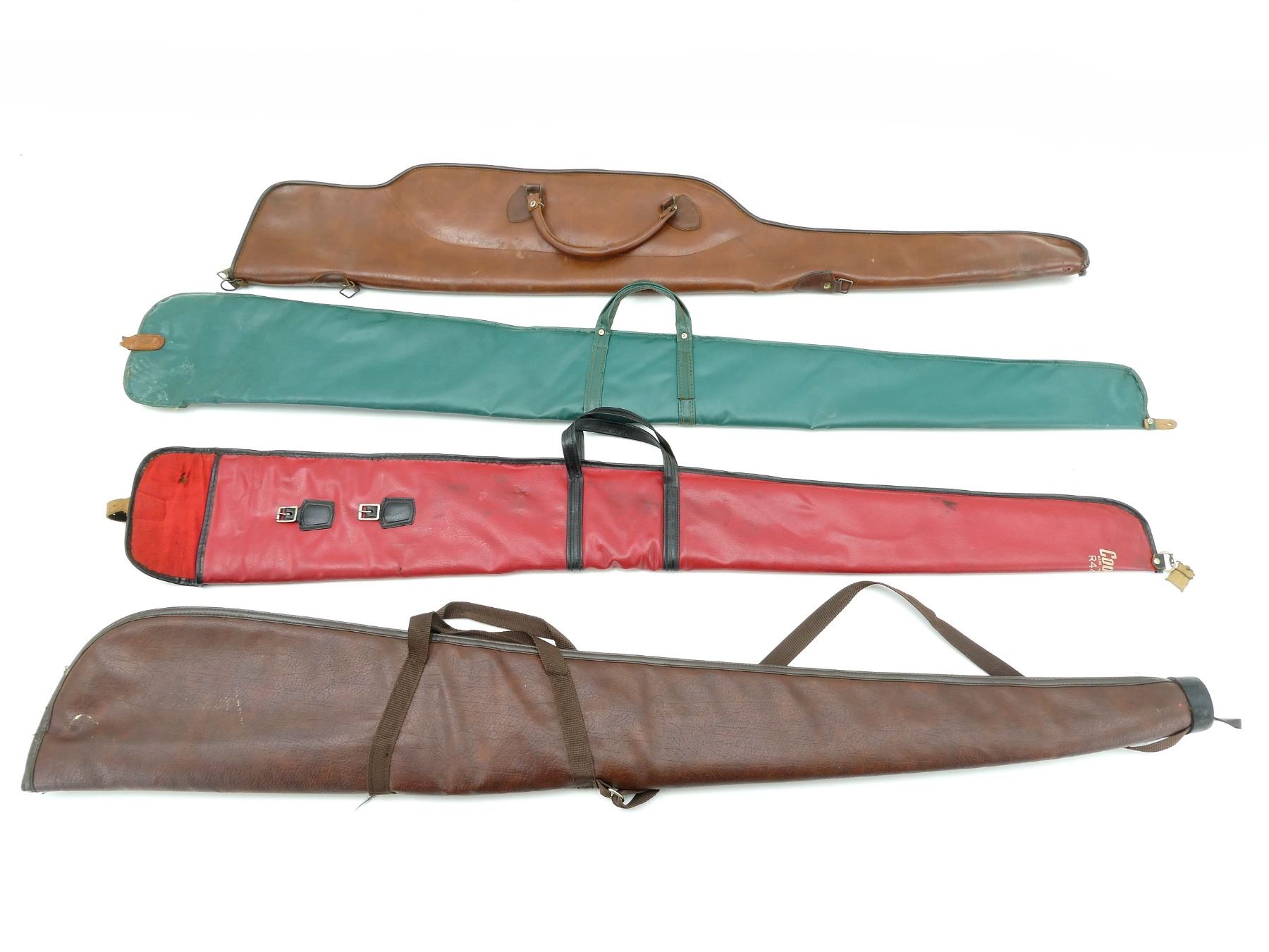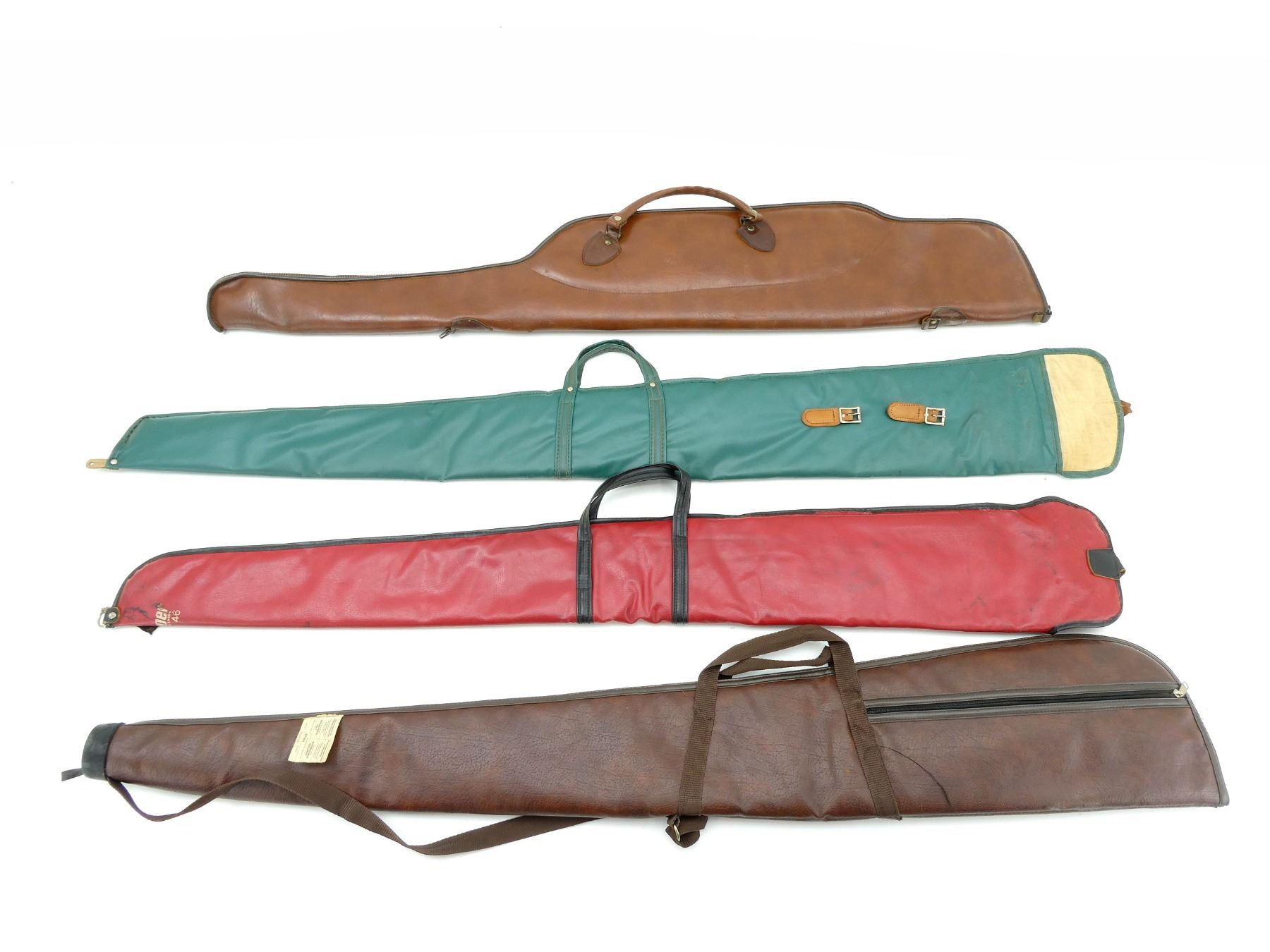 LOT INCLUDES; (4) SOFT PADDED GUN CASES, ZIPPERED, CARRY HANDLES, (1) HAS SHOULDER STRAP, (2) HAVE STRAP & BUCKEL, (1) STRAP IS BROKEN, APPROX. OVERALL LENGTH 46"-52", SHOWS WEAR AND TEAR FROM USAGE, SEE PHOTOS.