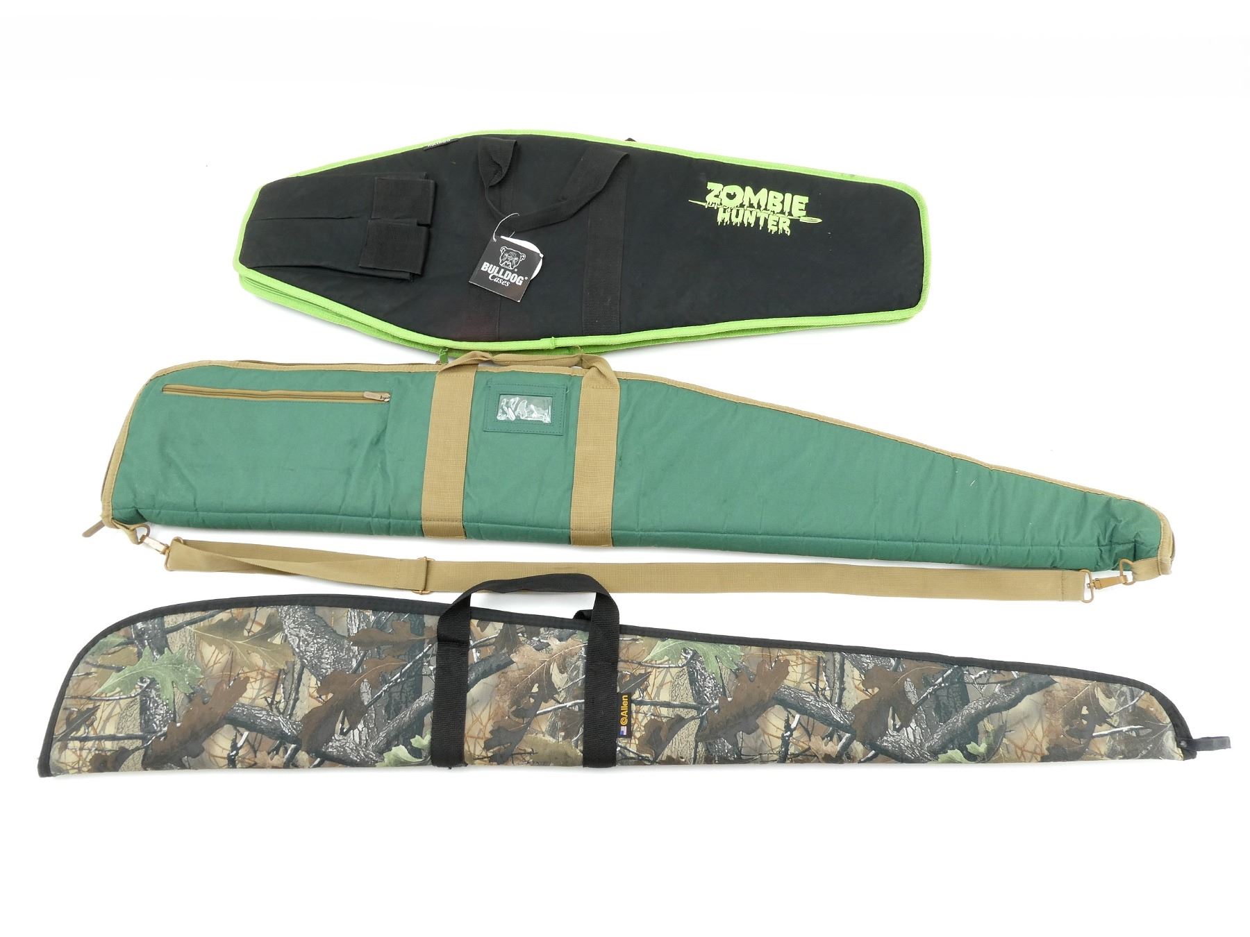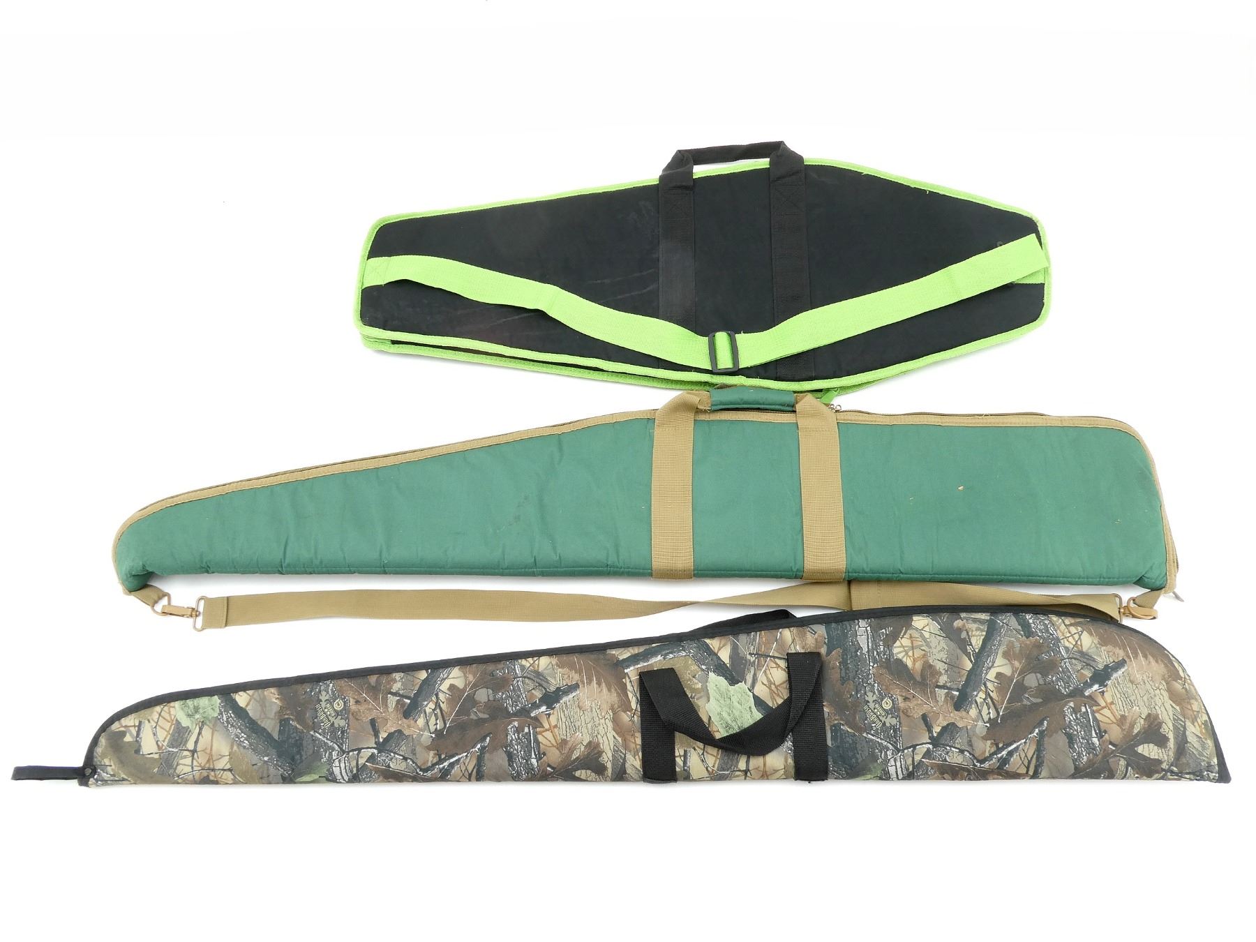 LOT INCLUDES; (3) SOFT PADDED GUN CASES, CARRY HANDLES, ZIPPERED, (1) WITH OUTSIDE ZIPPERED POCKET & SHOULDER STRAP, (1) WITH (2) VELCRO OUTSIDE POCKETS & SHOULDER STARP, APPROX. OVERALL LENGTH 37"- 50", SHOWS WEAR AND TEAR FROM USAGE, SEE PHOTOS.