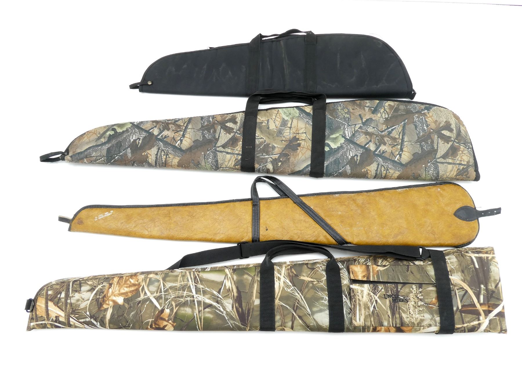 LOT INCLUDES; (4) SOFT PADDED GUN CASES, ZIPPERED, CARRY HANDLES, (1) HAS SHOULDER STRAP & OUTSIDE VELCRO POCKET, (1) HAS STRAP & BUCKEL STRAP IS BROKEN, APPROX. OVERALL LENGTH 32"-46", SHOWS WEAR AND TEAR FROM USAGE, SEE PHOTOS.