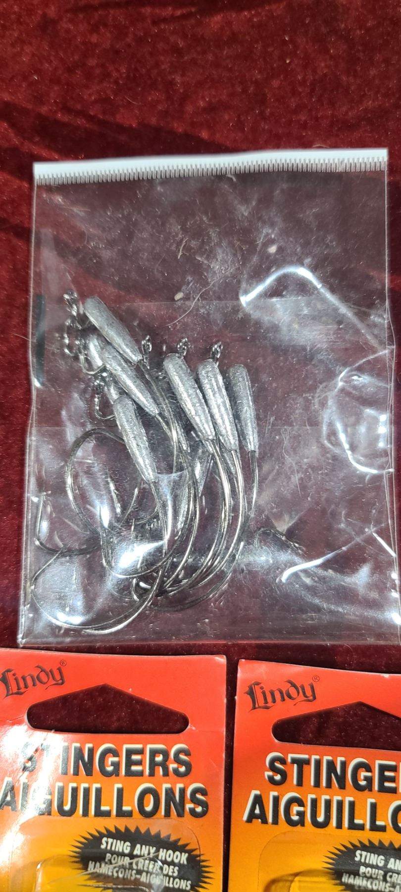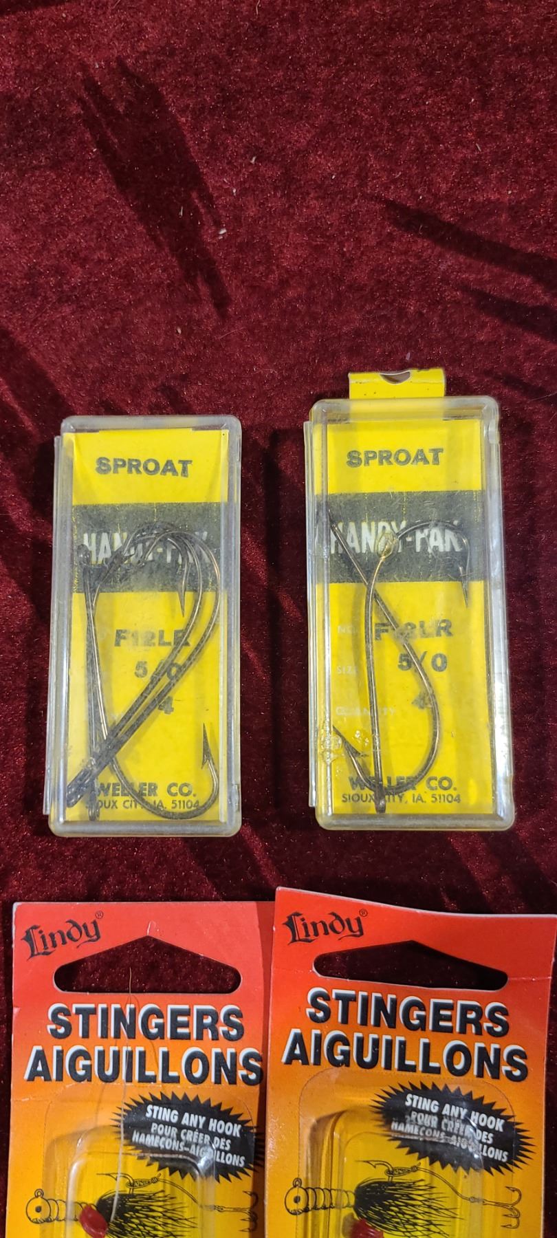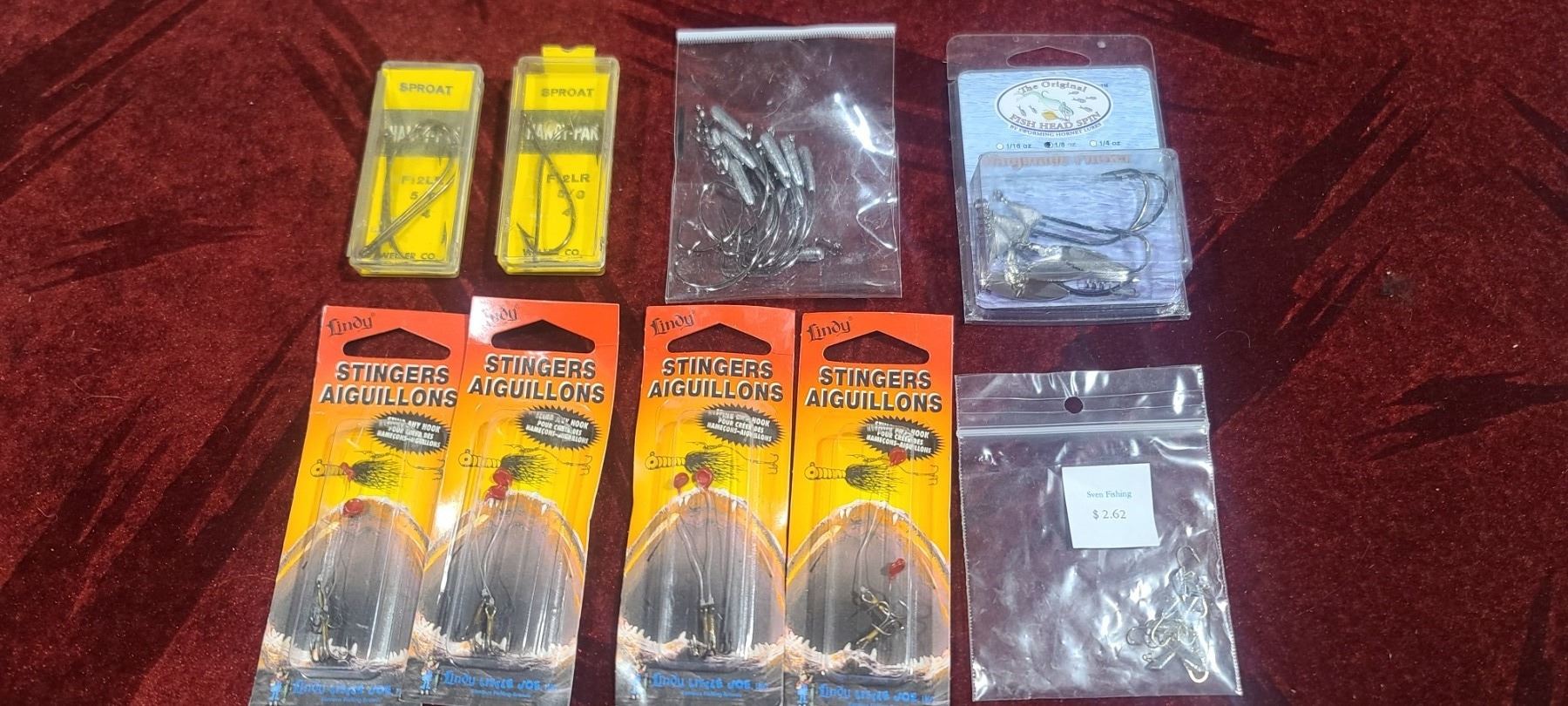 ASSORTED SPORAT HOOKS, LINDY STINGERS, THE ORIGINAL FISHHEAD SPINNER AND WEIGHTED HOOKS