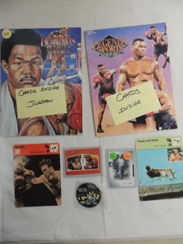 ASSORTED SPORT BOX LOT: BOXING MAGAZINES & CARDS, GOLF TIGER WOODS CARD, NOTRE DAME SPORTS PIN. AS SHOWN. VIEW PICTURE FOR DETAIL.