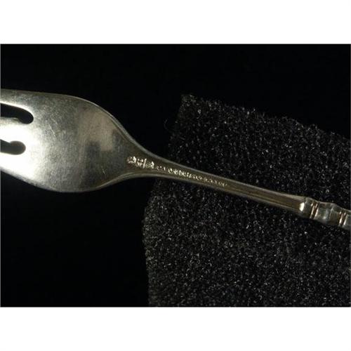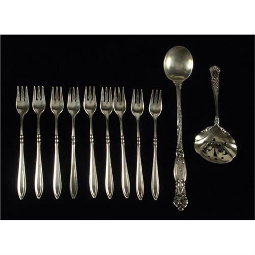 STERLING: Assorted lot of sterling silver consisting of nine cocktail forks by Gorham Silversmiths, ''Priscilla'', 1916, a bon bon spoon and an olive spoon, both early 20th century, as is, 4.98 toz.