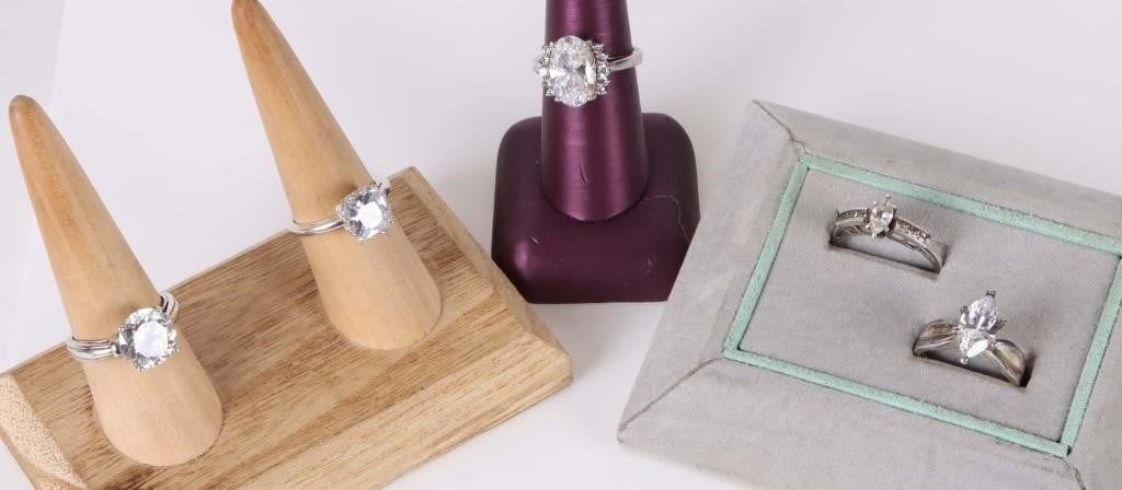Assorted sterling silver CZ ladies rings to include one 5.0ct round cut CZ sterling silver ring, one 4.0ct oval cut CZ headstone sterling silver ring, one 2.0ct marquise CZ sterling ring, one 2.0ct princess cut CZ sterling ring, and one 0.40ct marquise CZ headstone sterling ring.
