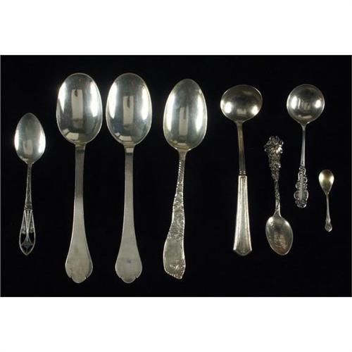 STERLING SILVER: A assorted lot of eight sterling silver spoons ranging from a gold washed salt spoon to large table spoons, mixed patterns, late 19th to mid 20th century, 5.39 ozt.