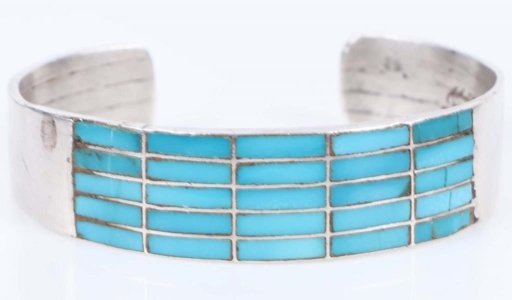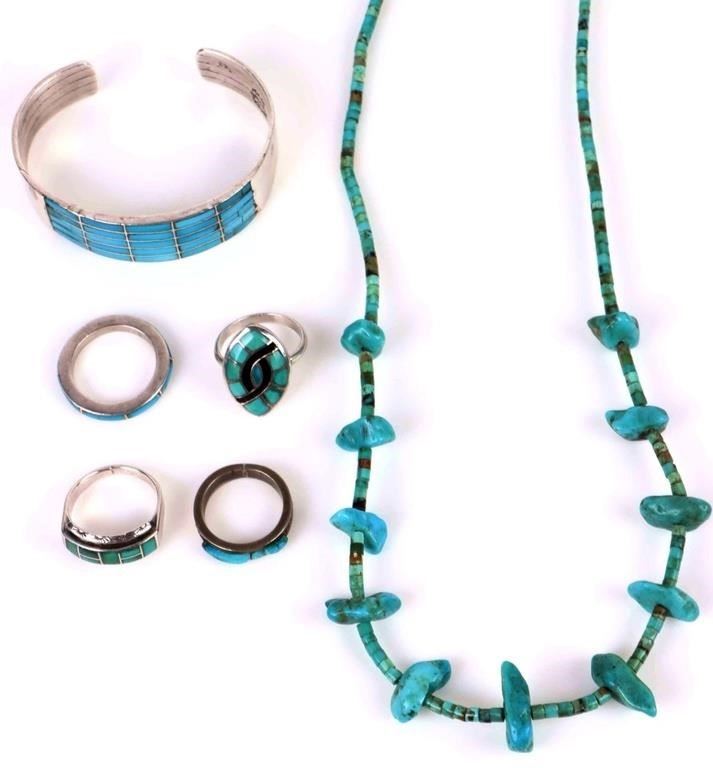 Assorted sterling silver turquoise jewelry to include one turquoise sterling silver necklace, one sterling silver turquoise cuff bracelet, and four sterling silver turquoise rings.