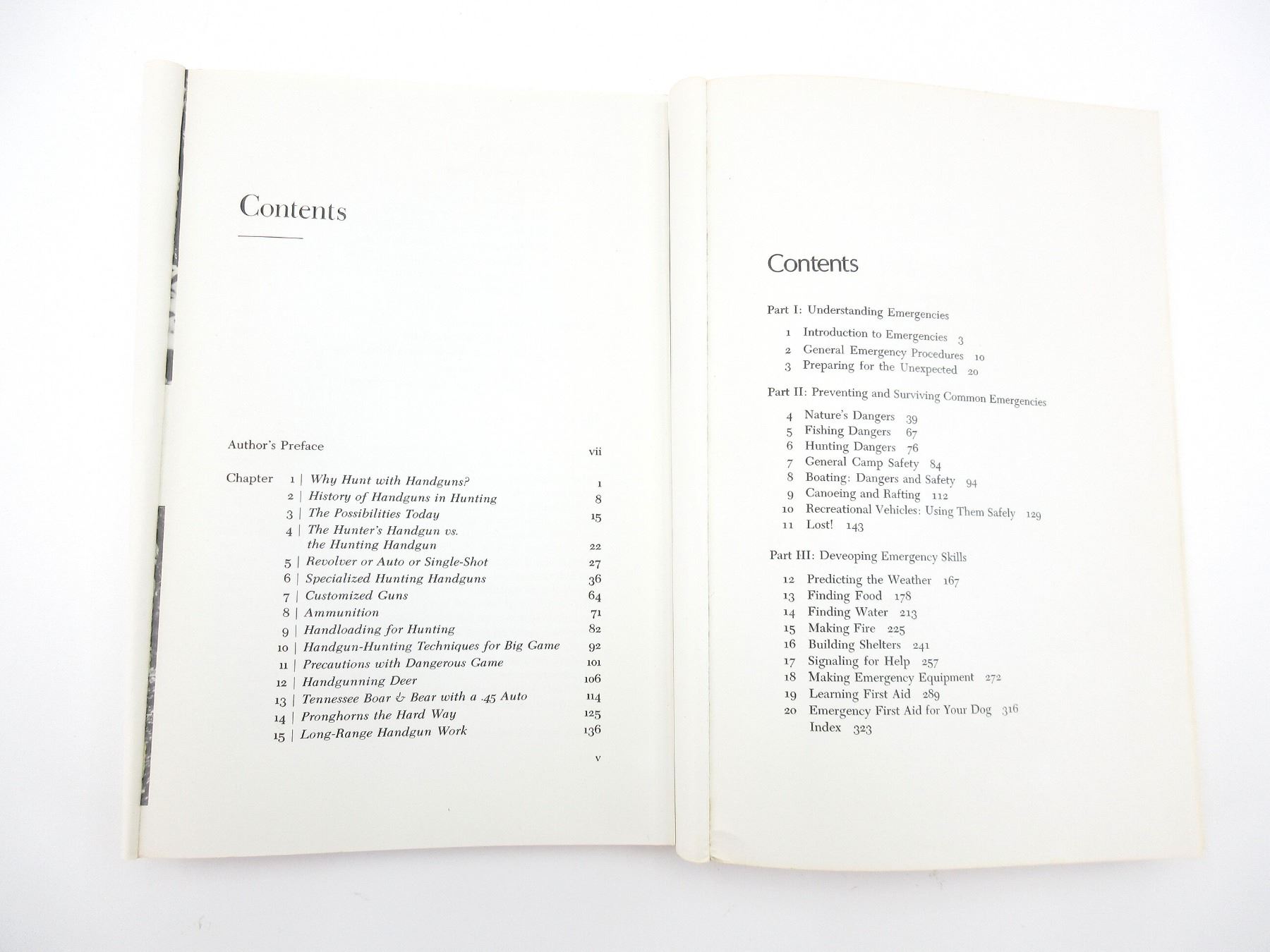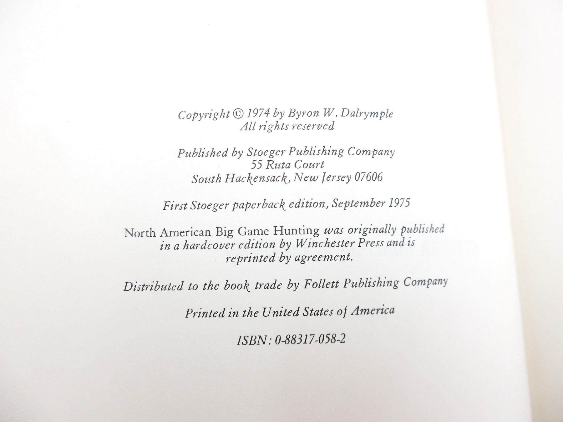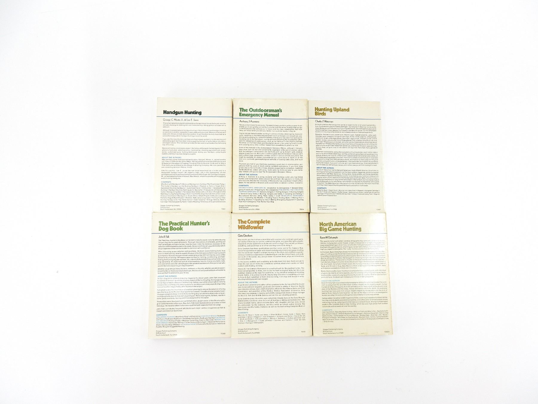 SOFT COVERS, LOT INCLUDES; (1) "NORTH AMERICAN BIG GAME HUNTING" BOOK BY BRYON W. DALRYMPLE, ISBN: 0-88317-058-2, (1) "HANDGUN HUNTING" BOOK BY MAJOR GEORGE C. NONTE JR & LEE E. JURRAS, ISBN: 0-88317-070-1, (1) "THE COMPLETE WILDFOWLER" BOOK BY GRITS GRESHAM, ISBN: 0-88317-024-8, (1) "HUNTING UPLAND BIRDS" BOOK BY CHARLES F. WATERMAN, ISBN: 0-88317-051-5, (1) "THE PRACTICAL HUNTER'S DOG BOOK" BOOK BY JOHN R. FALK, ISBN: 0-88317-053-1 & (1) "THE OUTDOORSMAN'S EMERGENCY MANUAL" BOOK BY ANTHONY J. ACERRANO, ISBN: 0-88317-036-1. SEE PHOTOS.