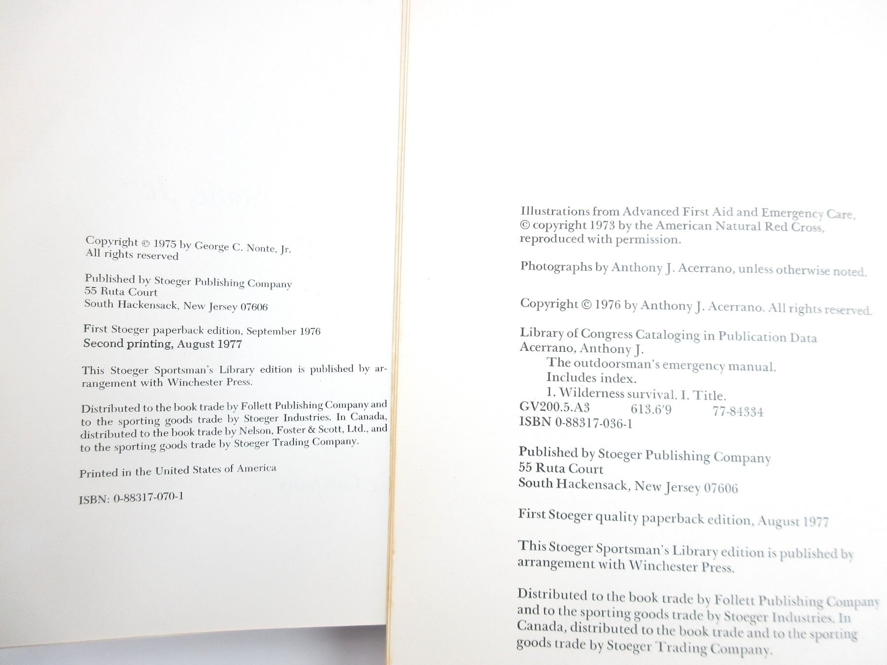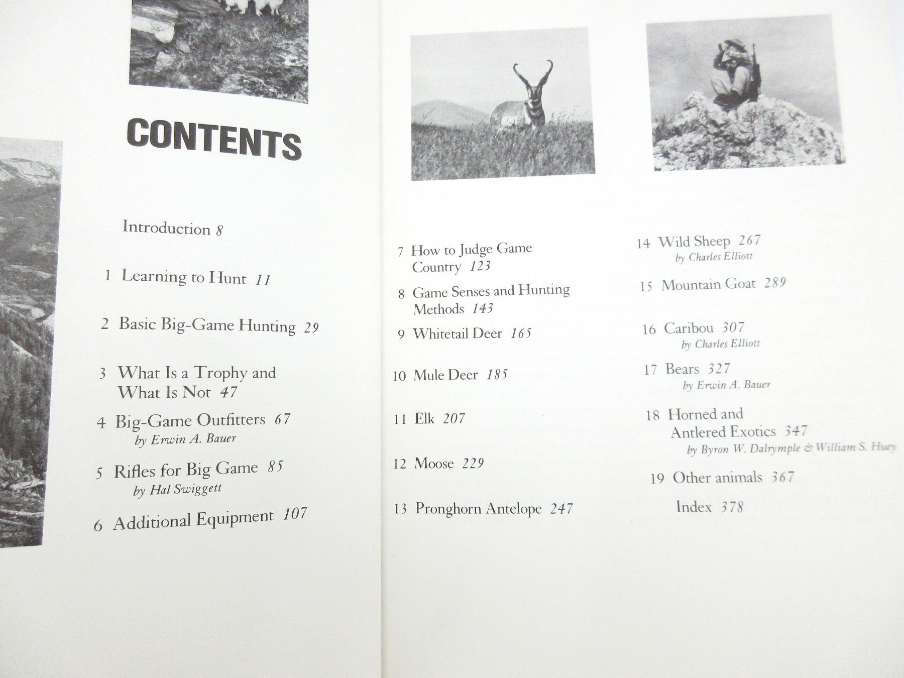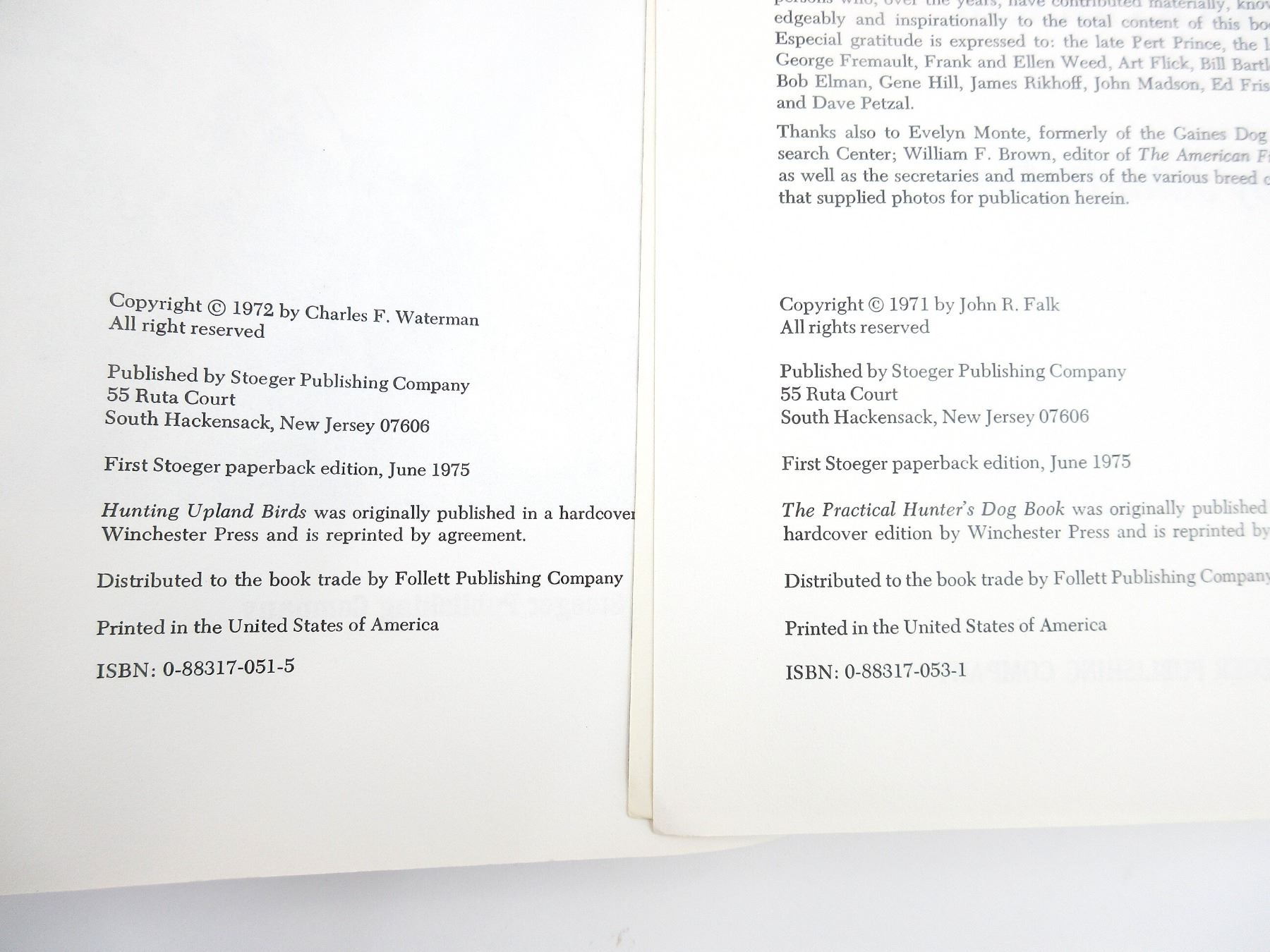 SOFT COVERS, LOT INCLUDES; (1) "NORTH AMERICAN BIG GAME HUNTING" BOOK BY BRYON W. DALRYMPLE, ISBN: 0-88317-058-2, (1) "HANDGUN HUNTING" BOOK BY MAJOR GEORGE C. NONTE JR & LEE E. JURRAS, ISBN: 0-88317-070-1, (1) "THE COMPLETE WILDFOWLER" BOOK BY GRITS GRESHAM, ISBN: 0-88317-024-8, (1) "HUNTING UPLAND BIRDS" BOOK BY CHARLES F. WATERMAN, ISBN: 0-88317-051-5, (1) "THE PRACTICAL HUNTER'S DOG BOOK" BOOK BY JOHN R. FALK, ISBN: 0-88317-053-1 & (1) "THE OUTDOORSMAN'S EMERGENCY MANUAL" BOOK BY ANTHONY J. ACERRANO, ISBN: 0-88317-036-1. SEE PHOTOS.