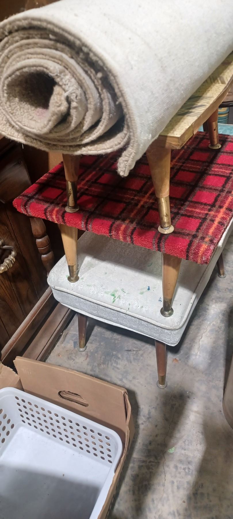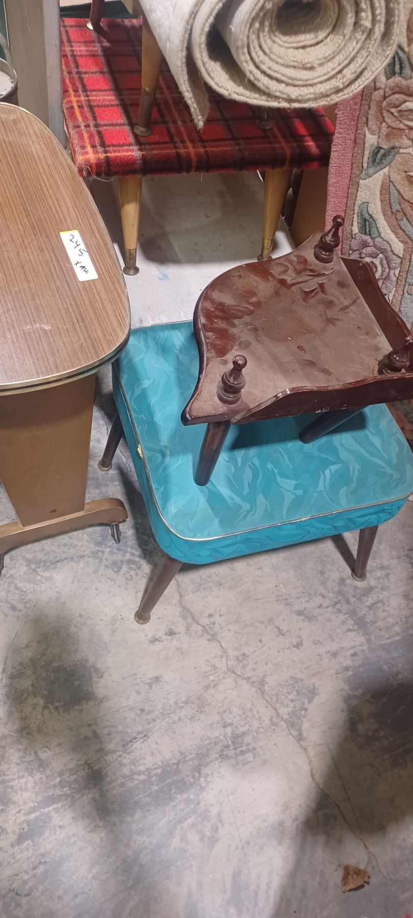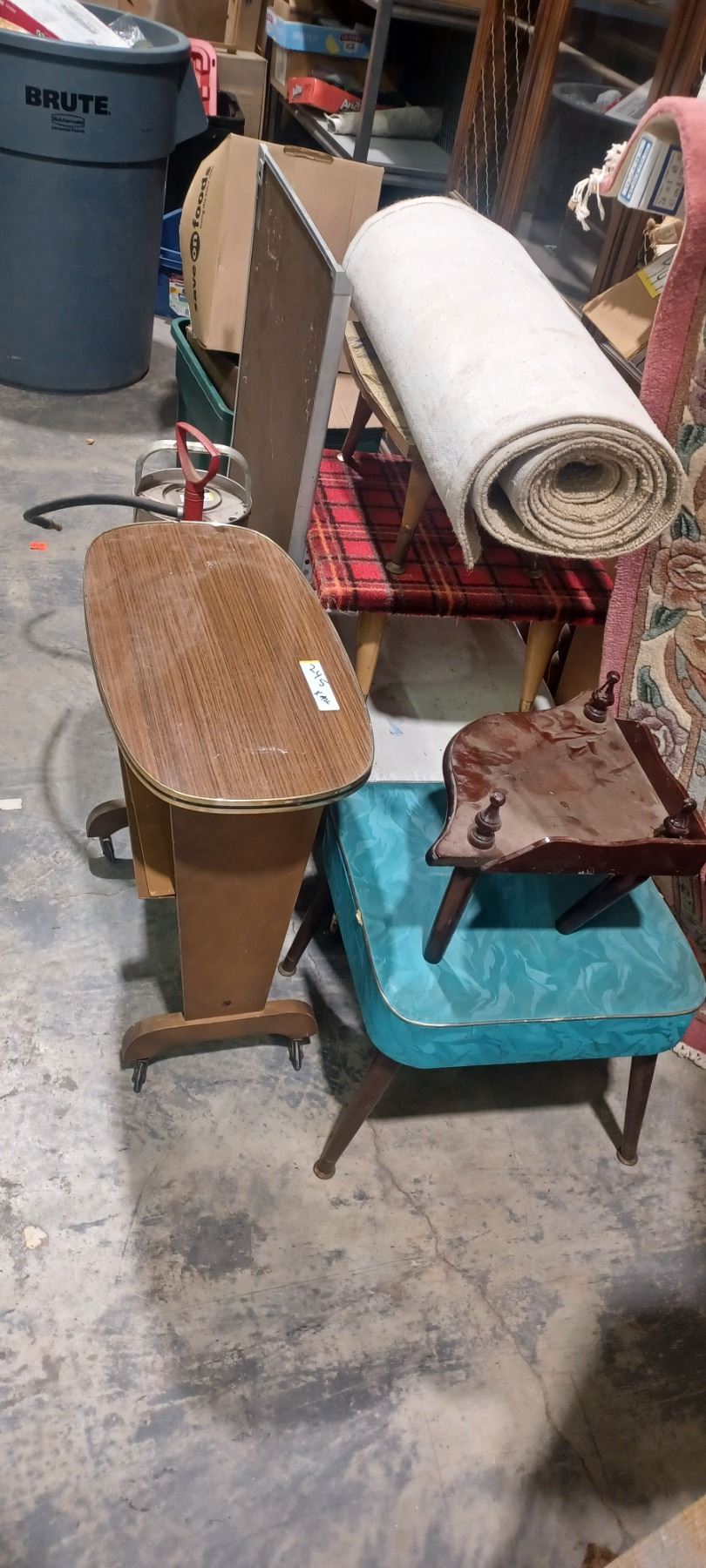 ASSORTED STOOLS, STANDS. CARPET . WHITE BOARD STAINLESS WATER CAN