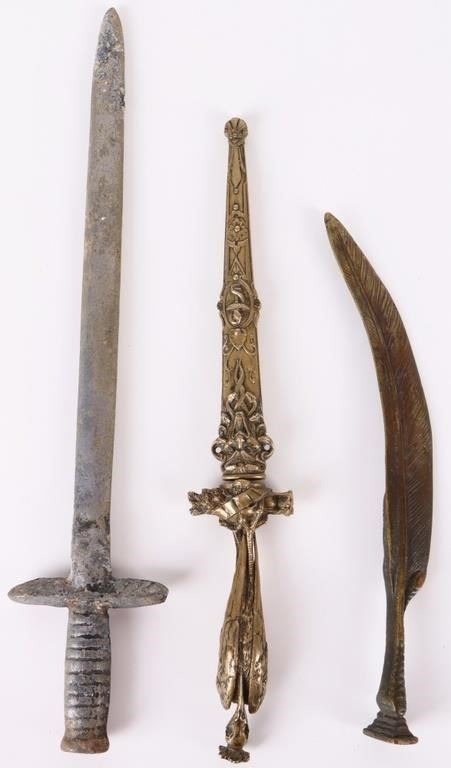 Assorted sword shaped letter openers to include one feather sword letter opener, one unique carved metal sword letter opener with a scabbard, and one thick double edged medieval style sword letter opener.