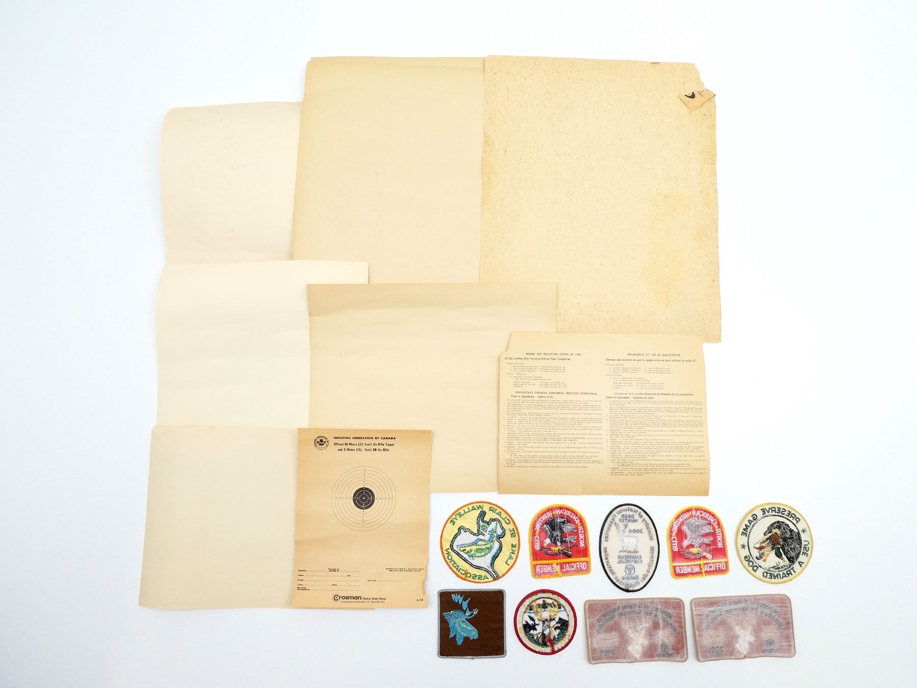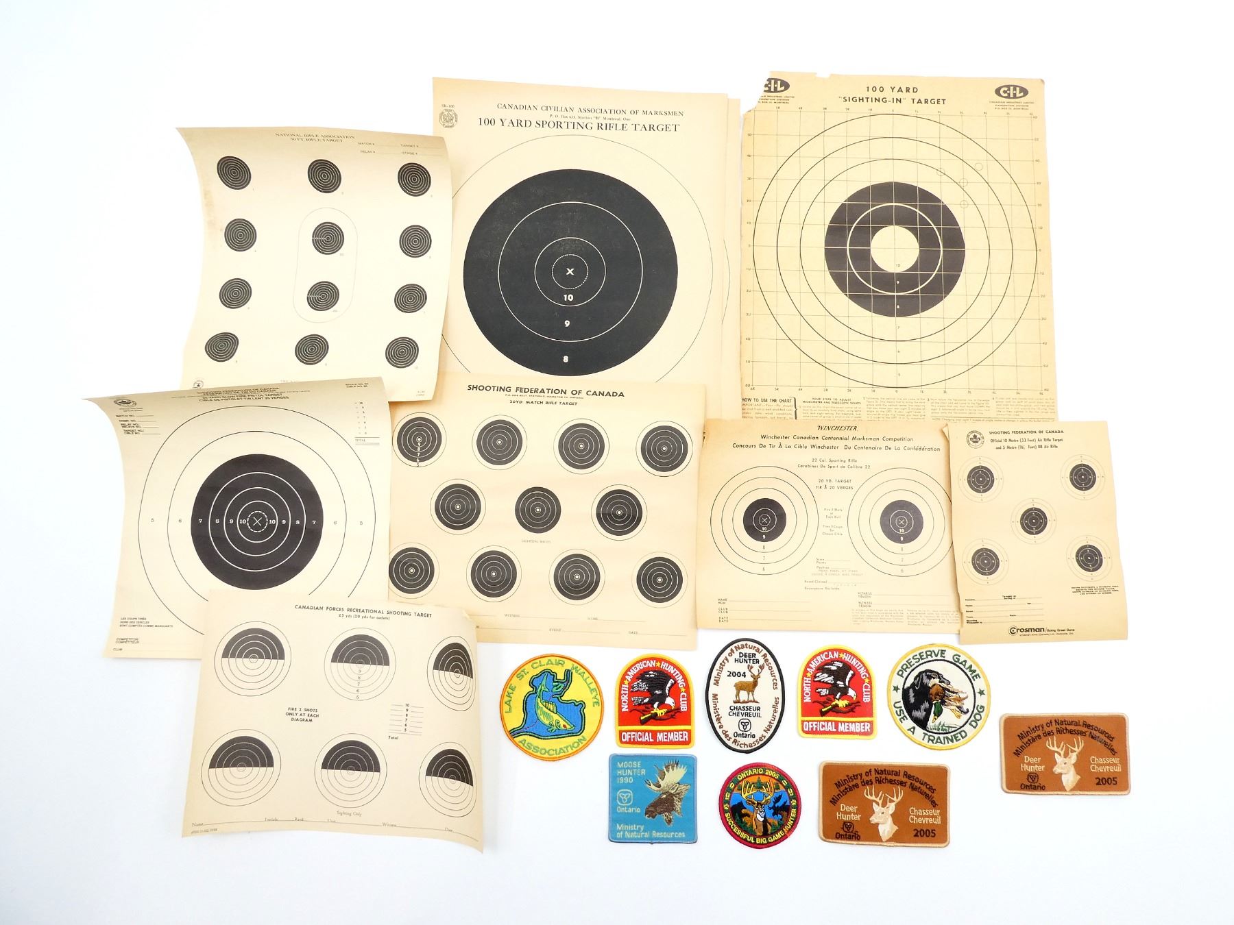 LOT INCLUDES; APPROX. (9) PAPER TARGETS, VARIOUS SIZES & APPROX. (9) ASSORTED HUNTING & FISHING PATCHES, VARIOUS CLUBS / ORGANIZATIONS. SEE PHOTOS.