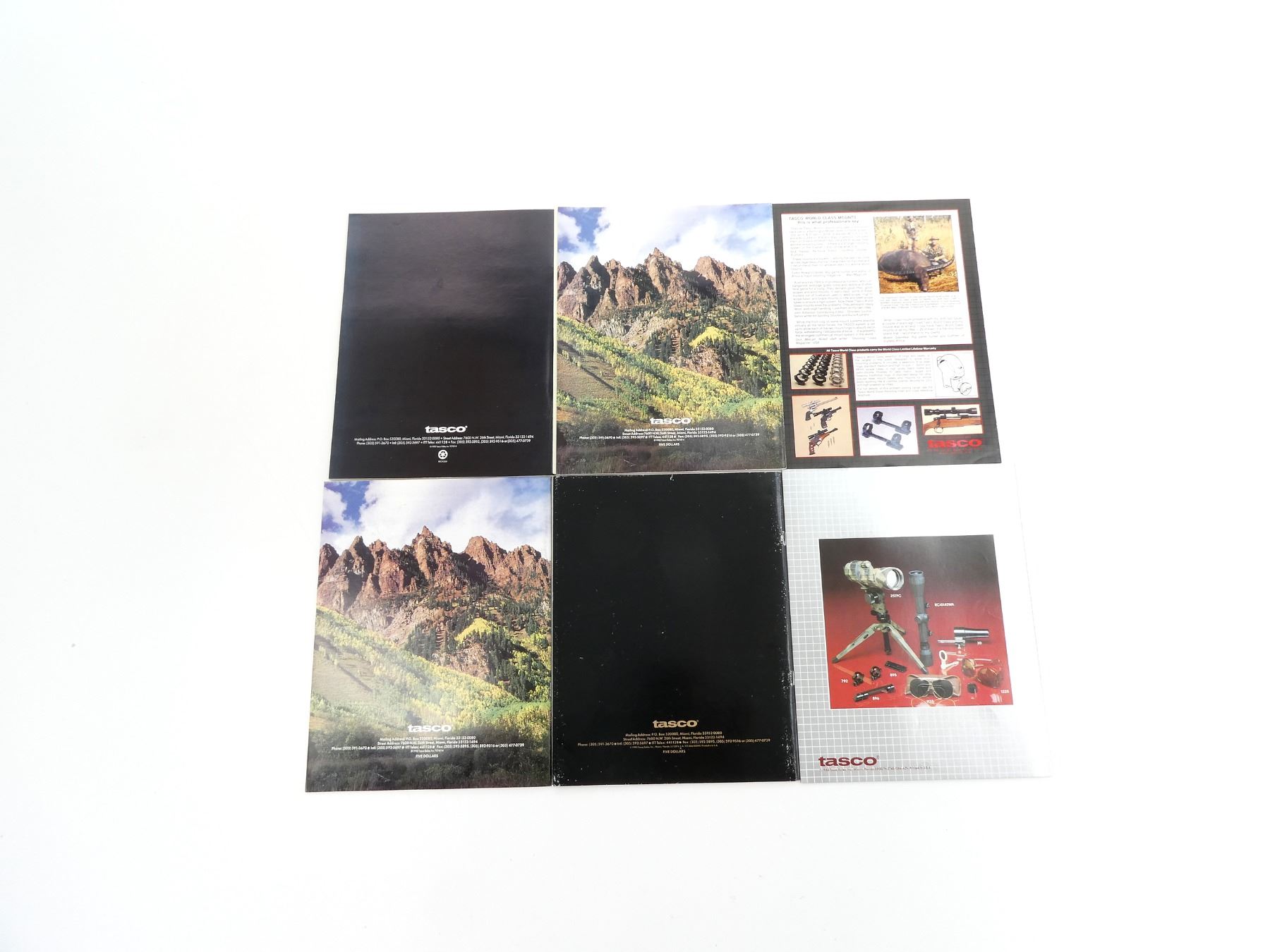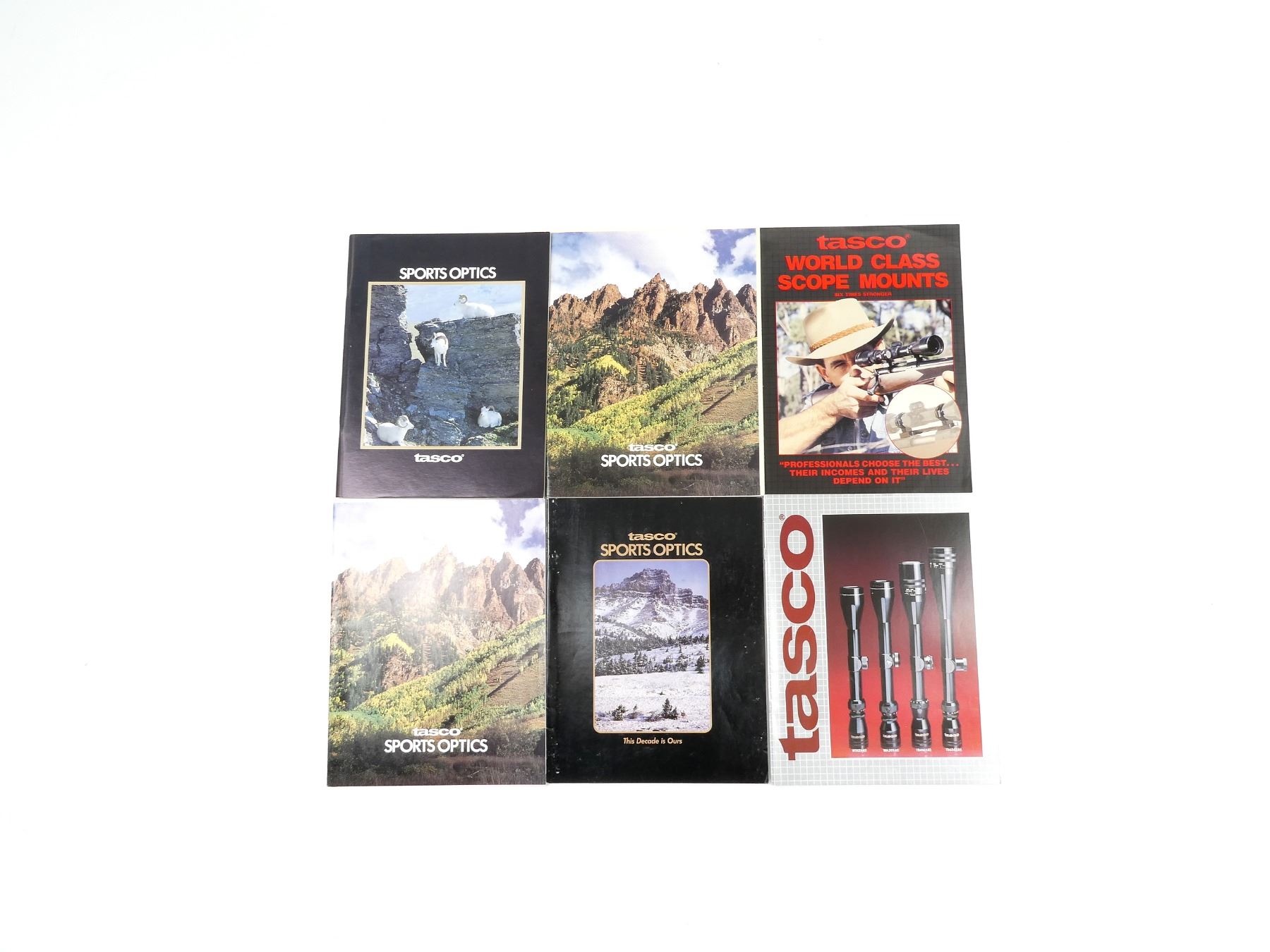 SOFT COVERS, LOT INCLUDES; (1) "TASCO WORLD CLASS SCOPE MOUNTS" CATALOGUE, (1) "TASCO" CATALOGUE, COPYRIGHT 1985, (2) "TASCO SPORTS OPTICS" CATALOGUE, COPYRIGHT 1992, (1) "TASCO SPORTS OPTICS" CATALOGUE, COPYRIGHT 1990 & (1) "TASCO SPORTS OPTICS" CATALOGUE, COPYRIGHT 1993. SEE PHOTOS.