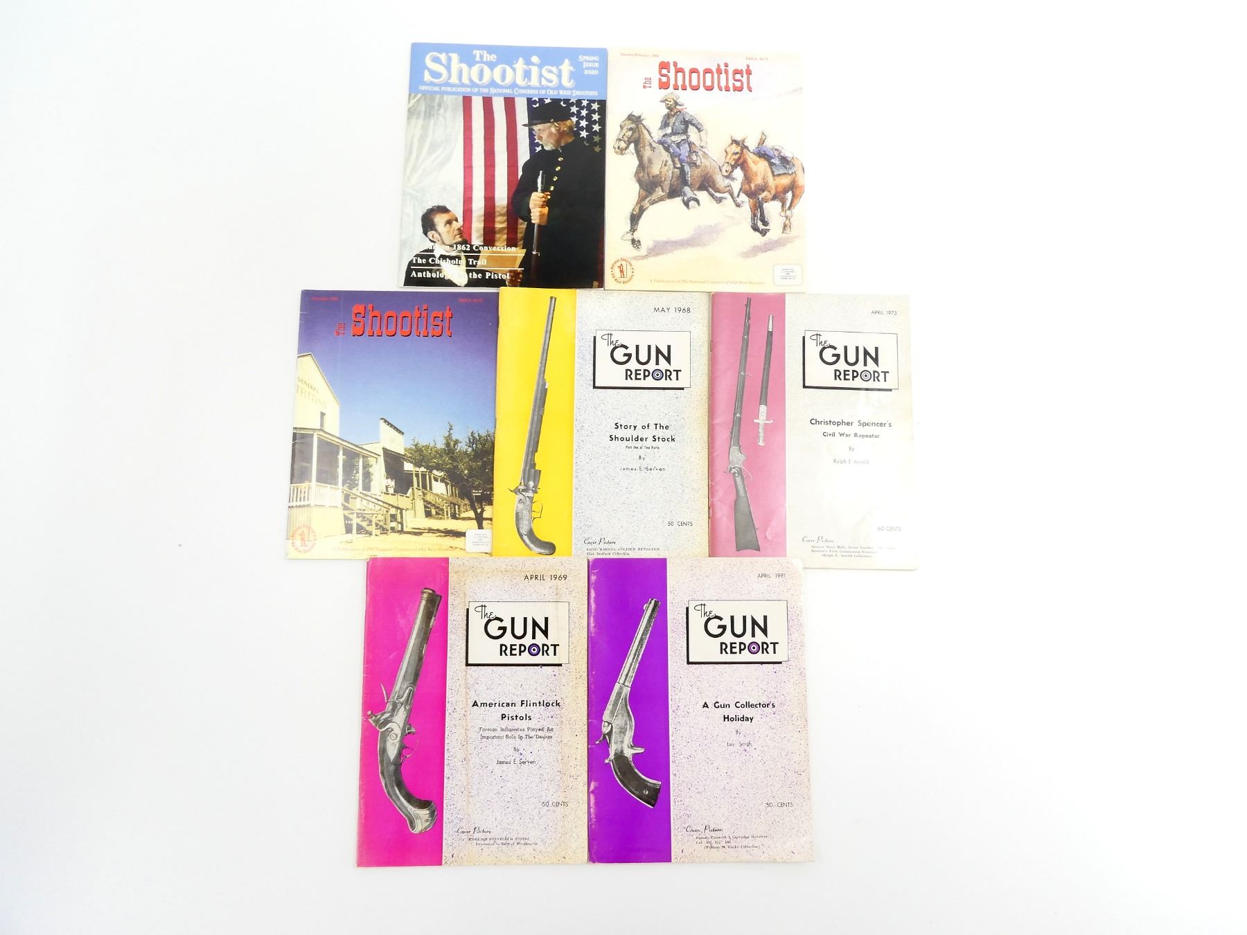 LOT INCLUDES; (1) "THE GUN REPORT; A GUN COLLECTOR'S HOLIDAY" MAGAZINE, BY LES SMITH, SOFT COVER, APRIL 1971, (1) "THE GUN REPORT; STORY OF THE SHOULDER STOCK" MAGAZINE, BY JAMES E. SERVEN, SOFT COVER, MAY 1968, (1) "THE GUN REPORT; AMERICAN FLINTLOCK PISTOLS" MAGAZINE, BY JAMES E. SERVEN, SOFT COVER, APRIL 1969, (1) "THE GUN REPORT; CHRISTOPHER SPENCER'S CIVIL WAR REPEATER" MAGAZINE, BY RALPH E. ARNOLD, SOFT COVER, APRIL 1973, (3) "THE SHOOTIST" MAGAZINES, MAY / JUNE 2001, JANUARY / FEBRUARY 2001 & SPRING ISSUE 2020, SOFT COVER. SEE PHOTOS.