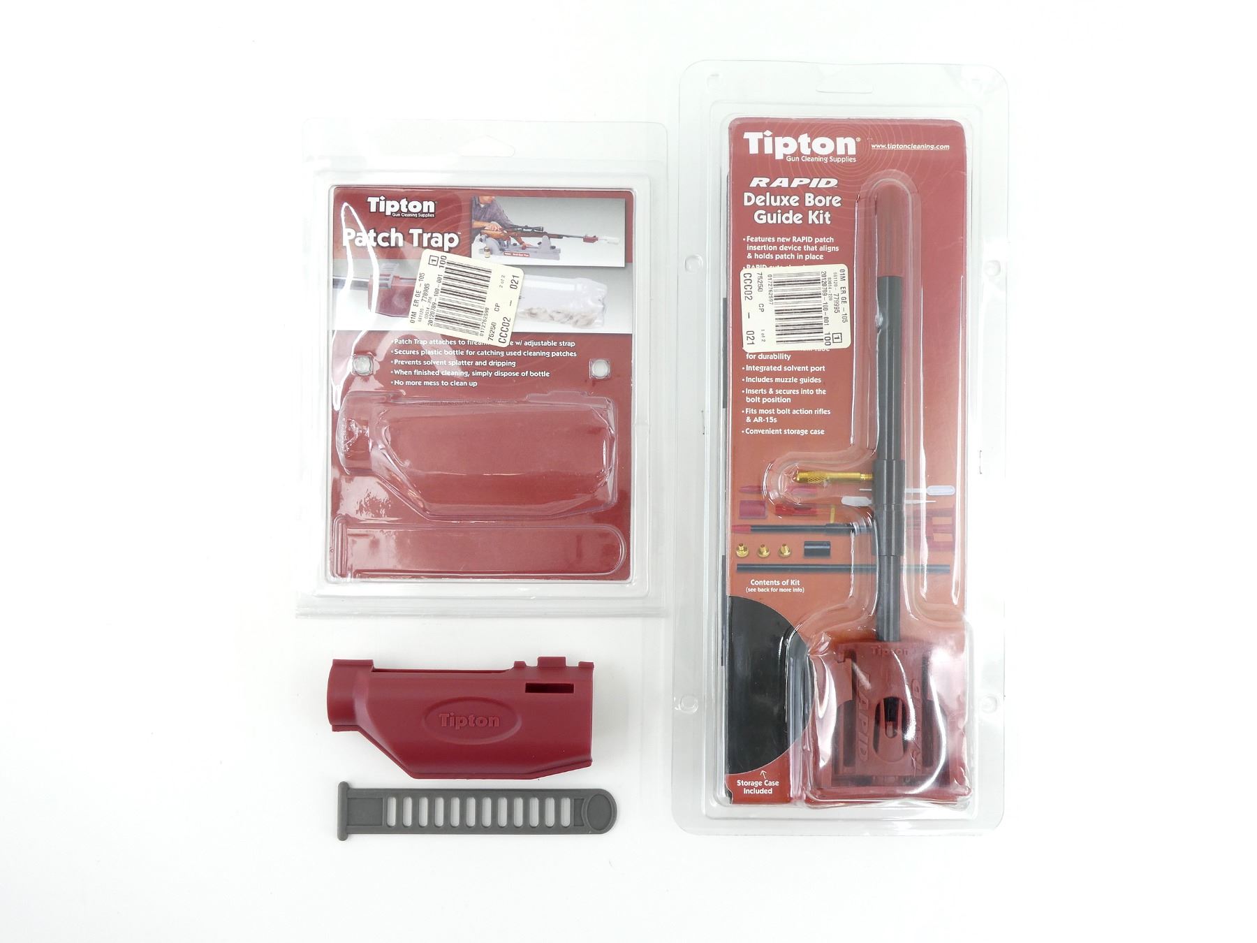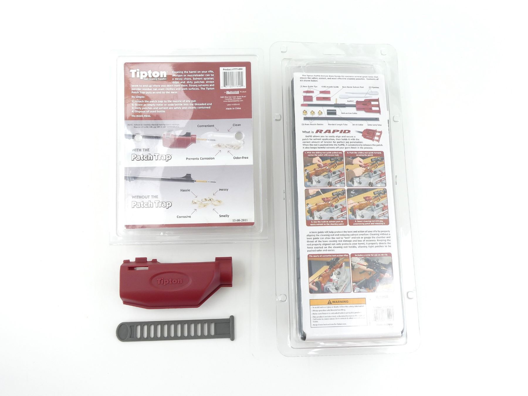 LOT INCLUDES; (1) TIPTON PATCH TRAP, ATTACHES TO FIREARM MUZZLE, EMPTY POP / WATER BOTTLE ATTACHES TO OTHER END TO CATCH DIRTY PATCHES, RED POLYMER CONSTRUCTION, APPEARS NOS, IN ORIGINAL PACKAGING & (1) TIPTON RAPID DELUXE BORE GUIDE KIT, FITS MOST BOLT ACTION RIFLES & AR-15'S, NOS, IN ORIGINAL UN-OPENED PACKAGING. SEE PHOTOS.