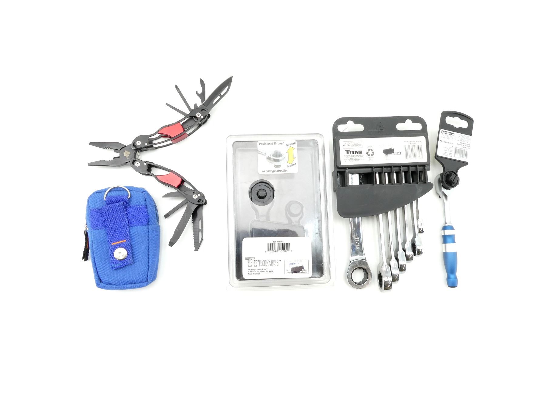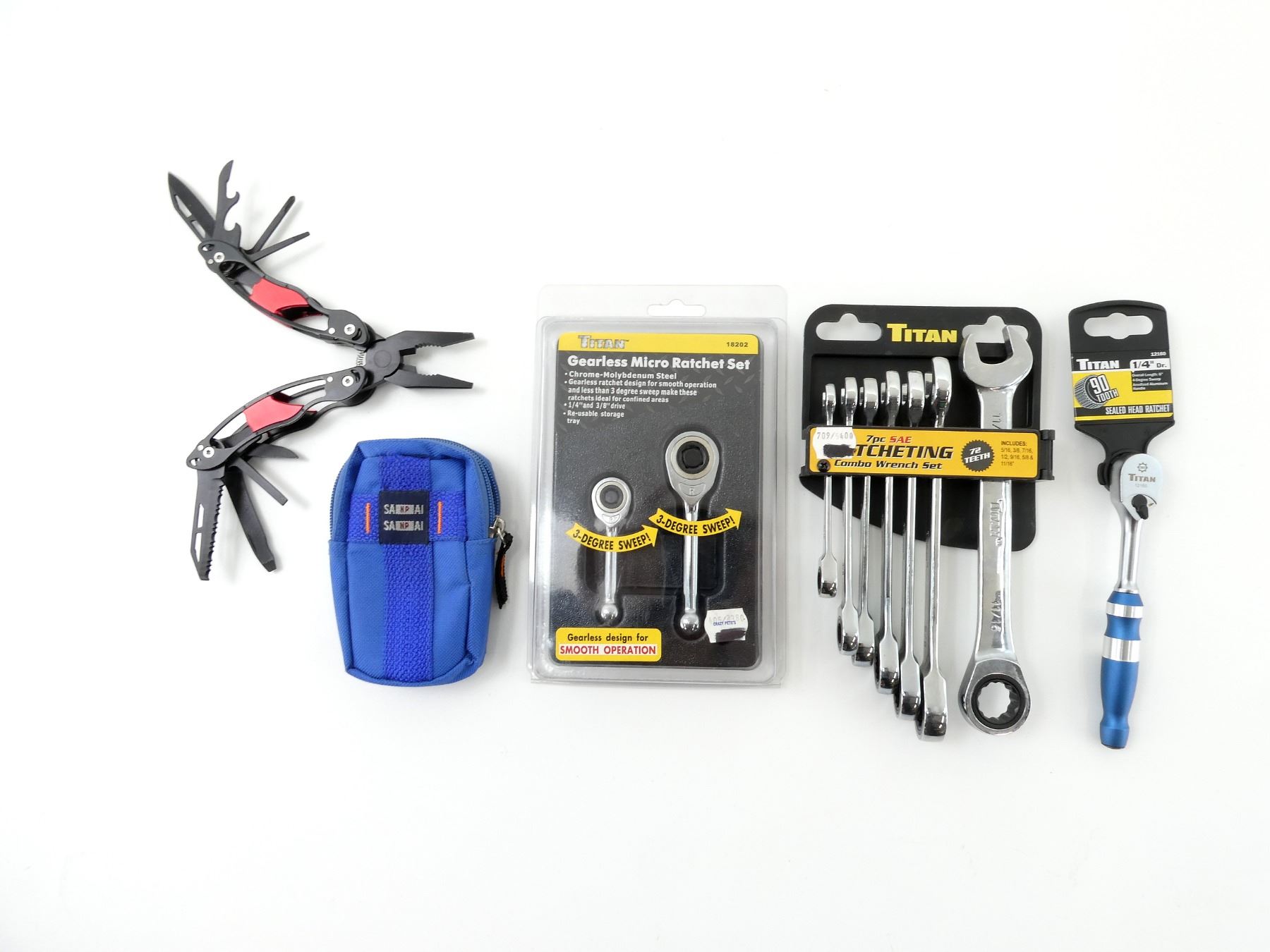 LOT INCLUDES; (1) TITAN SEALED HEAD RATCHET, MODEL #: 12160, 4 DEGREE SWEEP, NEW OLD STOCK, SEALED IN ORIGINAL PACKAGING, (1) TITAN GEARLESS MICRO RATCHET SET, MODEL #: 18202, 3 DEGREE SWEEP, NEW OLD STOCK, IN ORIGINAL PACKAGING, (1) TITAN RATCHETING COMBO WRENCH SET, 7-PIECE SET, 72 TEETH, MODEL #: 17356, NEW OLD STOCK, SEALED IN ORIGINAL PACKAGING & (1) PERFORMANCE TOOL MULTI-TOOL SWITCHPLIER, INCLUDES; PLIERS, WIRE CUTTERS / STRIPPERS, SCREWDRIVER, FILE, BLADE, ETC., MODEL #: W9305, WITH SANPAI BLUE NYLON CARRY CASE. SEE PHOTOS.