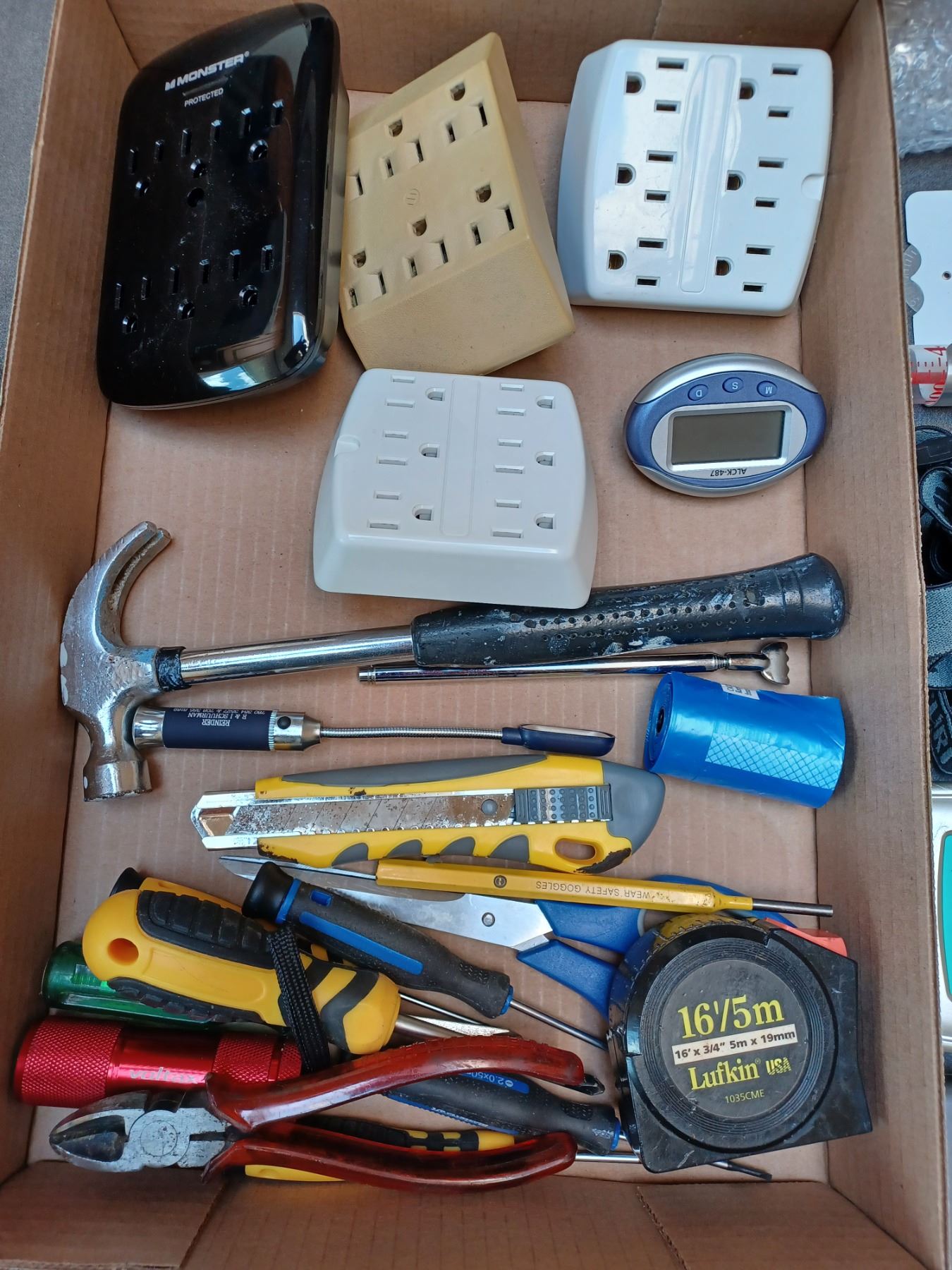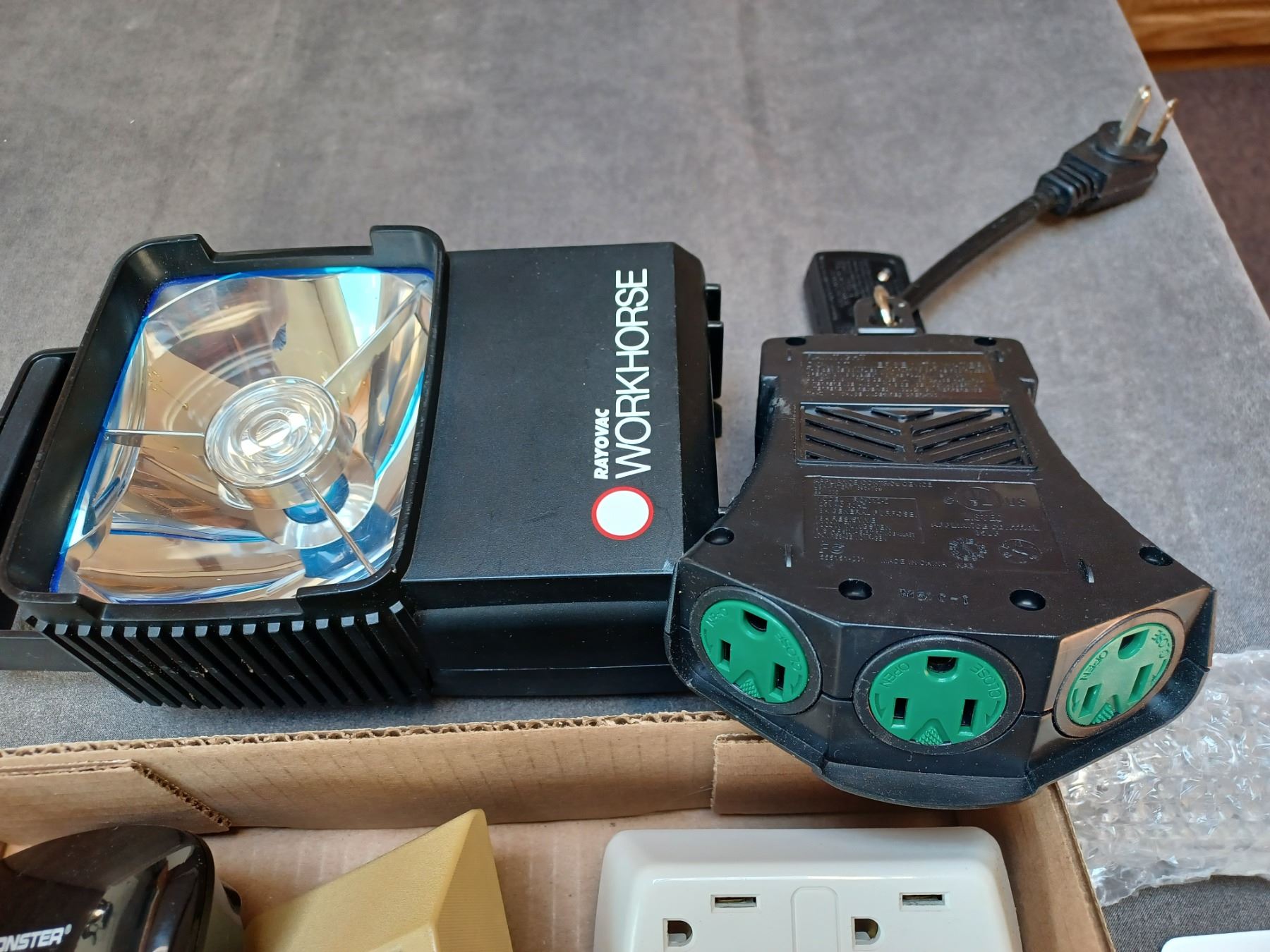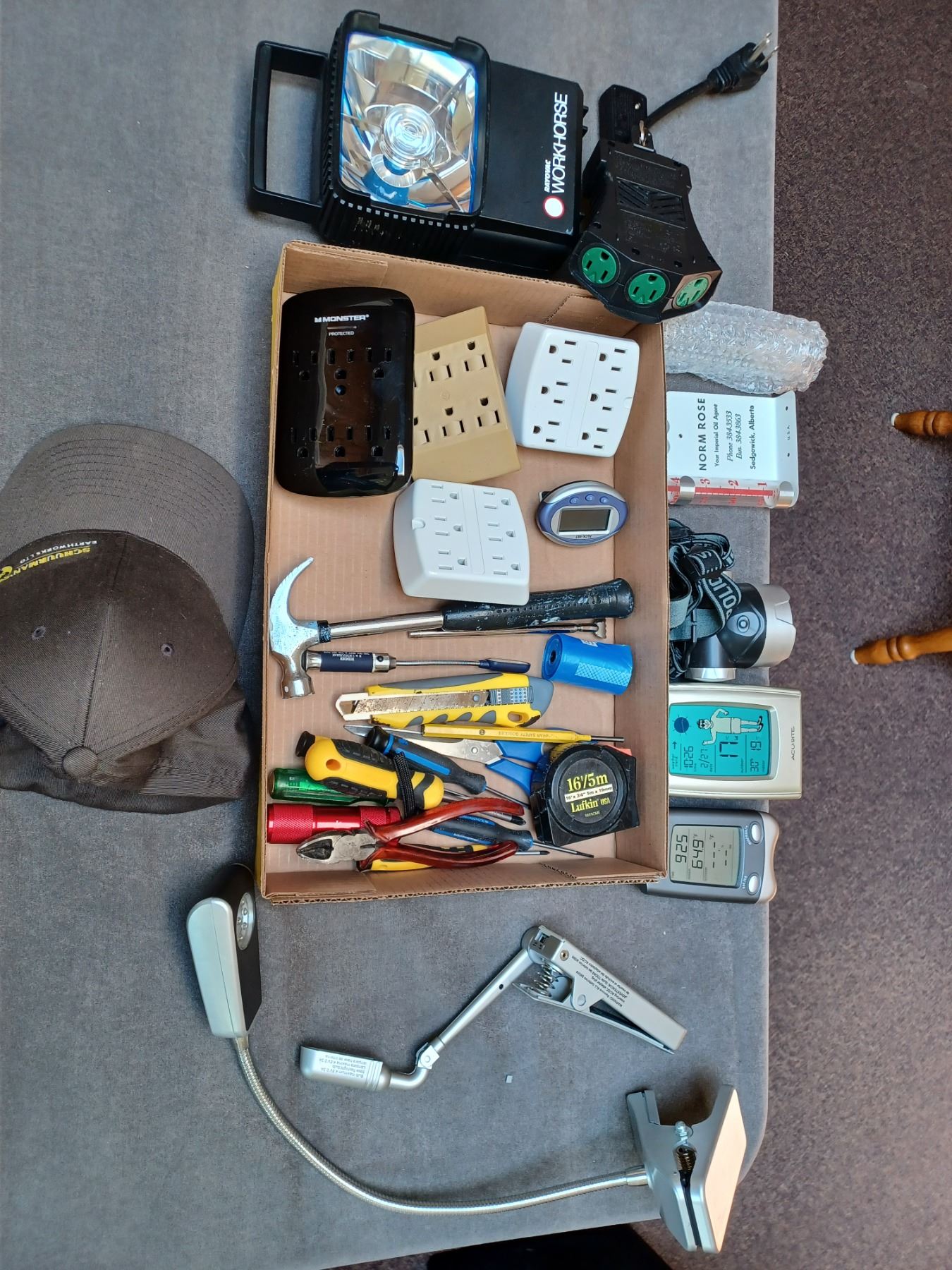 ASSORTED TOOLS, MULTIPLUG, PLUG WITH ON/OFF REMOTE, AND VARIOUS LIGHTS