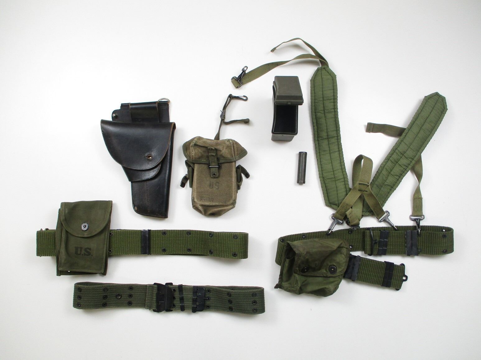 ASSORTED U.S. MILITARY LOT, LOT INCLUDES; (1) BELT WITH POCKET MAGAZINE POUCH ATTACHED, POUCH MARKED: "US" & "1950", OAL APPROX. 38", ADJUSTABLE, (1) BELT WITH SHOULDER STRAPS & MEDICAL CASE ATTACHED, OAL APPROX. 40", ADJUSTABLE, (1) BELT OAL APPROX. 38", ADJUSTABLE, (1) POUCH MARKED: "US" & OTHER FAINT MARKINGS & (1) BLACK LEATHER HOLSTER, NO VISIBLE MARKINGS.