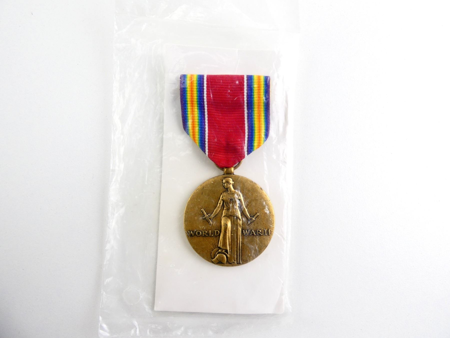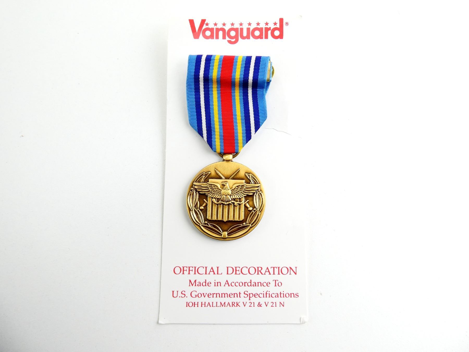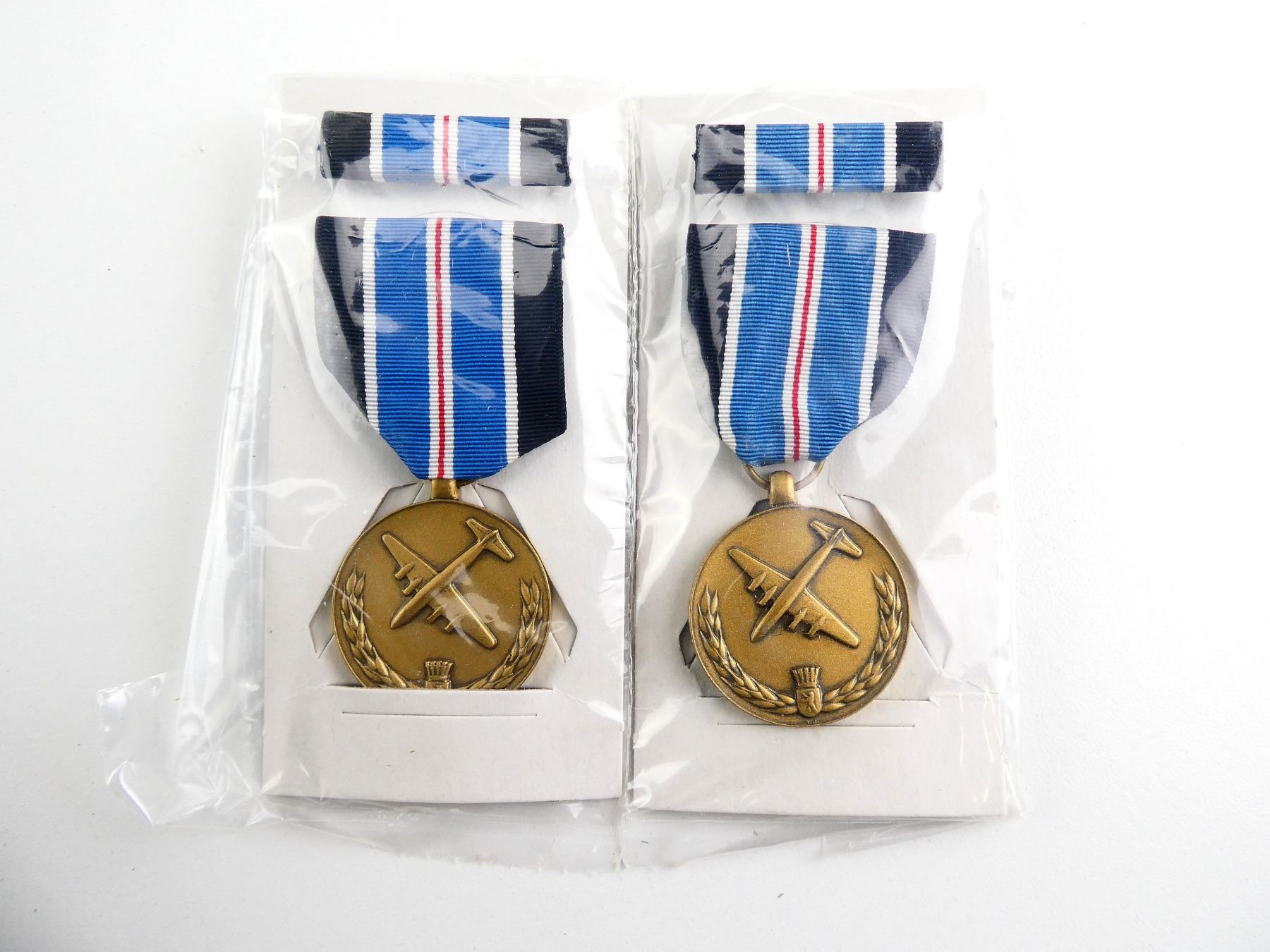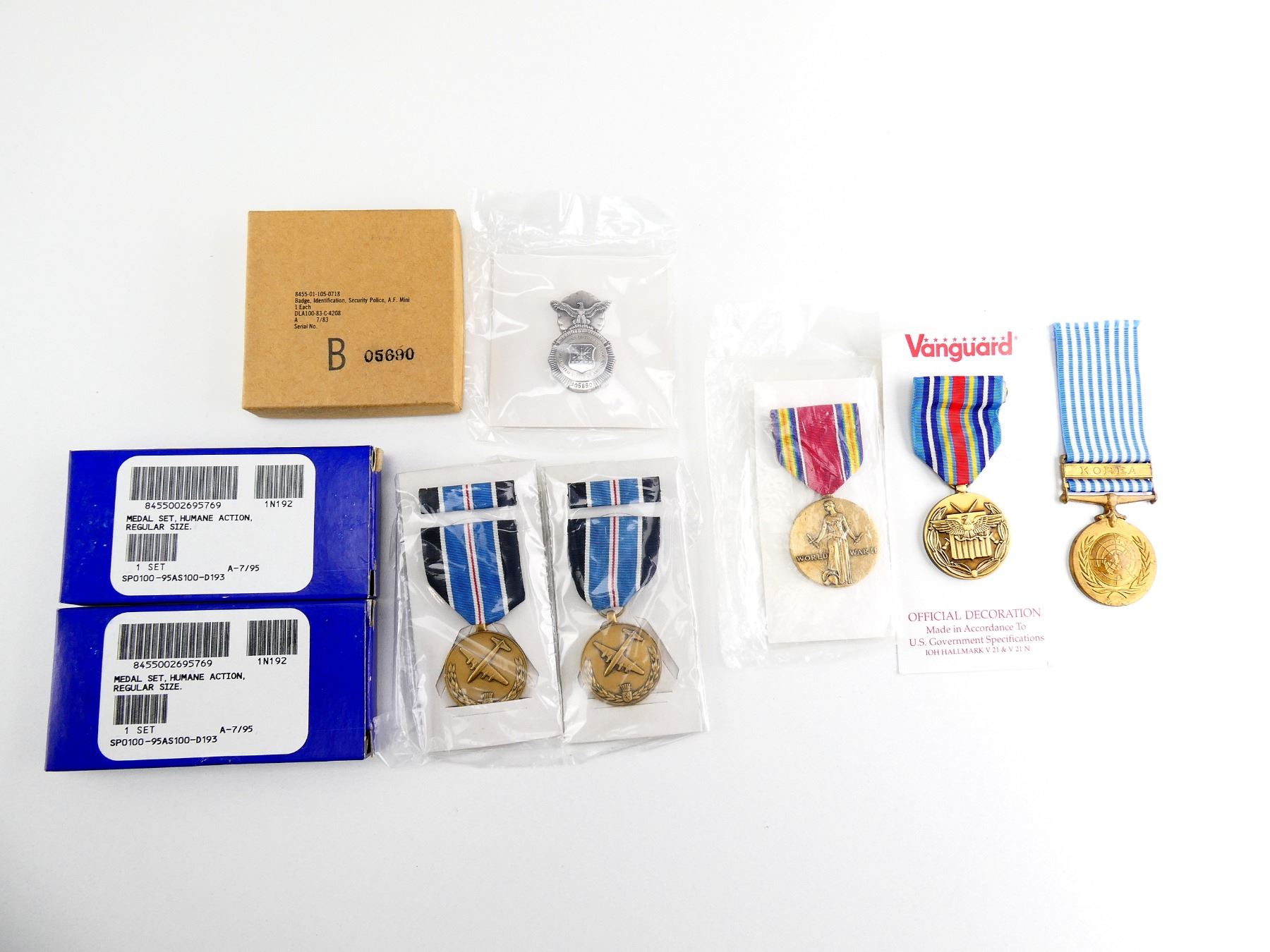 LOT INCLUDES; (1) UN-NAMED GLOBAL WAR ON TERRORISM EXPEDITIONARY MEDAL WITH RIBBON, APPEARS NOS, (2) UN-NAMED MEDAL FOR HUMANE ACTION WITH RIBBONS, RIBBON BARS & ORIGINAL PACKAGING, APPEARS NOS, (1) UN-NAMED THE WORLD WAR II VICTORY MEDAL WITH RIBBON, APPEARS NOS, (1) UN-NAMED UNITED NATIONS SERVICE MEDAL KOREA WITH RIBBON & (1) MINI DEPARTMENT OF THE AIR FORCE SECURITY POLICE BADGE WITH ORIGINAL PACKAGING, APPEARS NOS. SEE PHOTOS.