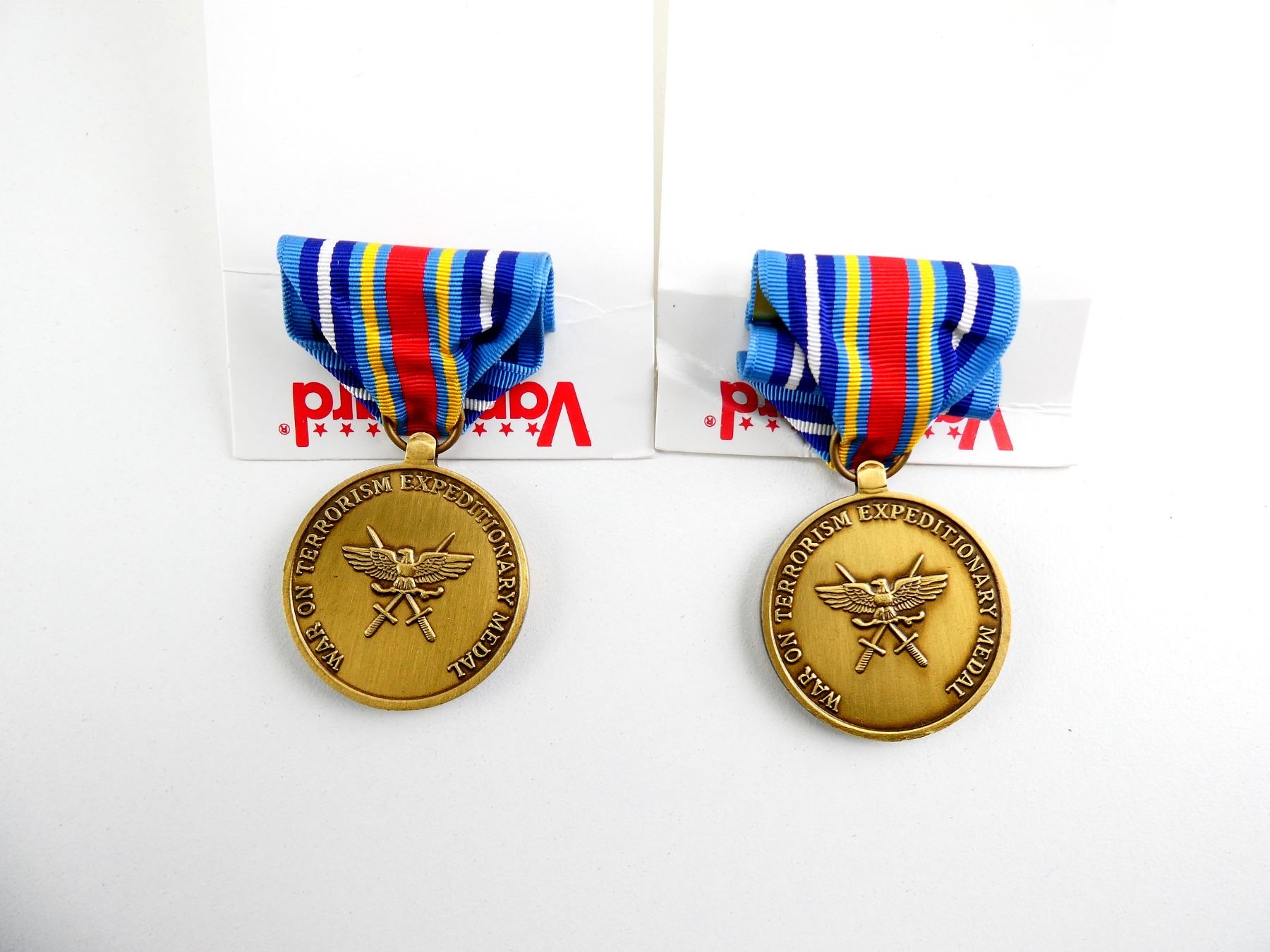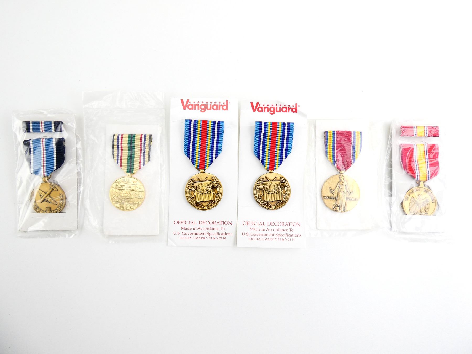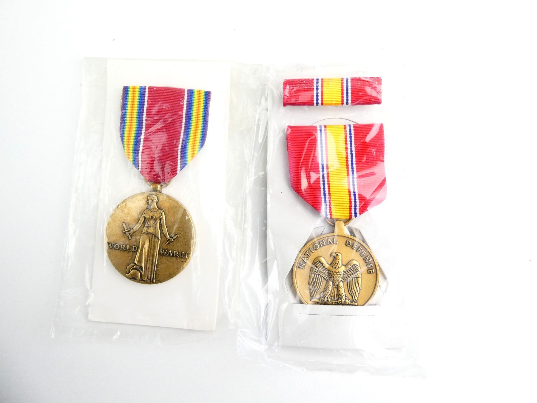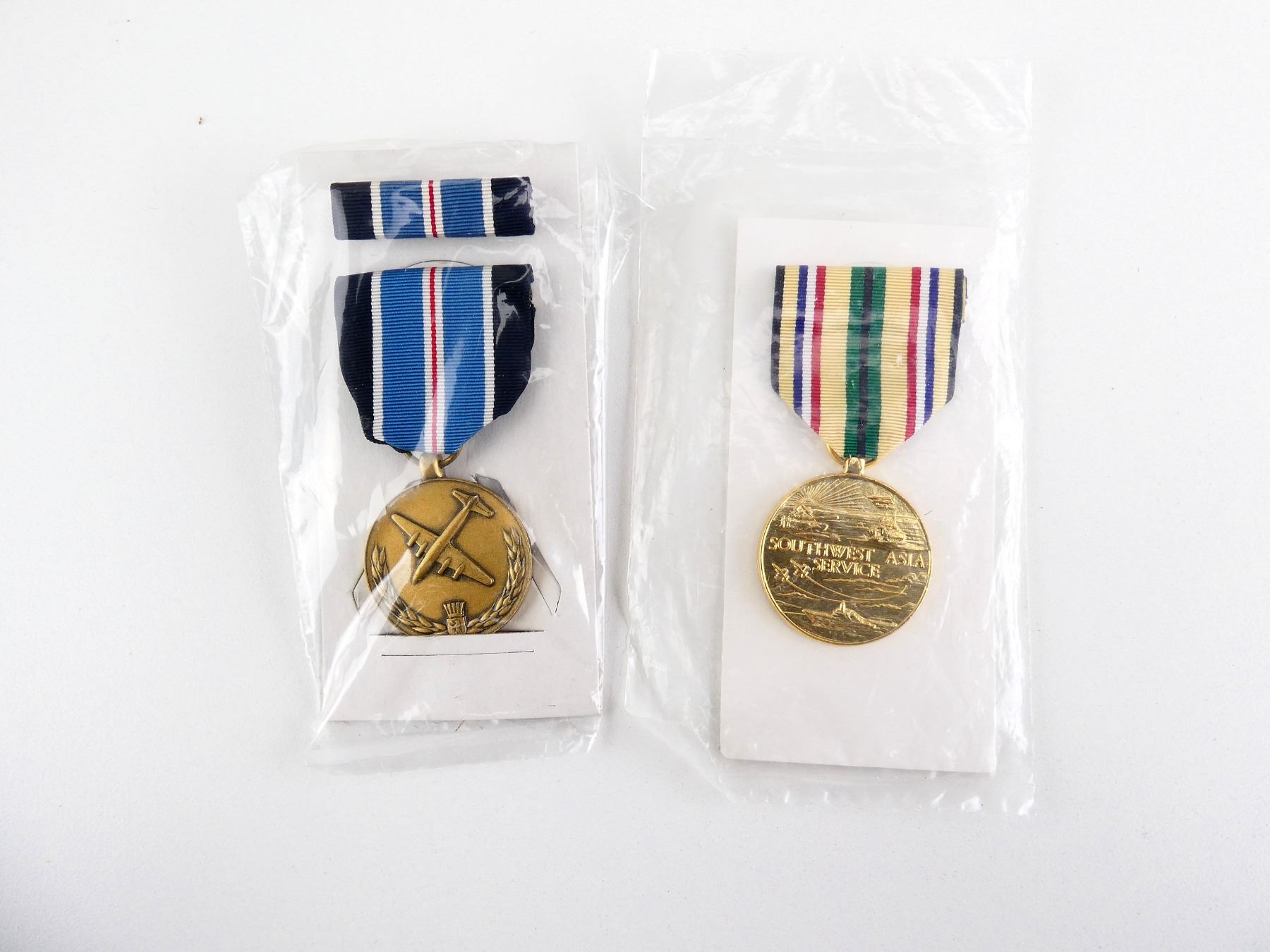 LOT INCLUDES; (1) UN-NAMED SOUTHWEST ASIA SERVICE MEDAL WITH RIBBON, APPEARS NOS, (2) UN-NAMED GLOBAL WAR ON TERRORISM EXPEDITIONARY MEDAL WITH RIBBONS, APPEARS NOS, (1) UN-NAMED MEDAL FOR HUMANE ACTION WITH RIBBON, RIBBON BAR & ORIGINAL PACKAGING, APPEARS NOS, (1) UN-NAMED NATIONAL DEFENSE SERVICE MEDAL WITH RIBBON, RIBBON BAR & ORIGINAL PACKAGING, APPEARS NOS & (1) UN-NAMED THE WORLD WAR II VICTORY MEDAL WITH RIBBON, APPEARS NOS. SEE PHOTOS.