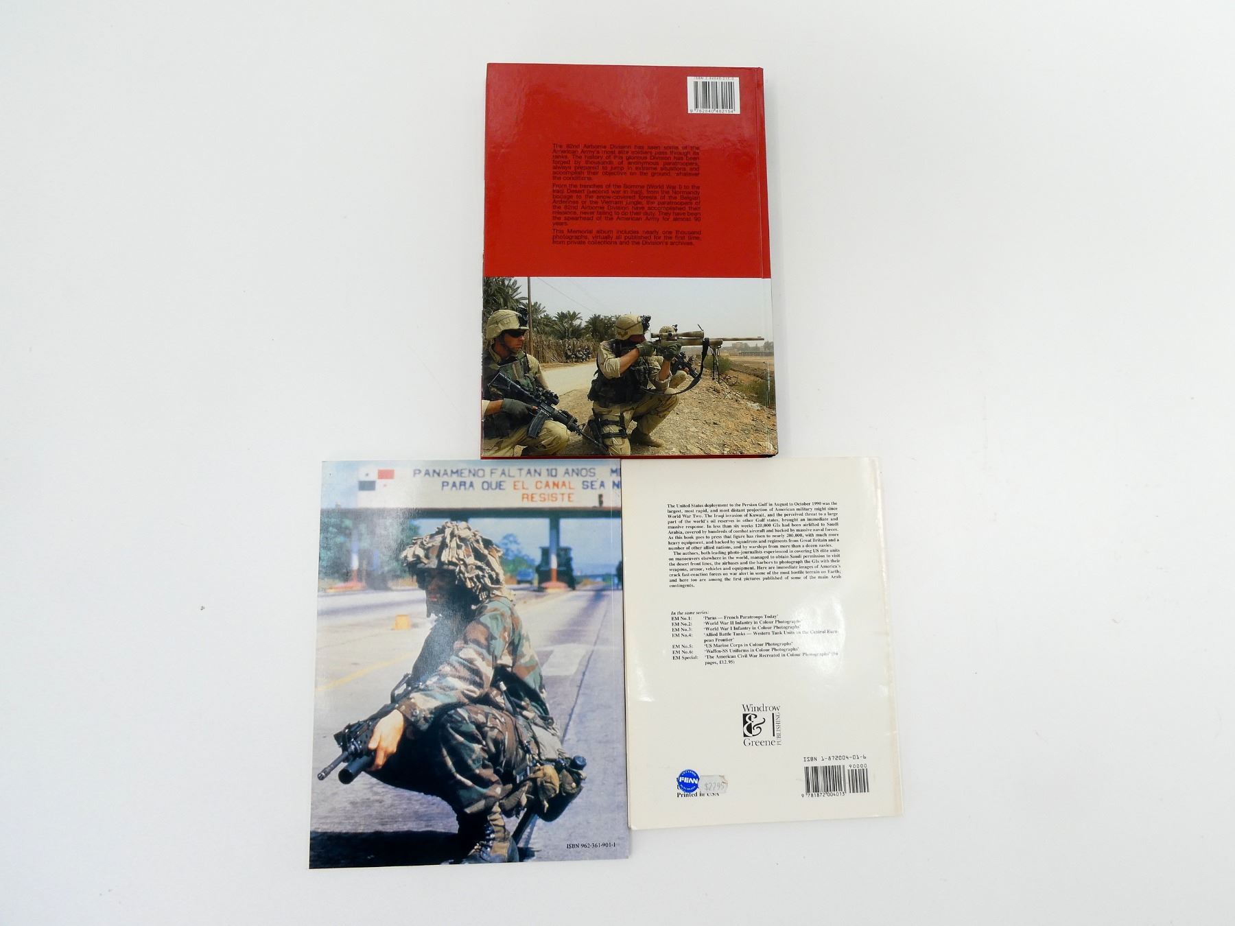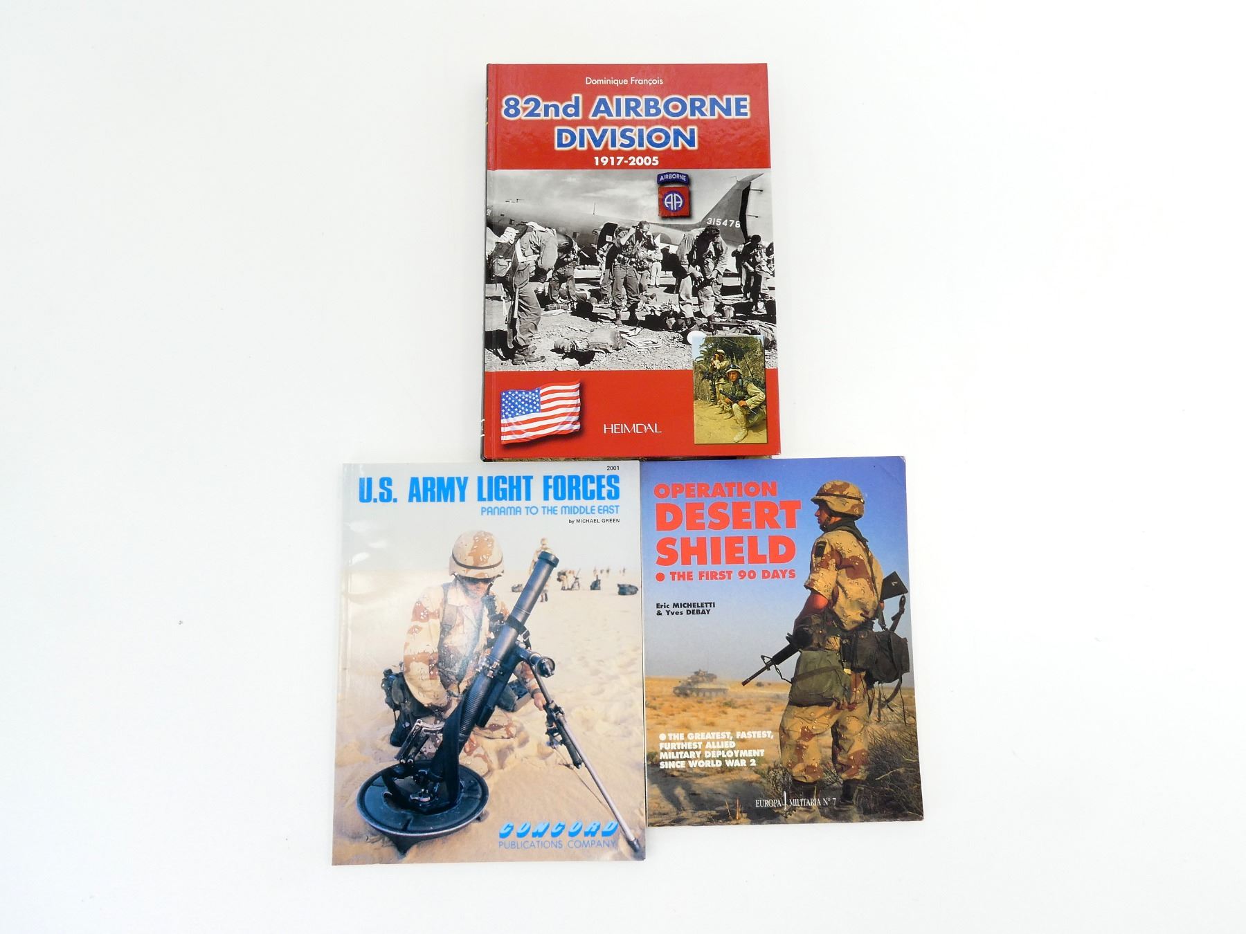 LOT INCLUDES; (1) "OPERATION DESERT SHIELD - THE FIRST 90 DAYS" BOOK BY ERIC MICHELETTI AND YVES DEBAY, SOFT COVER, ISBN: 1-872004-01-6, (1) U.S. ARMY LIGHT FORCES, PANAMA TO THE MIDDLE EAST" BOOK BY MICHAEL GREEN, SOFT COVER, ISBN: 962-361-901-1 & (1) "82ND AIRBORNE DIVISION 1917-2005" BOOK BY DOMINIQUE FRANCOIS, HARD COVER, ISBN: 2-84048-215-0. SEE PHOTOS.