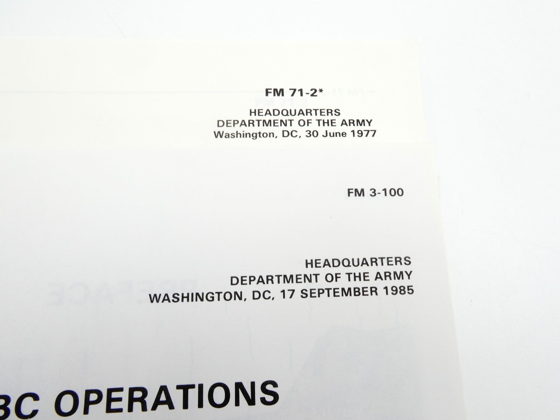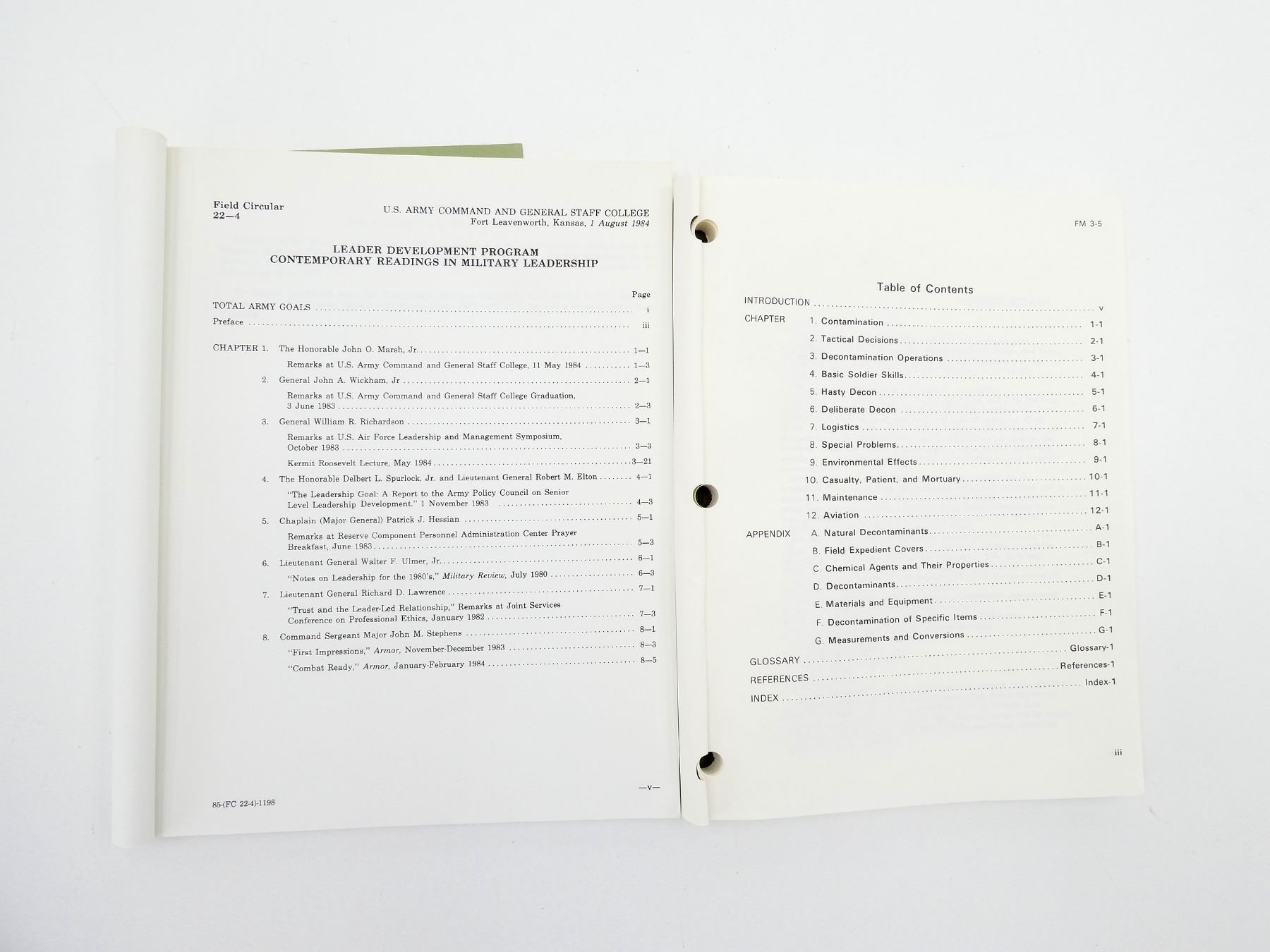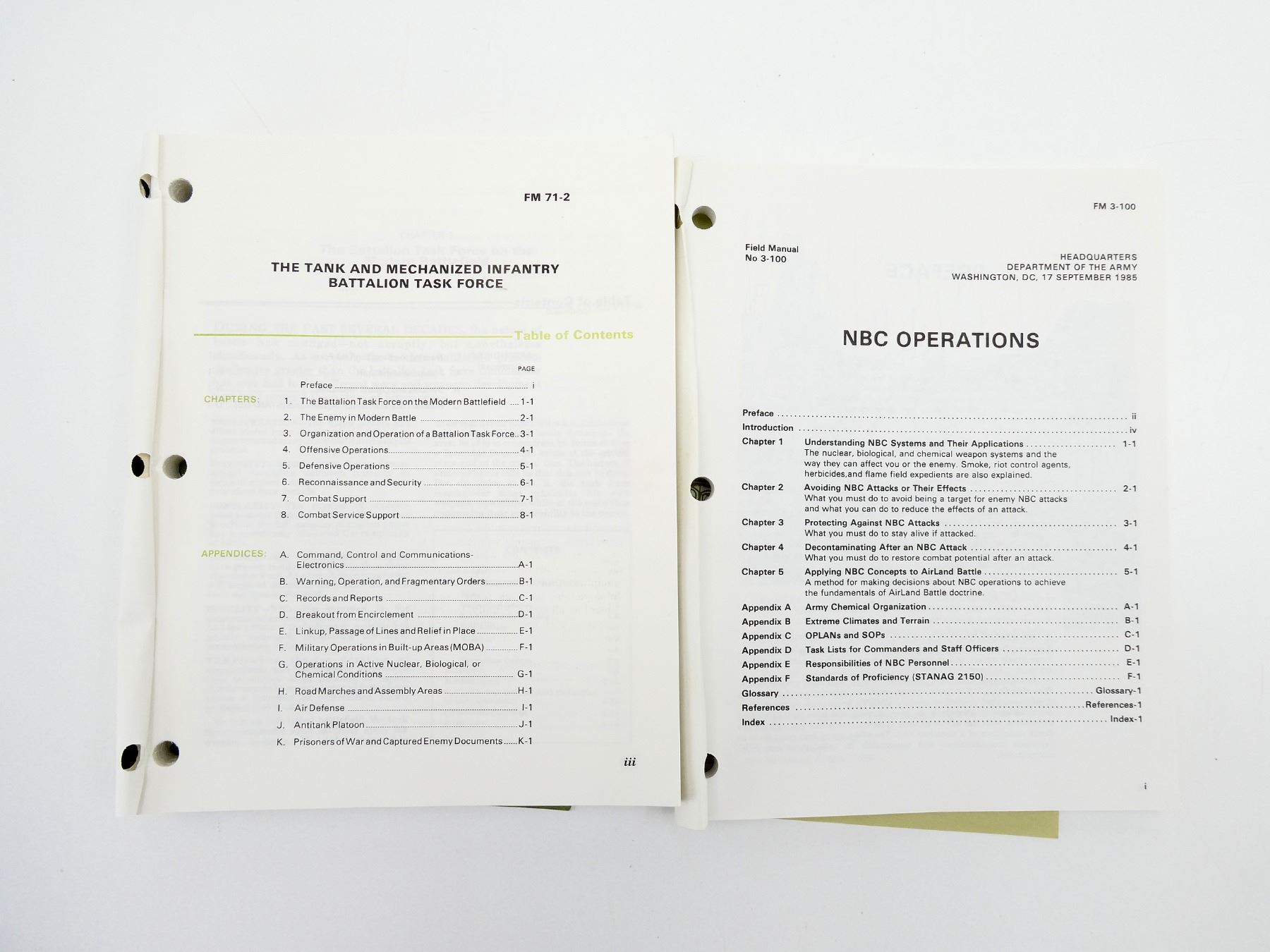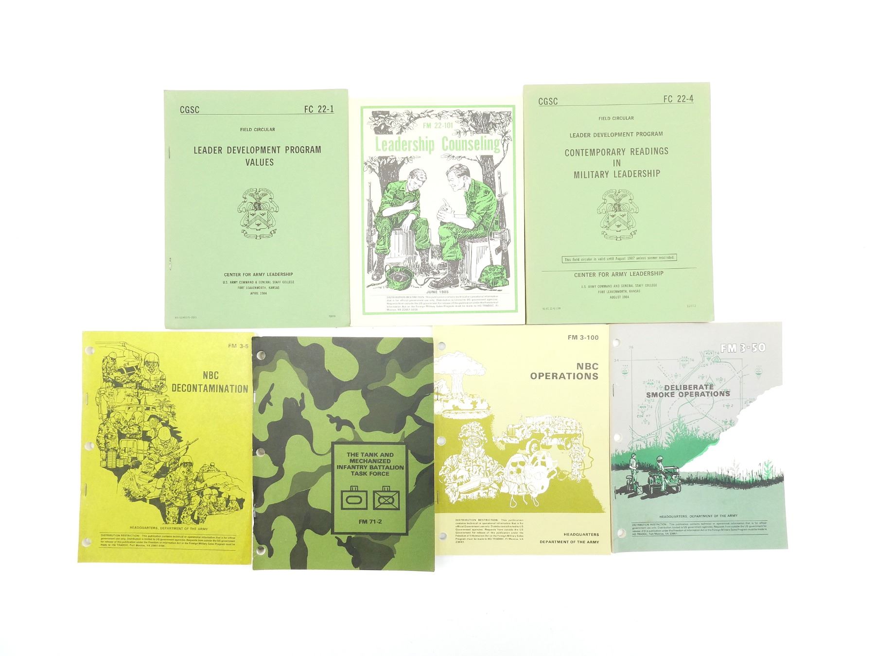 SOFT COVERS, LOT INCLUDES; (1) "THE TANK AND MECHANIZED INFANTRY BATTALION TASK FORCE" MANUAL, (1) "NBC OPERATIONS" MANUAL, (1) "DELIBERATE SMOKE OPERATIONS" MANUAL, (1) "NBC DECONTAMINATION" MANUAL, (1) "LEADERSHIP COUNSELING" MANUAL, (1) "LEADER DEVELOPMENT PROGRAM VALUES" MANUAL & (1) "LEADER DEVELOPMENT PROGRAM CONTEMPORARY READINGS IN MILITARY LEADERSHIP" MANUAL. SEE PHOTOS.