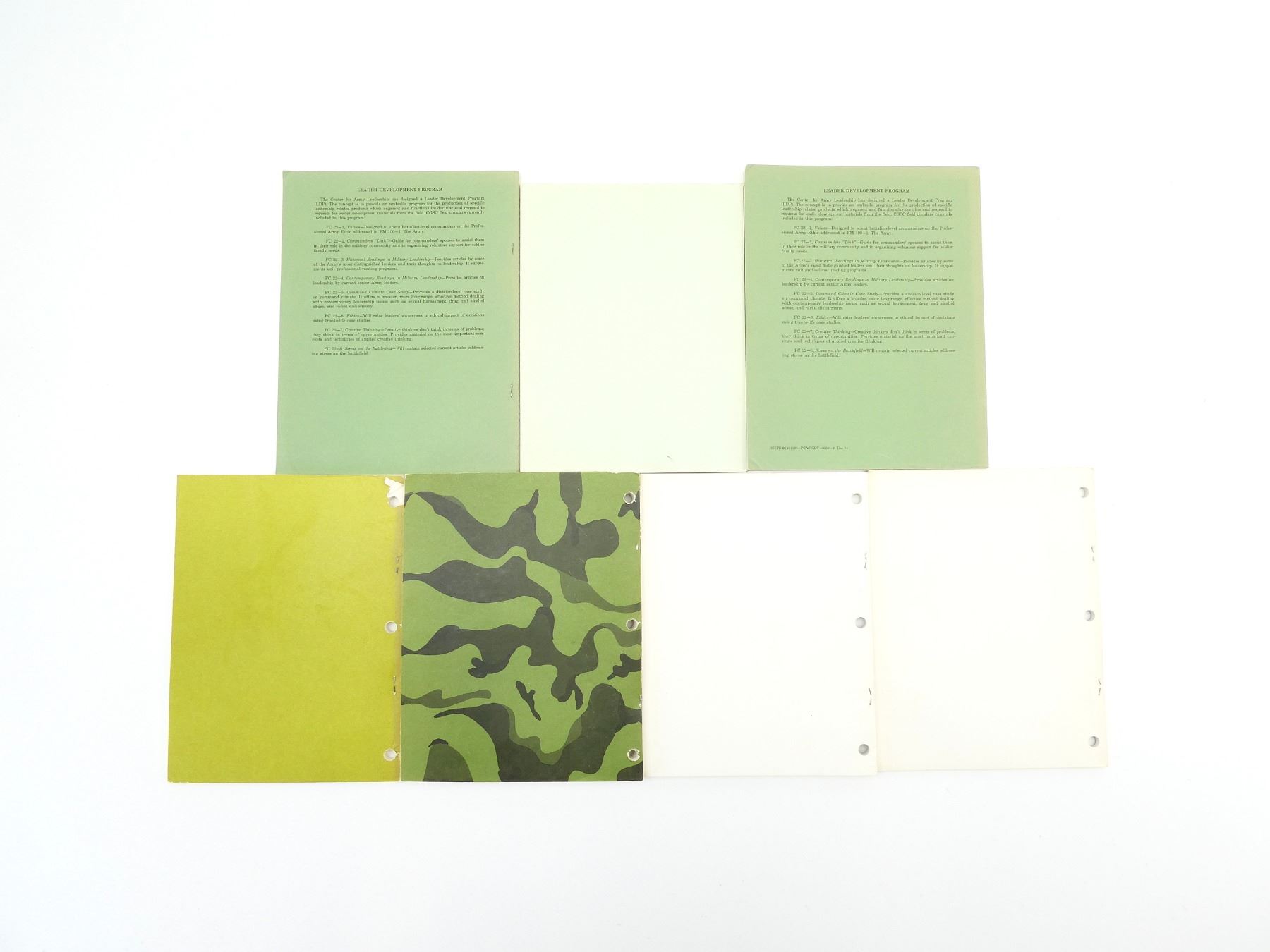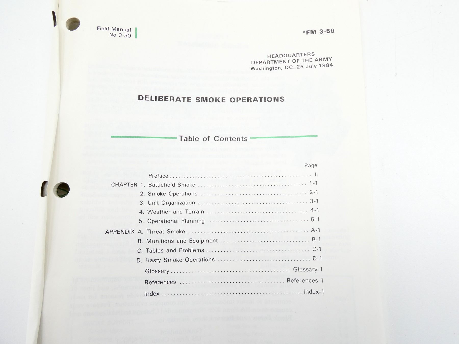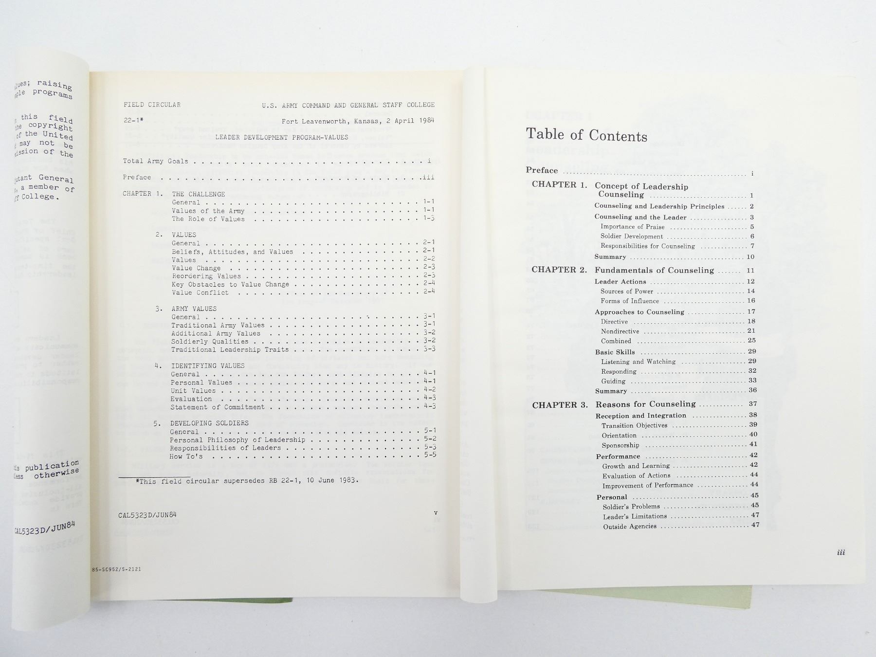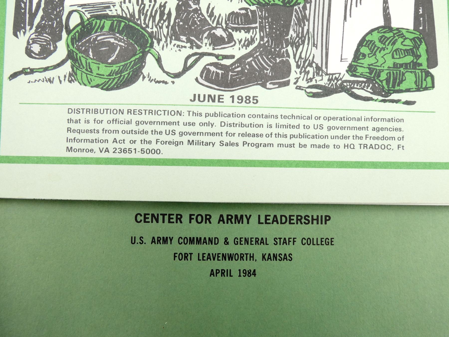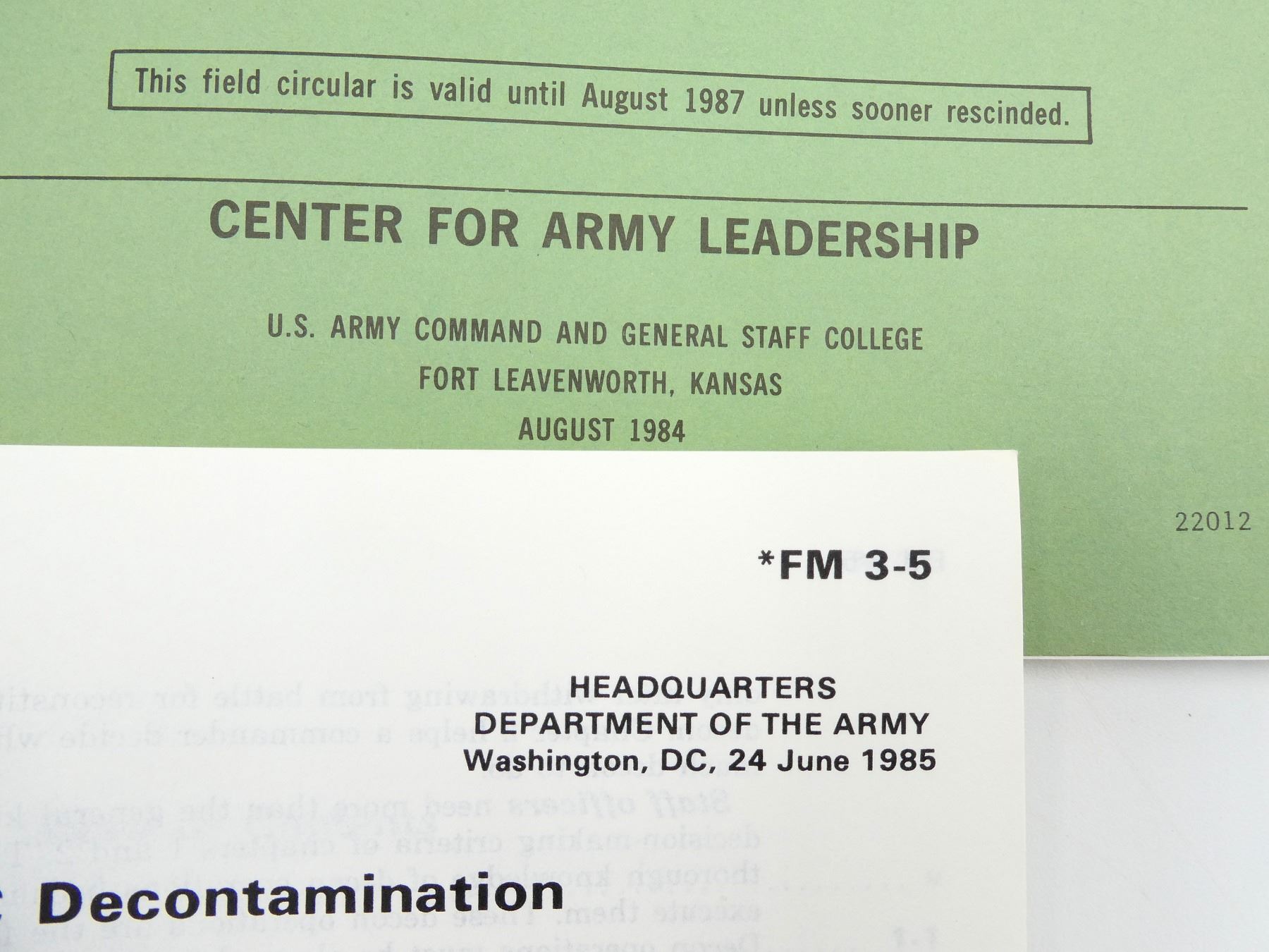 SOFT COVERS, LOT INCLUDES; (1) "THE TANK AND MECHANIZED INFANTRY BATTALION TASK FORCE" MANUAL, (1) "NBC OPERATIONS" MANUAL, (1) "DELIBERATE SMOKE OPERATIONS" MANUAL, (1) "NBC DECONTAMINATION" MANUAL, (1) "LEADERSHIP COUNSELING" MANUAL, (1) "LEADER DEVELOPMENT PROGRAM VALUES" MANUAL & (1) "LEADER DEVELOPMENT PROGRAM CONTEMPORARY READINGS IN MILITARY LEADERSHIP" MANUAL. SEE PHOTOS.