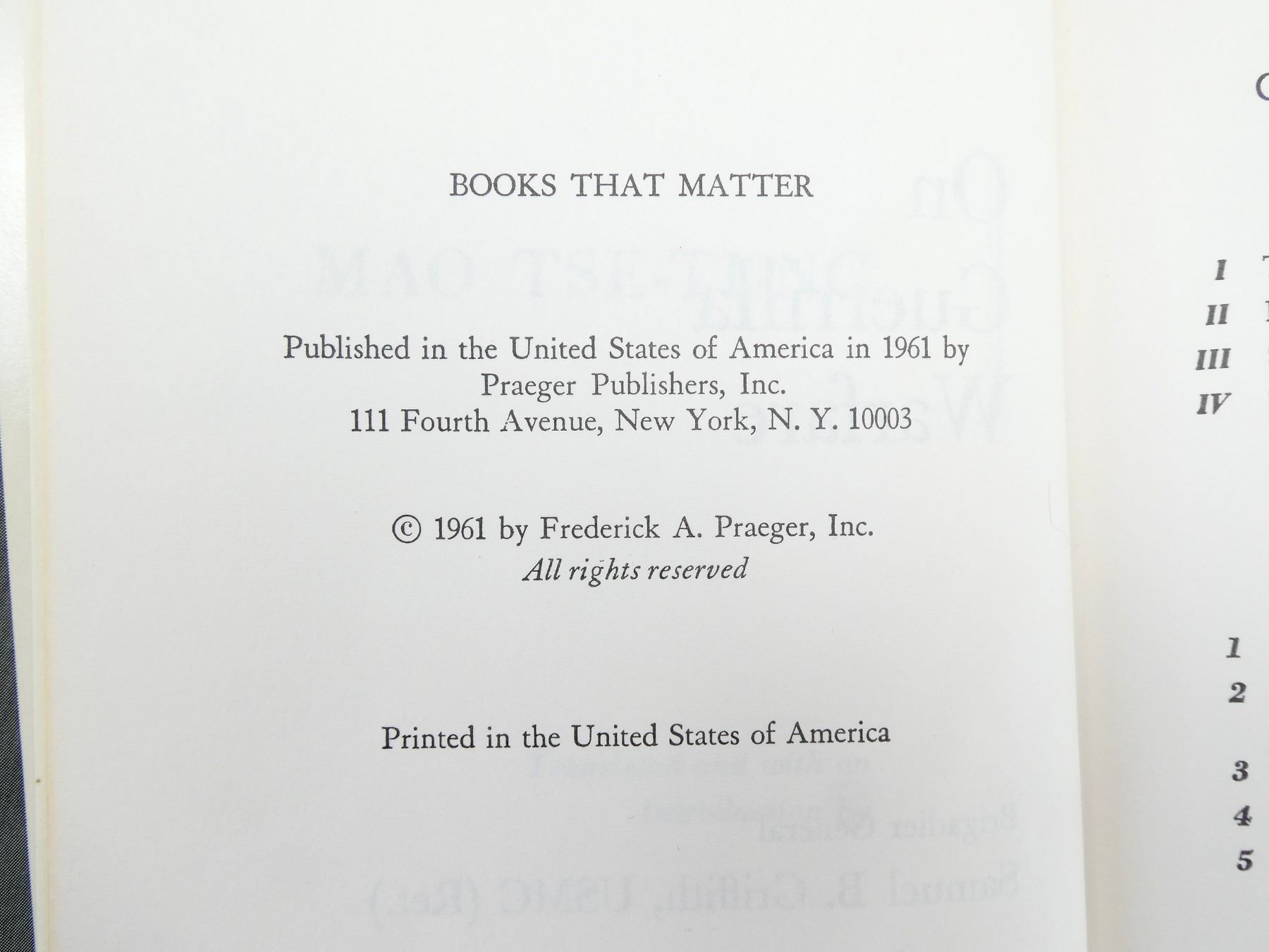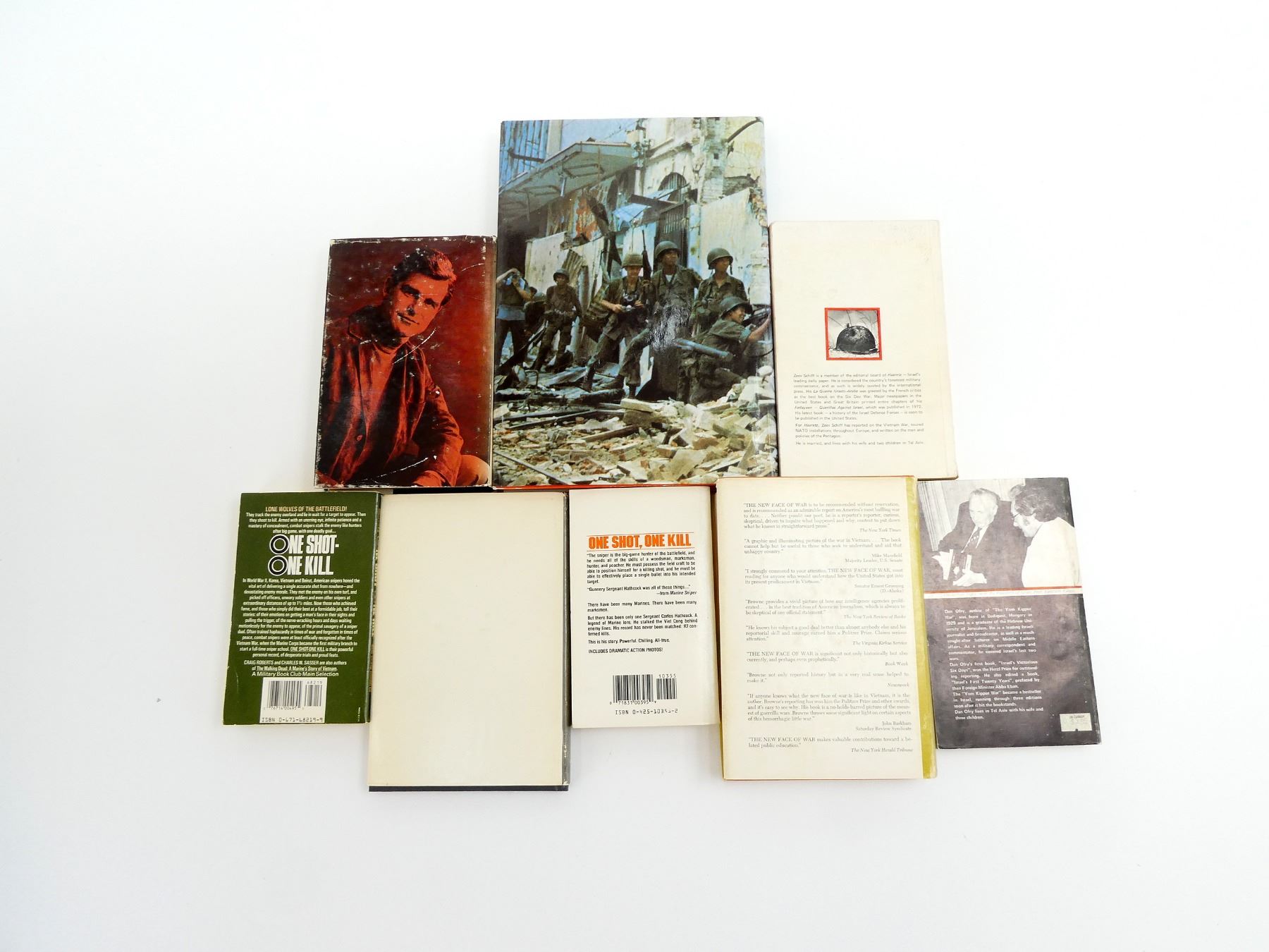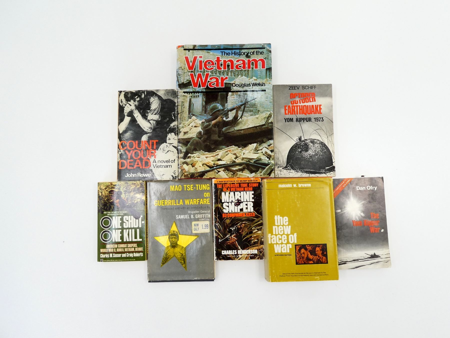 LOT INCLUDES; (1) "MAO TSE-TUNG ON GUERRILLA WARFARE" BOOK TRANSLATED BY SAMUEL B. GRIFFITH, HARD COVER WITH DUST COVER, COPYRIGHT 1961, (1) "THE TOM KIPPUR WAR" BOOK BY DAN OFRY, SOFT COVER, COPYRIGHT 1974, (1) "OCTOBER EARTHQUAKE, YOM KIPPUR 1973" BOOK BY ZEEV SCHIFF, COPYRIGHT 1974, (1) "MARINE SNIPER" BOOK BY CHARLES HENDERSON, SOFT COVER, ISBN: 0-425-10355-2, (1) "ONE SHOT - ONE KILL" BOOK BY CHARLES W. SASSER & CRAIG ROBERTS, SOFT COVER, ISBN: 0-671-68219-9, (1) "THE NEW FACE OF WAR" BOOK BY MALCOLM W. BROWNE, HARD COVER WITH DUST COVER, COPYRIGHT 1968, (1) "COUNT YOUR DEAD" BOOK BY JOHN ROWE, HARD COVER WITH DUST COVER, SBN: 207-95022-9 & (1) "THE HISTORY OF THE VIETNAM WAR" BOOK BY DOUGLAS WELSH, HARD COVER WITH DUST COVER, ISBN: 0-600-34220-4. SEE PHOTOS.