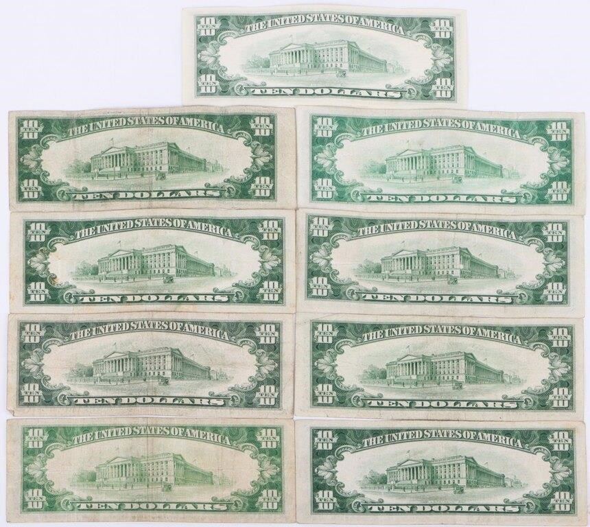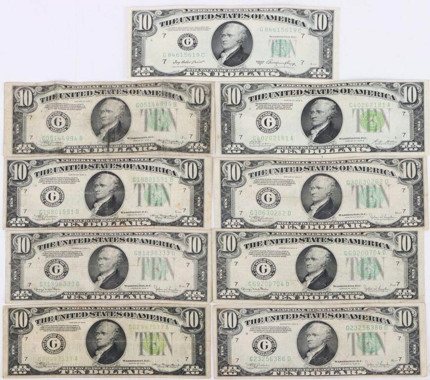 Assorted vintage $10 Hamilton U.S. banknotes to include: one series 1928 B Hamilton $10 bill, seven series 1934 Hamilton $10 bills, and one 1950 A Hamilton $10 bill.