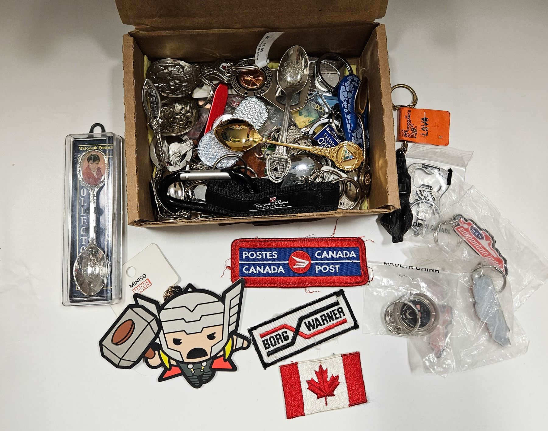 ASSORTED VINTAGE KEYCHAINS PINS SPOONS