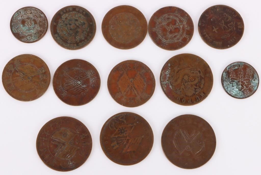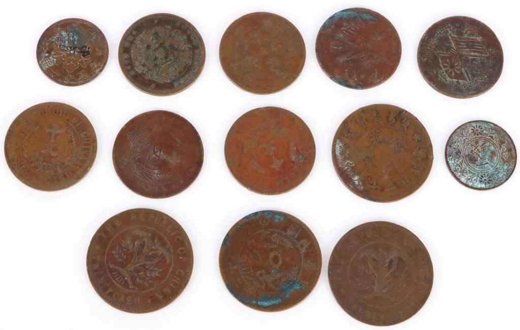 Assorted vintage Republic of China & amp; Hu Poo coins to include: one 1903-05 Hu Poo 20 Cash coin, two1903-05 Hu Poo 10 Cash coins, three 20 Cash Republic of China coins, five Republic of China 10 Cash coins, and two 1 sen coins.
