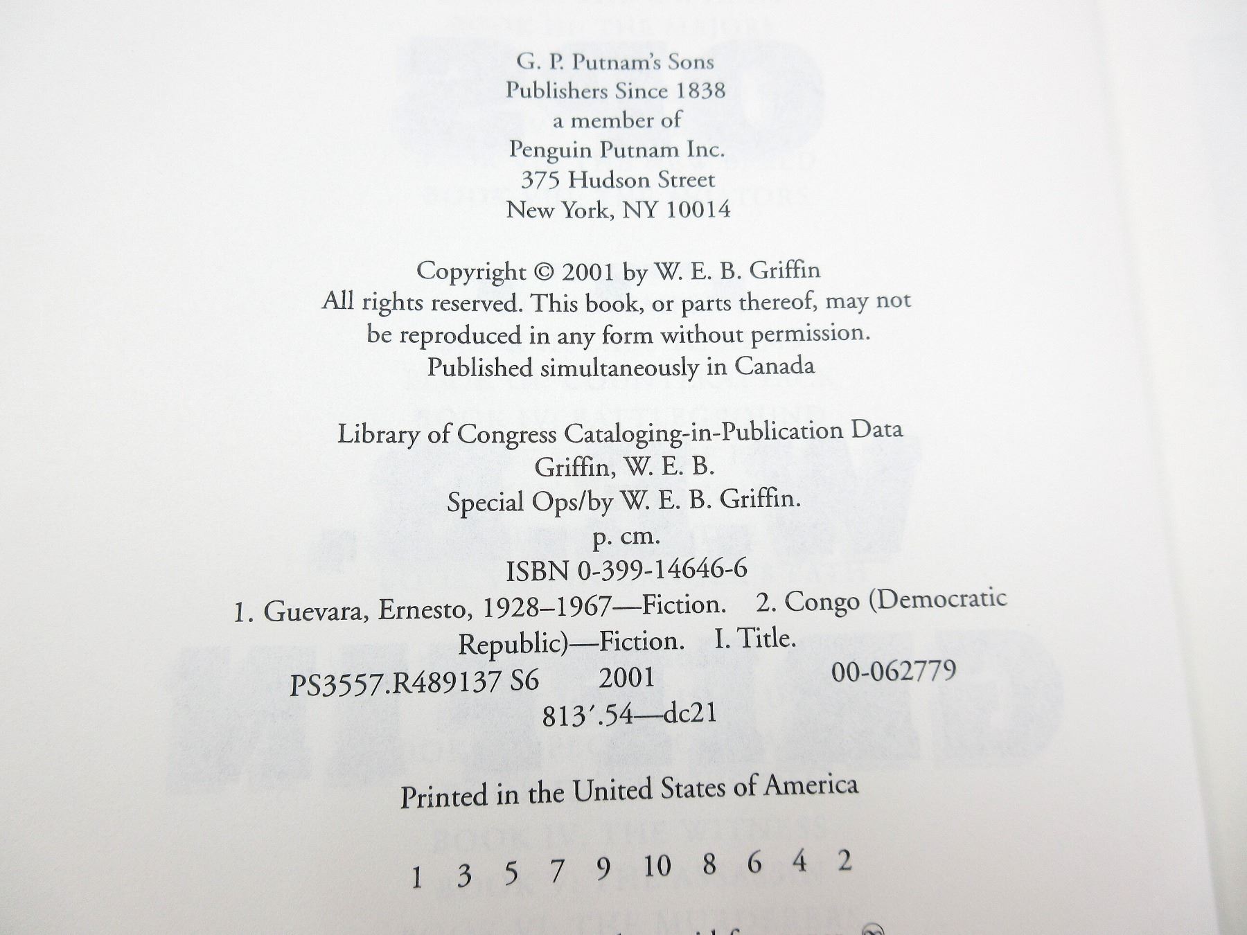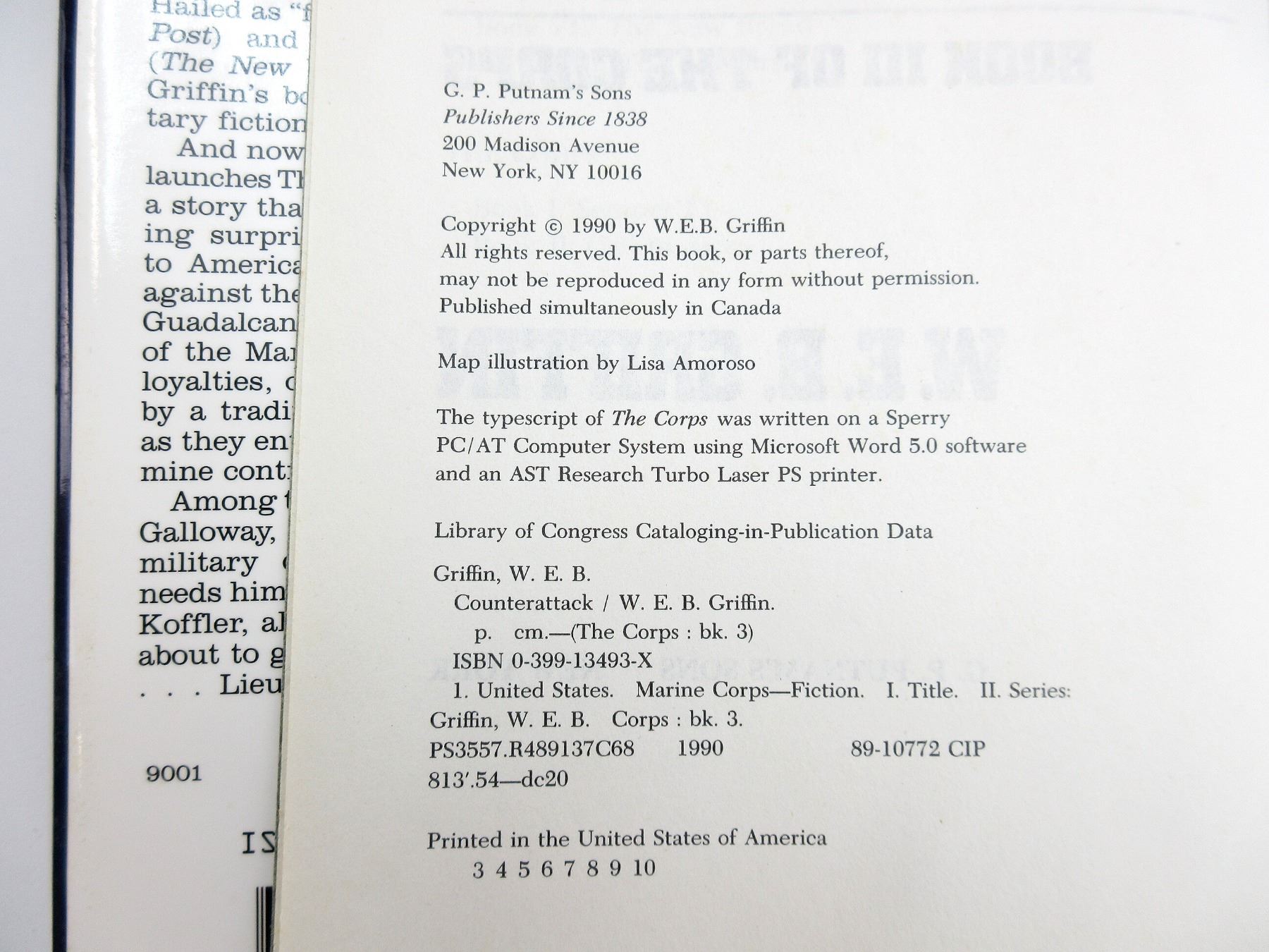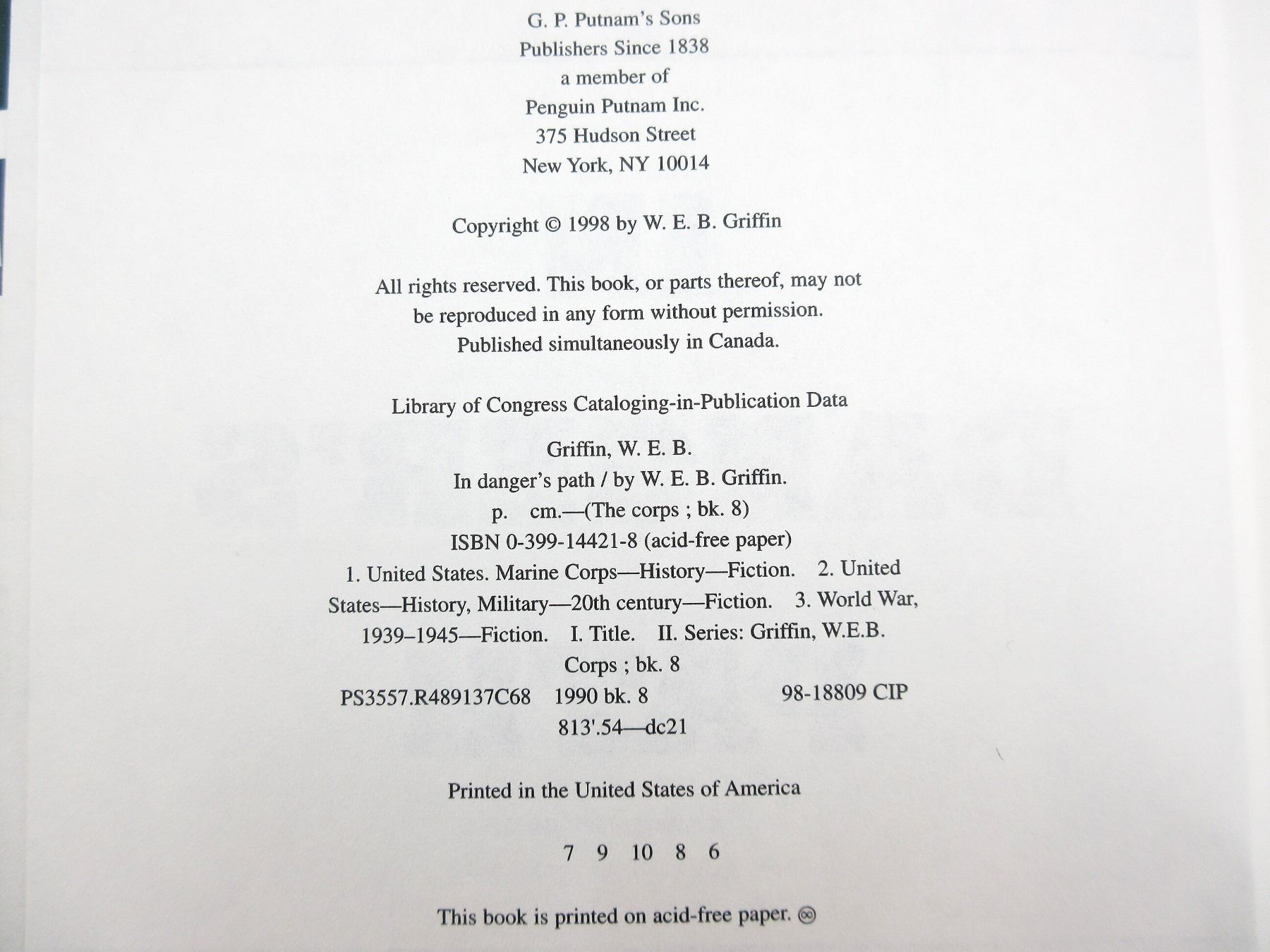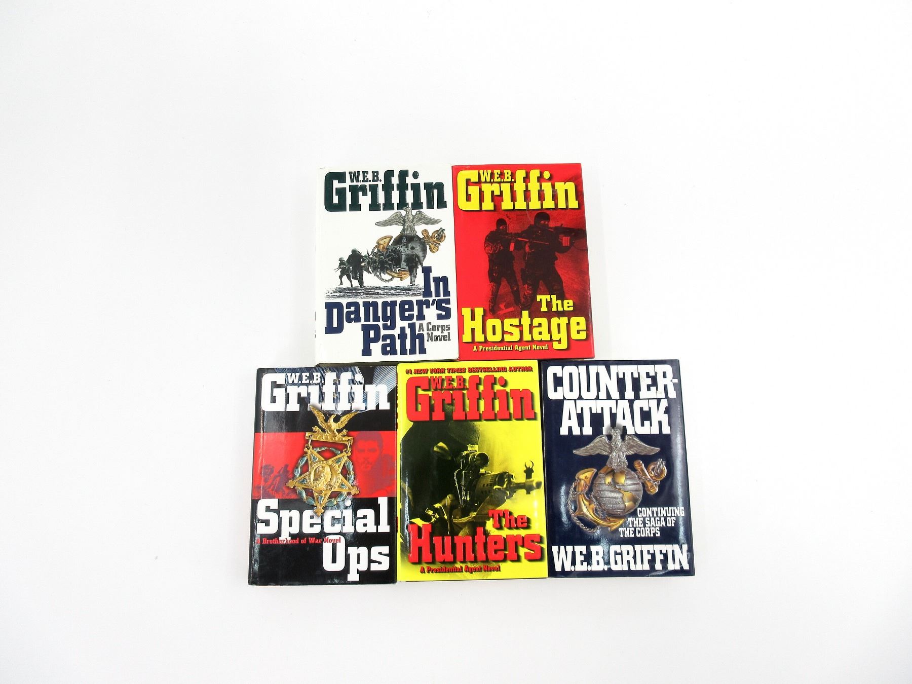 BOOKS BY W.E.B. GRIFFIN, HARD COVERS WITH DUST COVERS, LOT INCLUDES; (1) "THE HUNTERS", ISBN: 978-0-399-15379-2, (1) "COUNTER-ATTACK, BOOK III OF THE CORPS", ISBN: 0-399-13493-X, (1) "IN DANGER'S PATH", ISBN: 0-399-14421-8, (1) "SPECIAL OPS", ISBN: 0-399-14646-6 & (1) "THE HOSTAGE", ISBN: 0-399-15314-4. SEE PHOTOS.