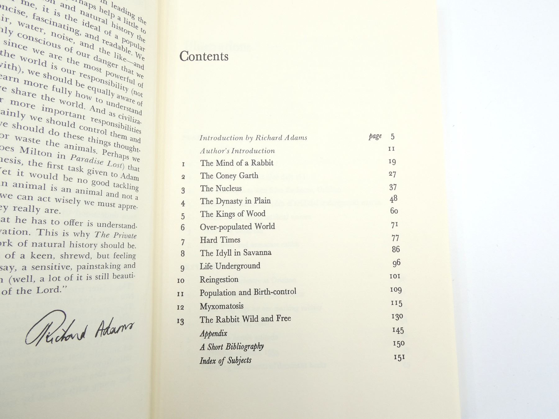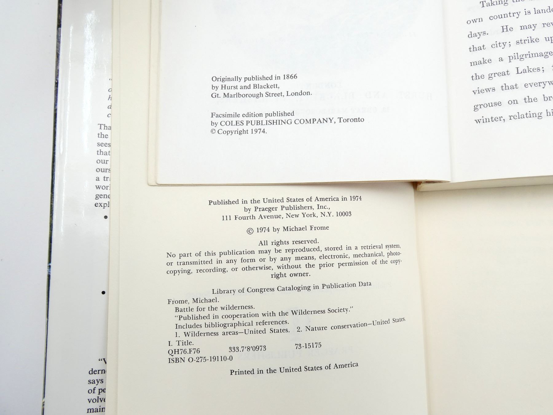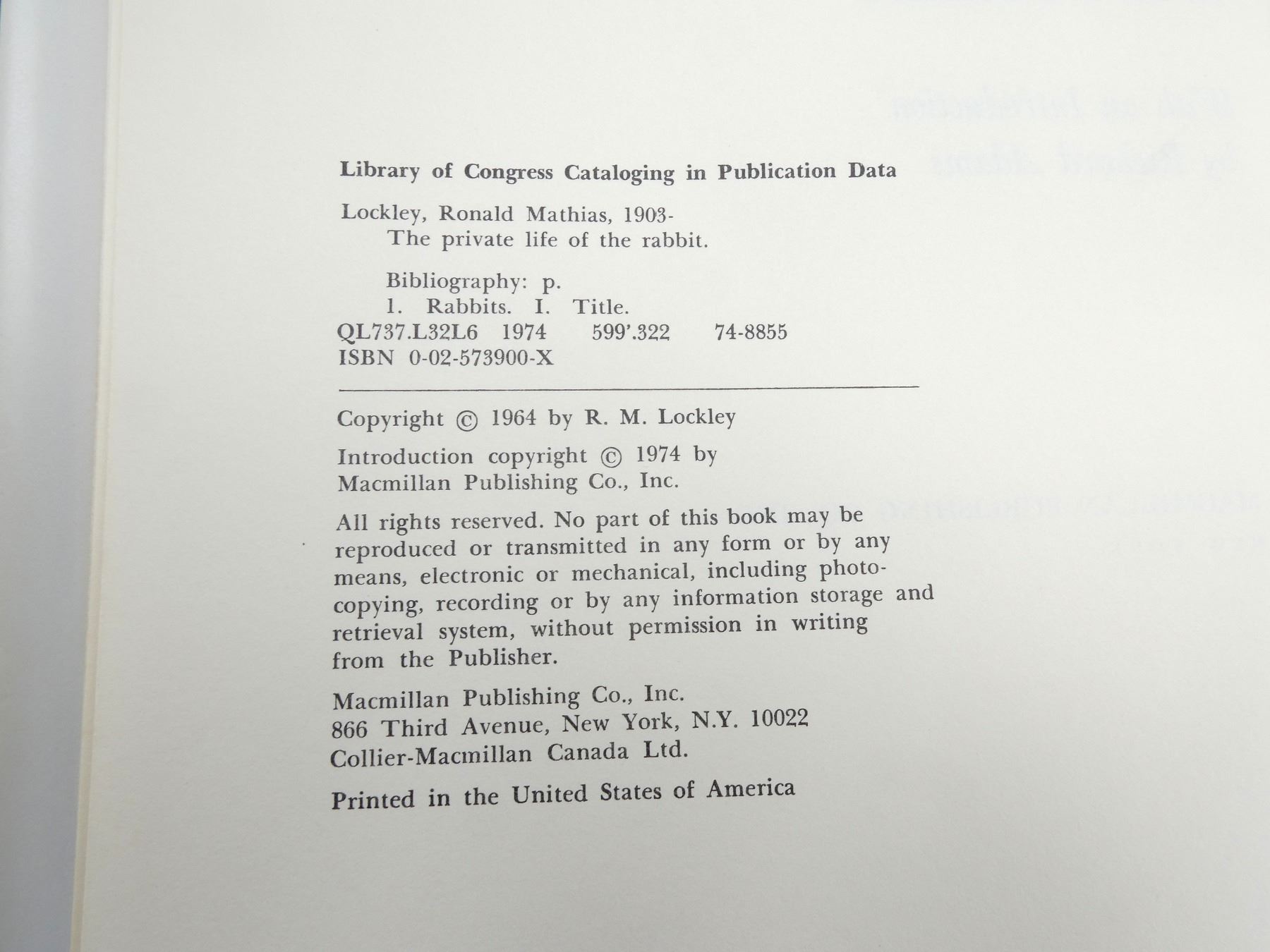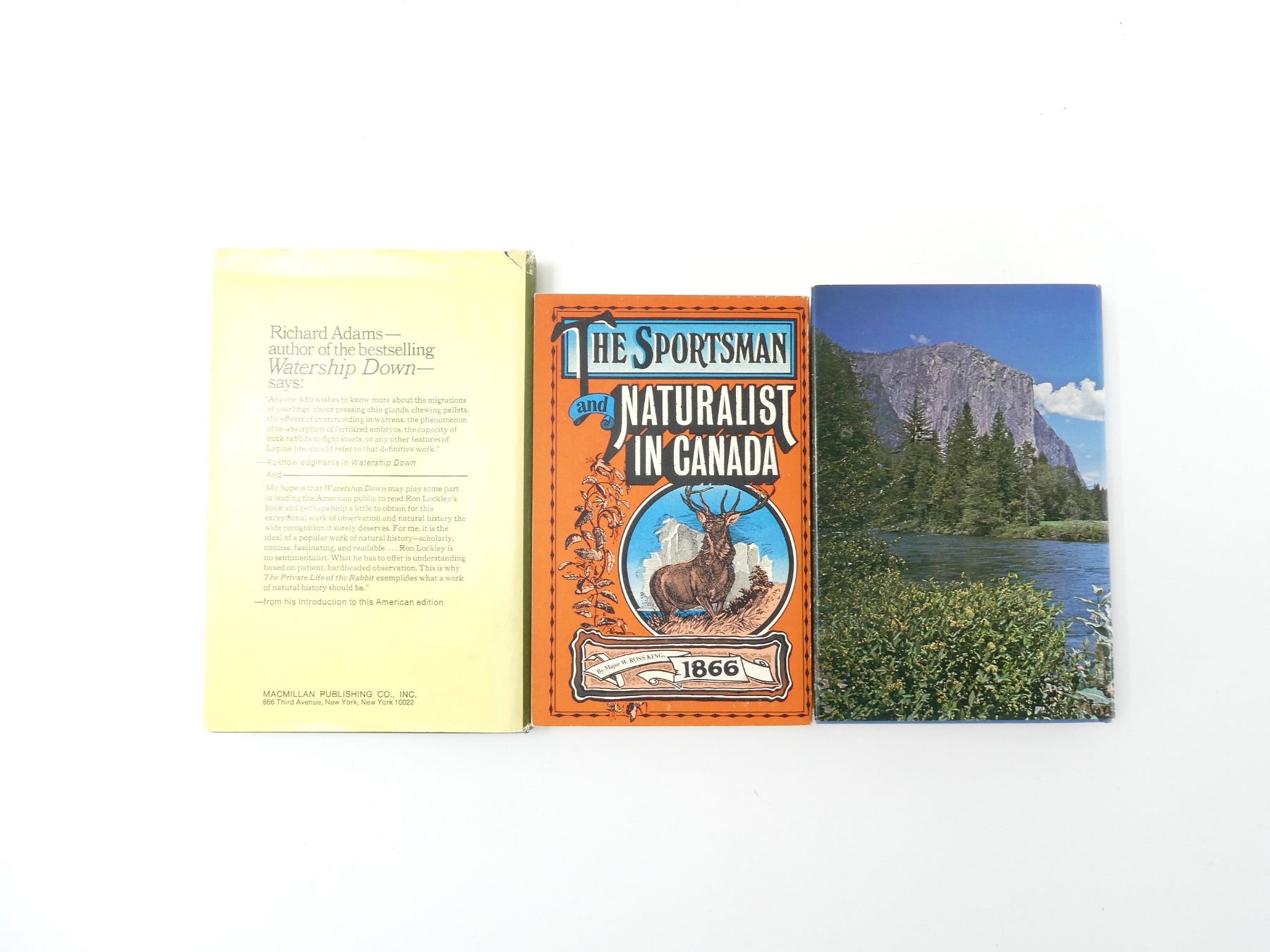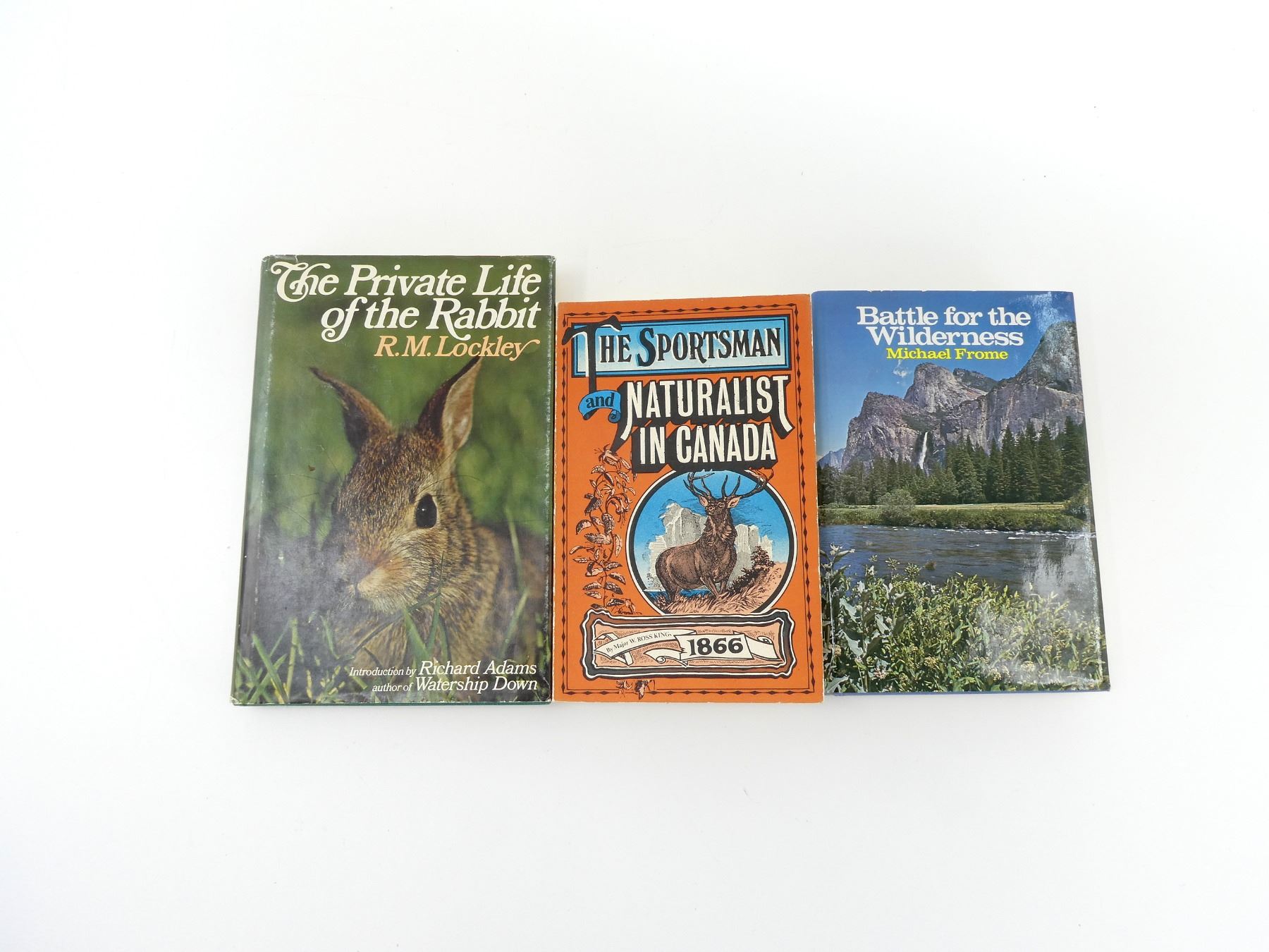 LOT INCLUDES; (1) "THE PRIVATE LIFE OF THE RABBIT" BOOK BY R.M. LOCKLEY, HARD COVER WITH DUST COVER, ISBN: 0-02-573900-X, (1) "THE SPORTSMAN AND NATURALIST IN CANADA" BOOK BY W. ROSS KING, SOFT COVER, COPYRIGHT 1974 & (1) "BATTLE FOR THE WILDERNESS" BOOK BY MICHAEL FROME, HARD COVER WITH DUST COVER, ISBN: O-275-19110-0. SEE PHOTOS.