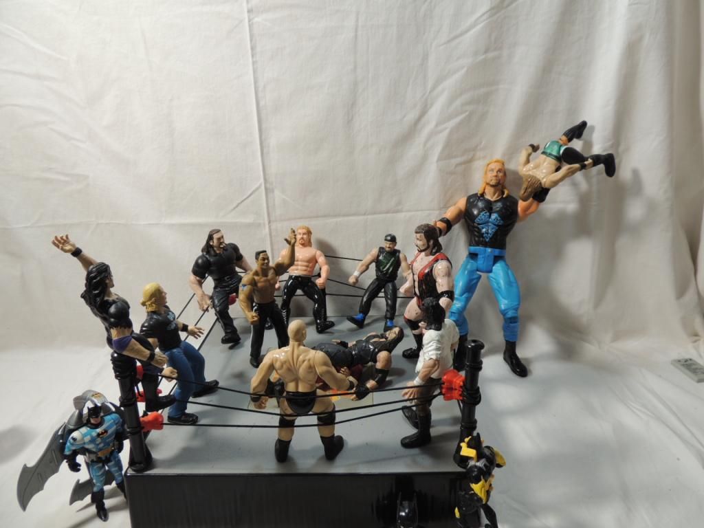 WCW MONDAY NITRO ARENA, 16 ACTION FIGURES. (13) WESTLING FIGURES (3) BATMAN FIGURES. ASSORTED MIXED CHARCTERS, THE ROCK, STONE COLD, VINTAGE WESTLERS, USED. AS SHOWN. SEE PHOTO FOR MORE DETAILS