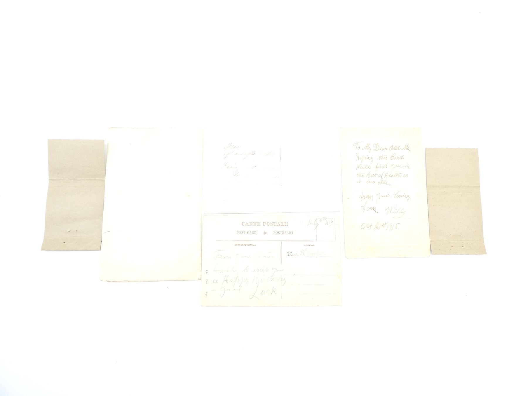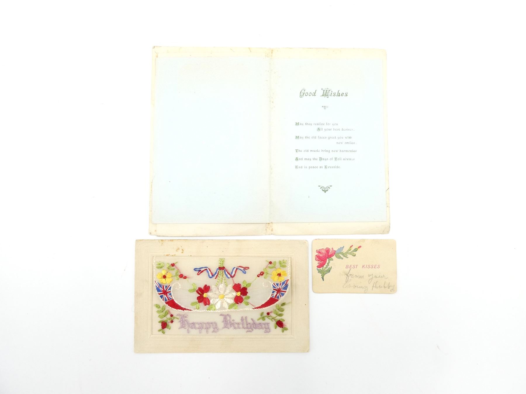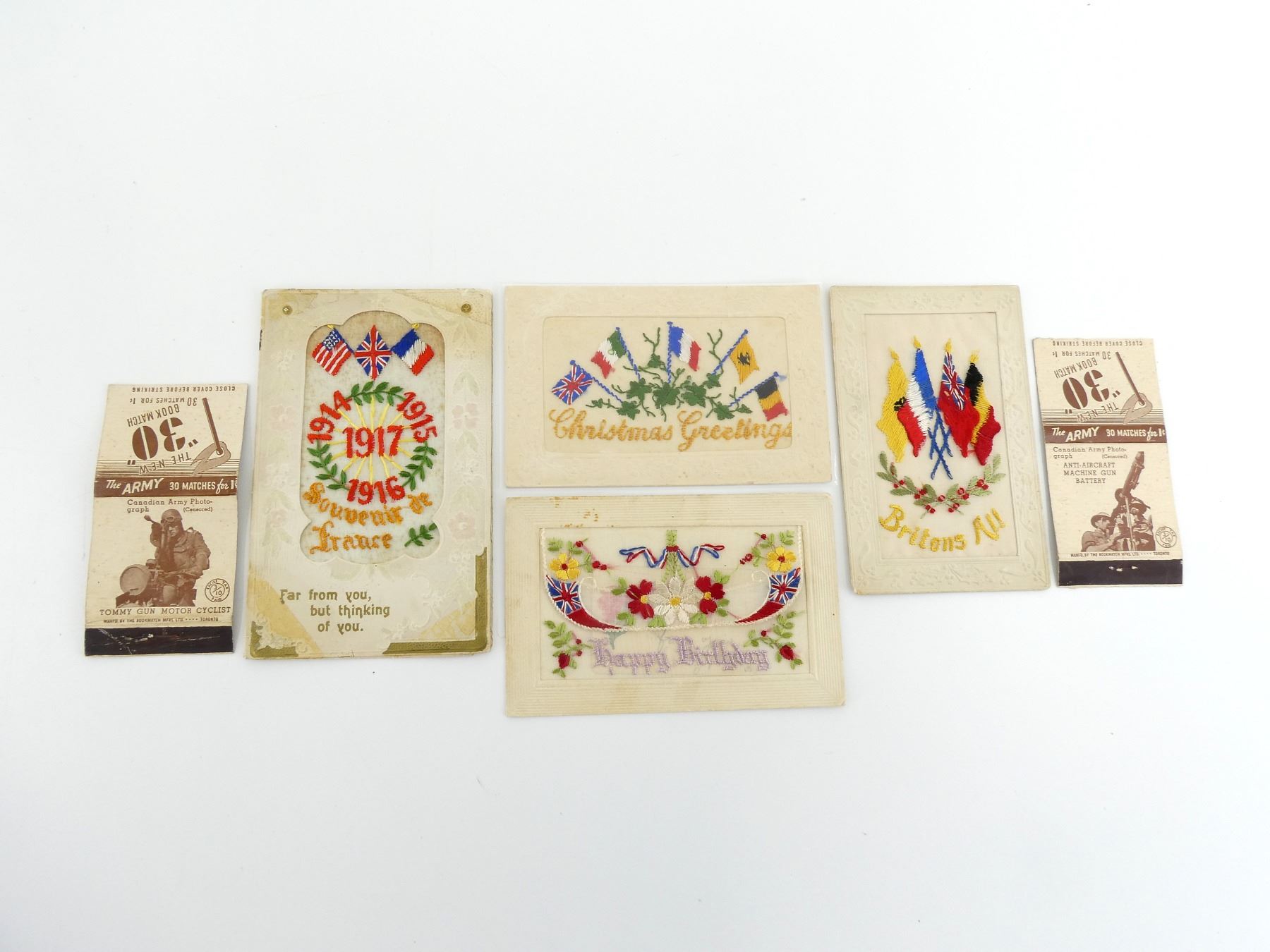 LOT INCLUDES; (2) WWII CANADIAN ARMY MATCH BOOKS, ONE FEATURES AN ANTI-AIRCRAFT MACHINE GUN, OTHER FEATURES A TOMMY GUN MOTOR CYCLIST & (4) "SWEETHEART" CARDS, DECORATIVE HAND-EMBROIDERED DESIGNS ON CARDBOARD, VARIOUS MESSAGES INSIDE / ON BACKS, COUPLE DATED 1915, 1916. SEE PHOTOS.